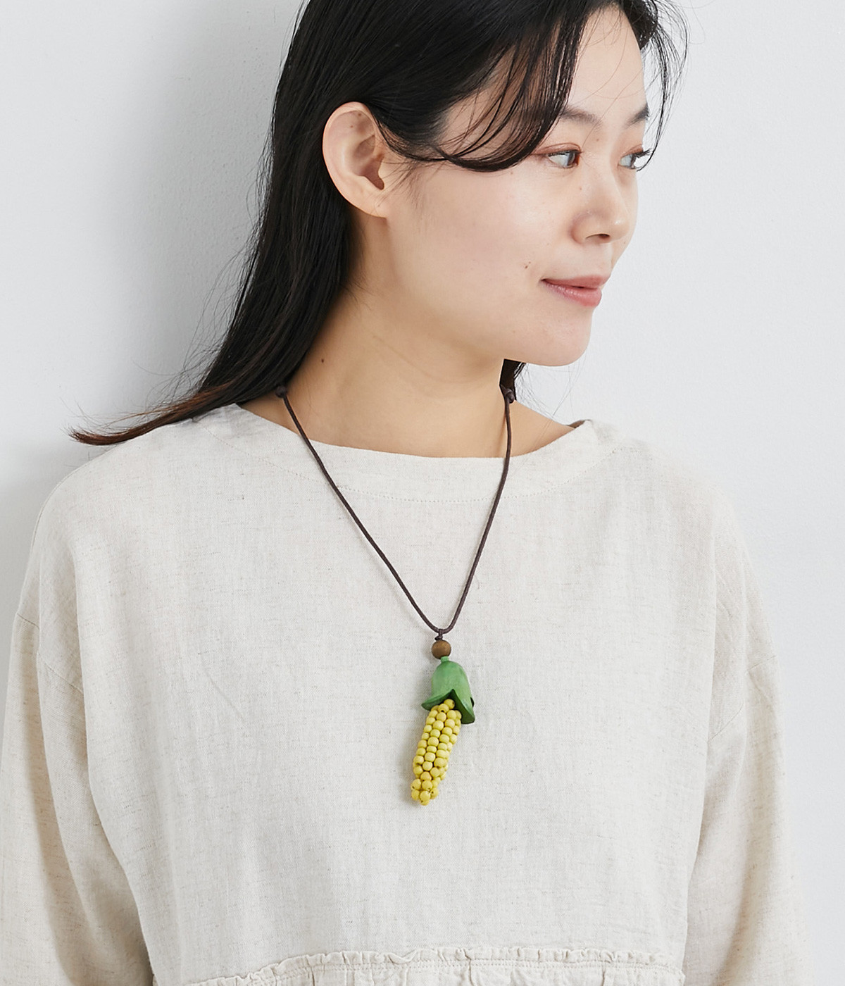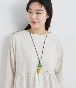 一粒一粒つなぎ合わせた繊細な作りに注目したいネックレス。ほどよく存在感があり、着こなしのアクセントとして重宝します。ひもの結び目をスライドすると長さが変わるので、お好みに合わせて自在にアレンジしていただけます。