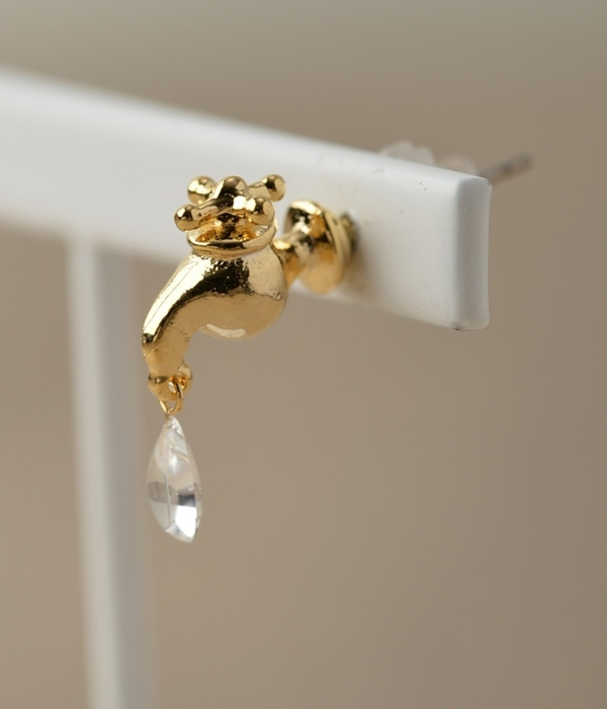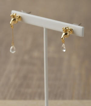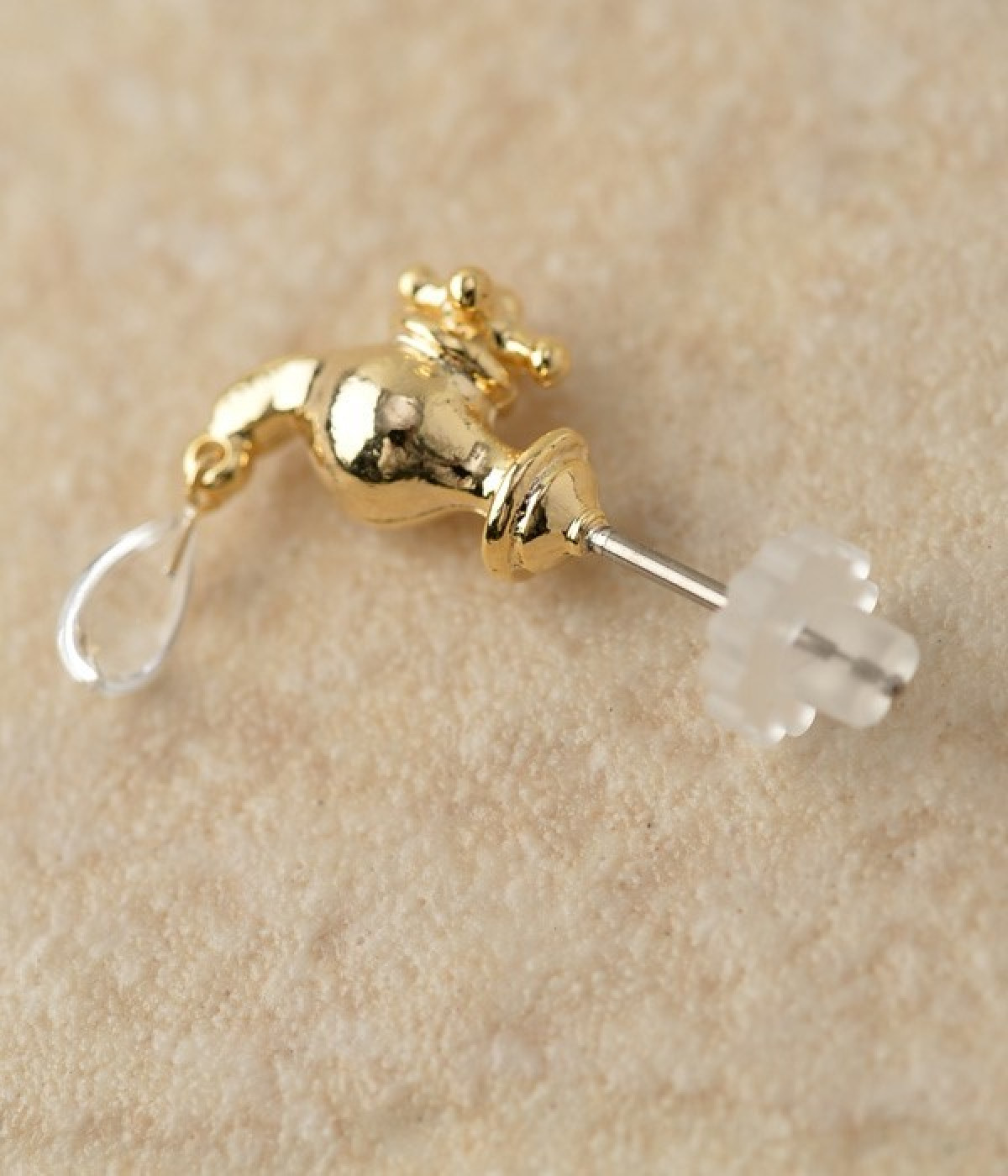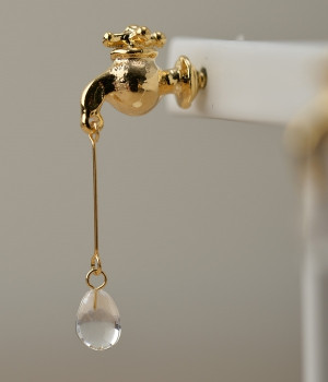 まるで本物のようなディテールにこだわった蛇口モチーフピアスです。蛇口から漏れる瑞々しい水滴はひとつひとつ手作りで、左右で違うアシンメトリーデザインの遊び心溢れるピアスです。耳元で小さく揺れる水滴モチーフはスタイリングのさりげないアクセントに。シンプルなシャツやワンピースなどに合わせるのがおすすめです。