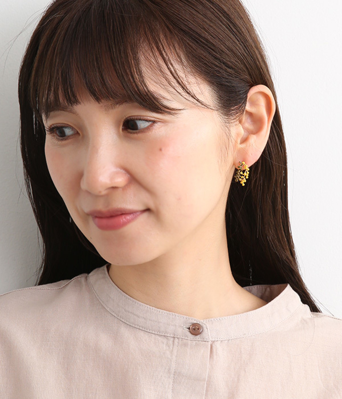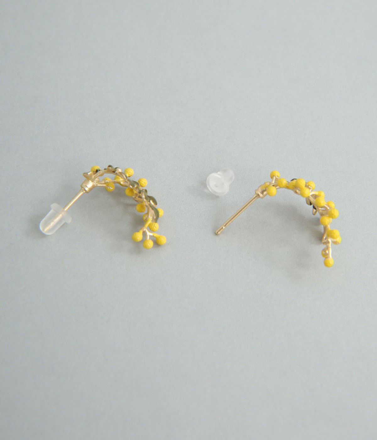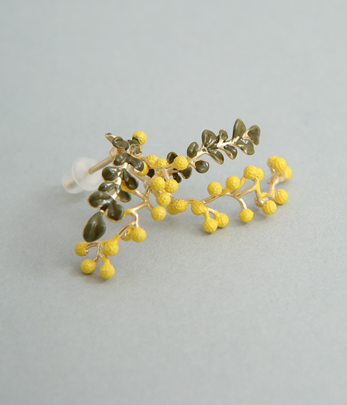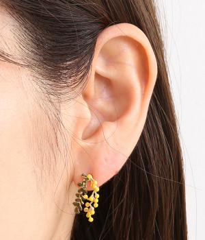 ミモザの鮮やかなカラーリングに心躍るピアスです。着用すると耳に沿うようにカーブするデザインが特徴。やわらかな材質なのでカーブを伸ばしたり、ミモザと葉っぱを重ねたり離したりと、お好みにアレンジできます。鮮やかなワンピースに合わせるもよし、シックなコーディネートのアクセントにつけるもよし。お肌にやさしいニッケルフリーメッキを使用しています。