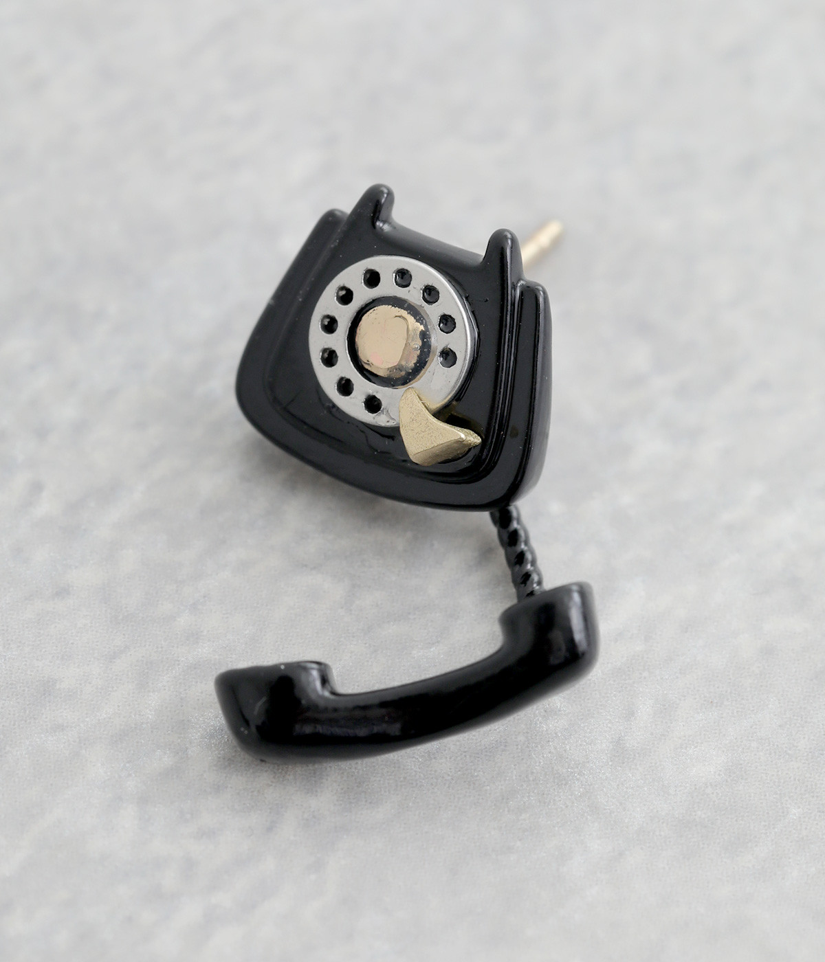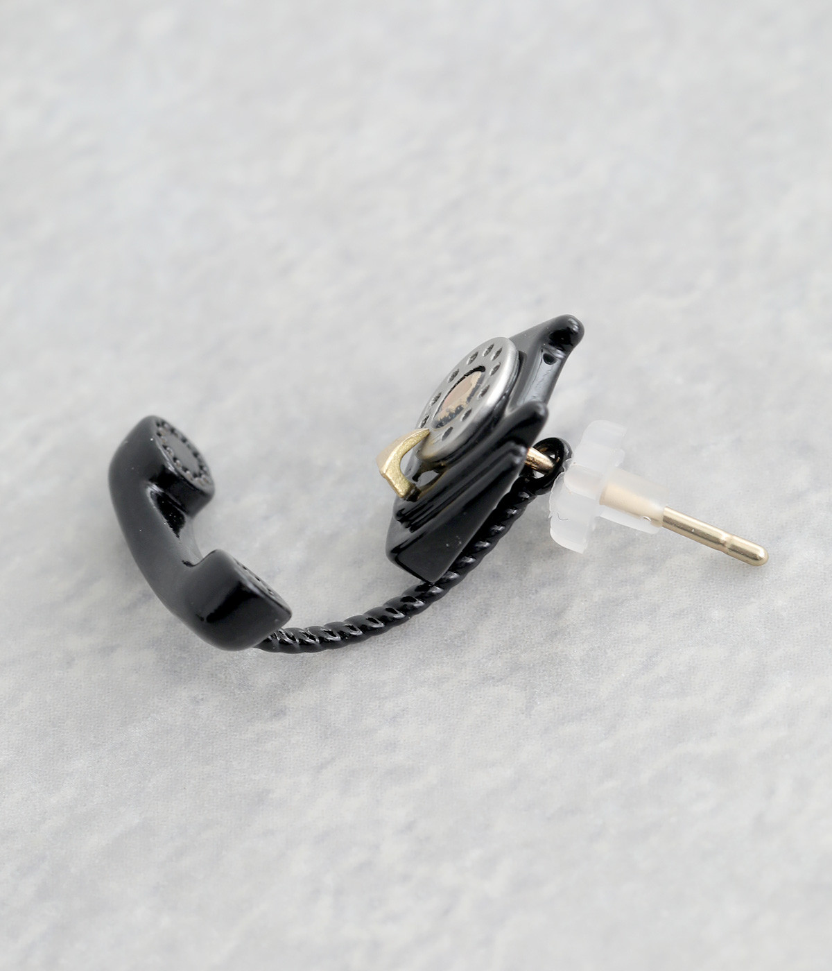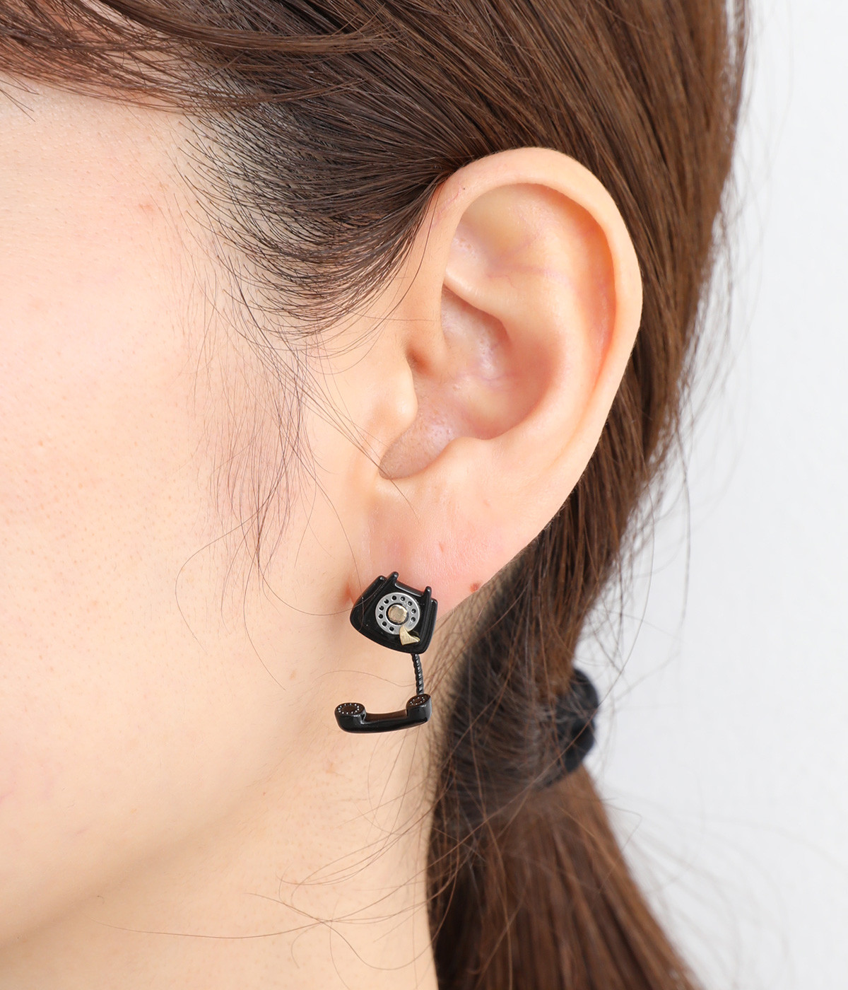 ノスタルジーあふれる黒電話をモチーフにしたピアスです。アシンメトリーなデザインで、お手持ちのピアスと自由に組み合わせて使うこともできます。ボックス入りなので、ギフトとしてもおすすめです。