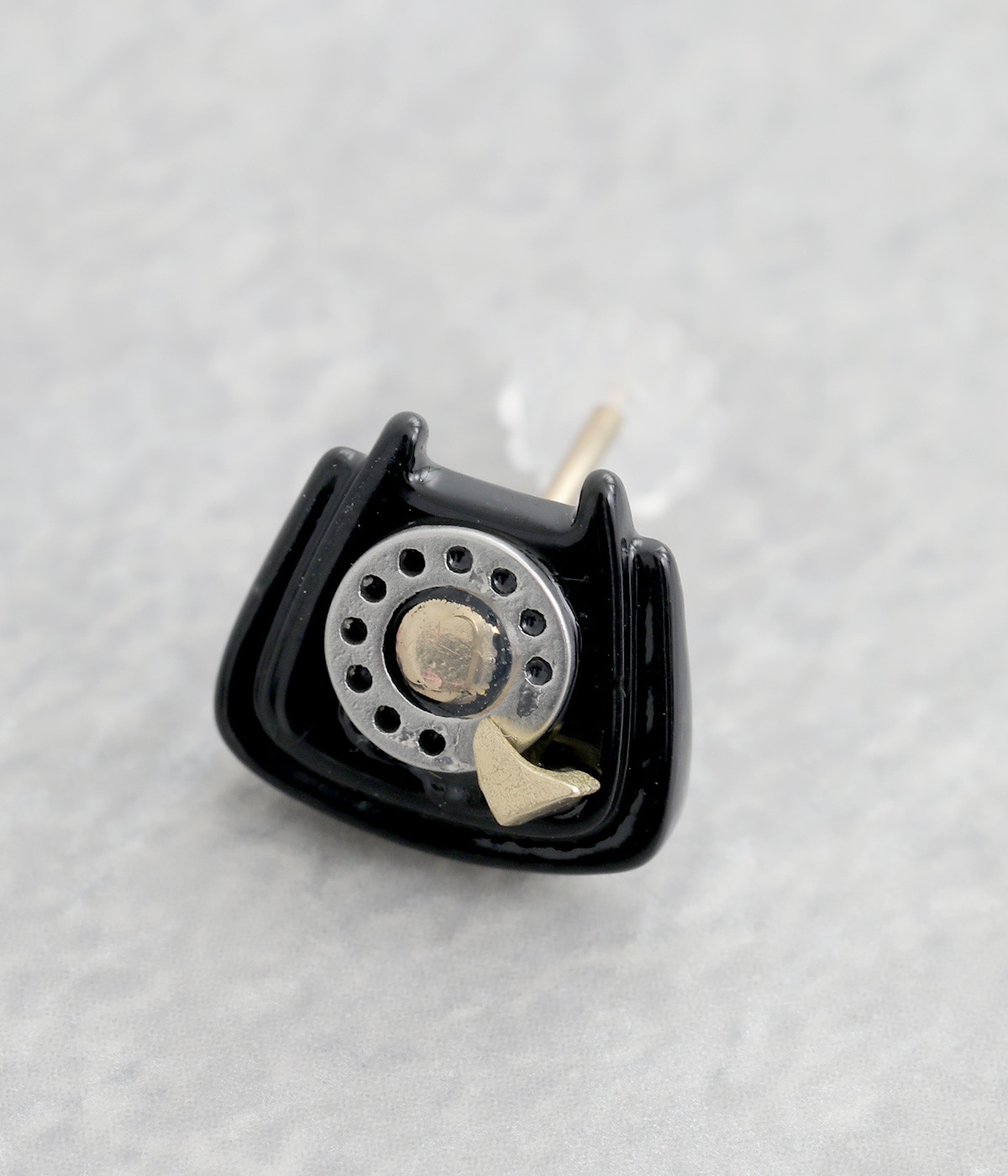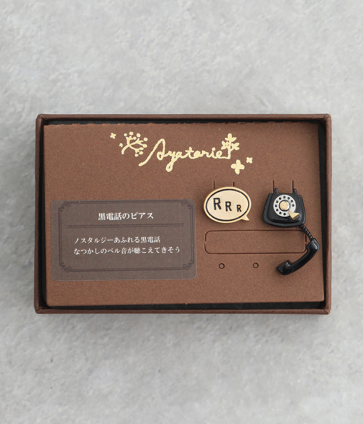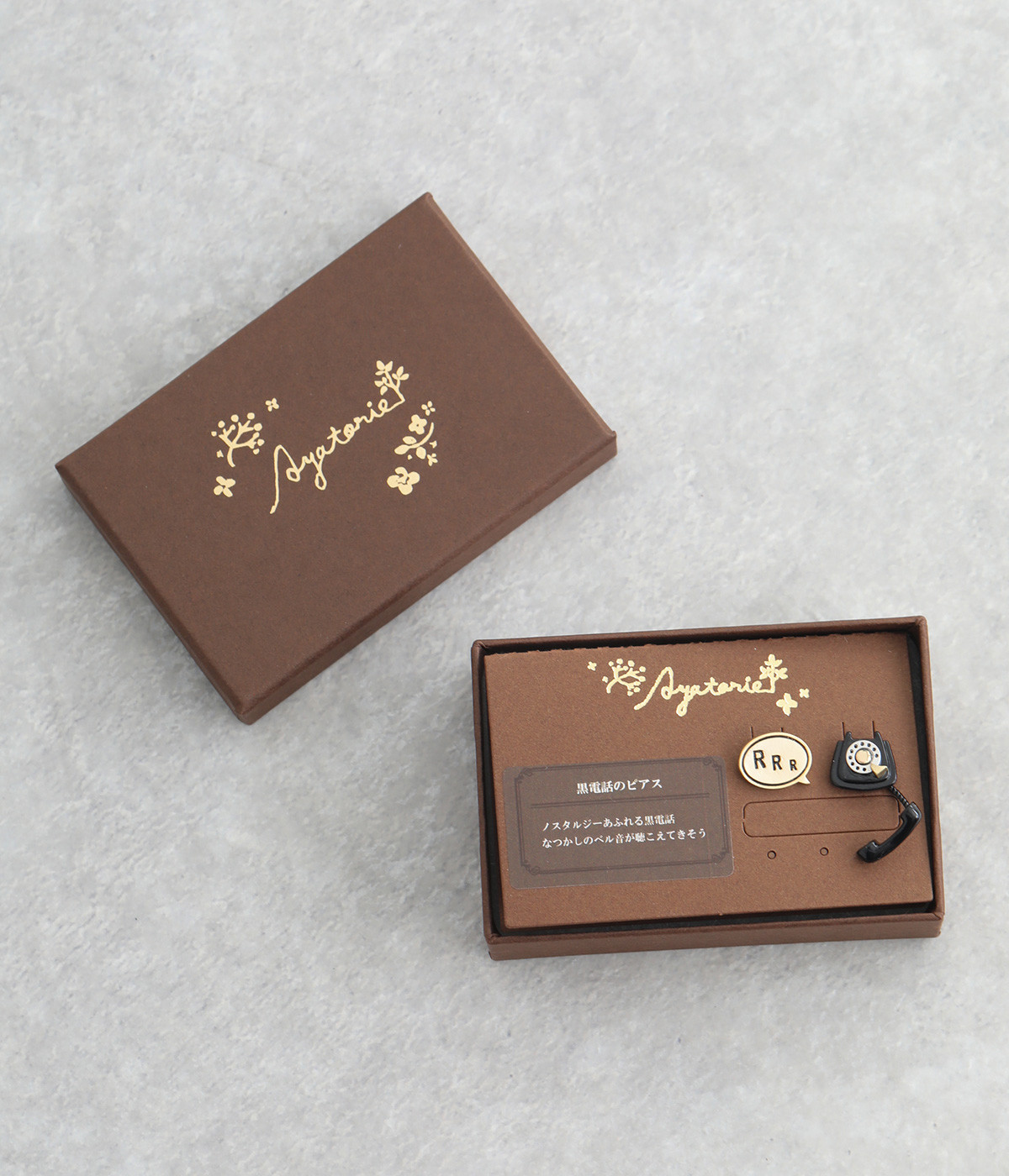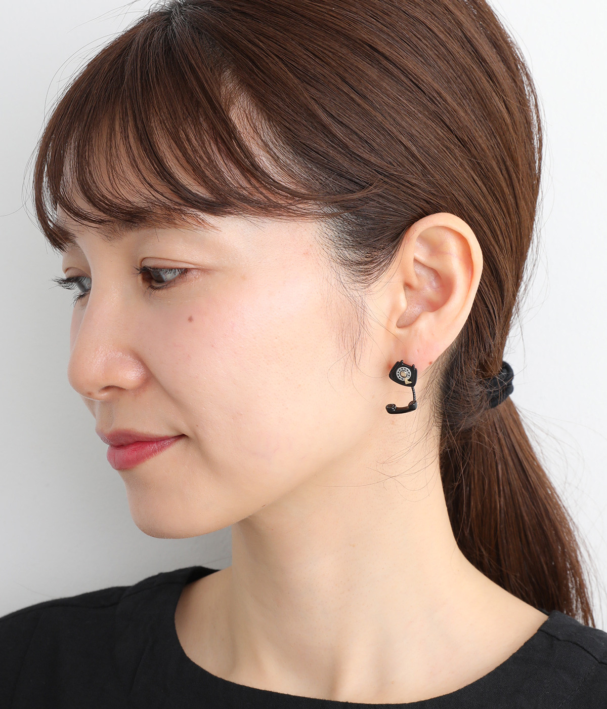 ノスタルジーあふれる黒電話をモチーフにしたピアスです。アシンメトリーなデザインで、お手持ちのピアスと自由に組み合わせて使うこともできます。ボックス入りなので、ギフトとしてもおすすめです。