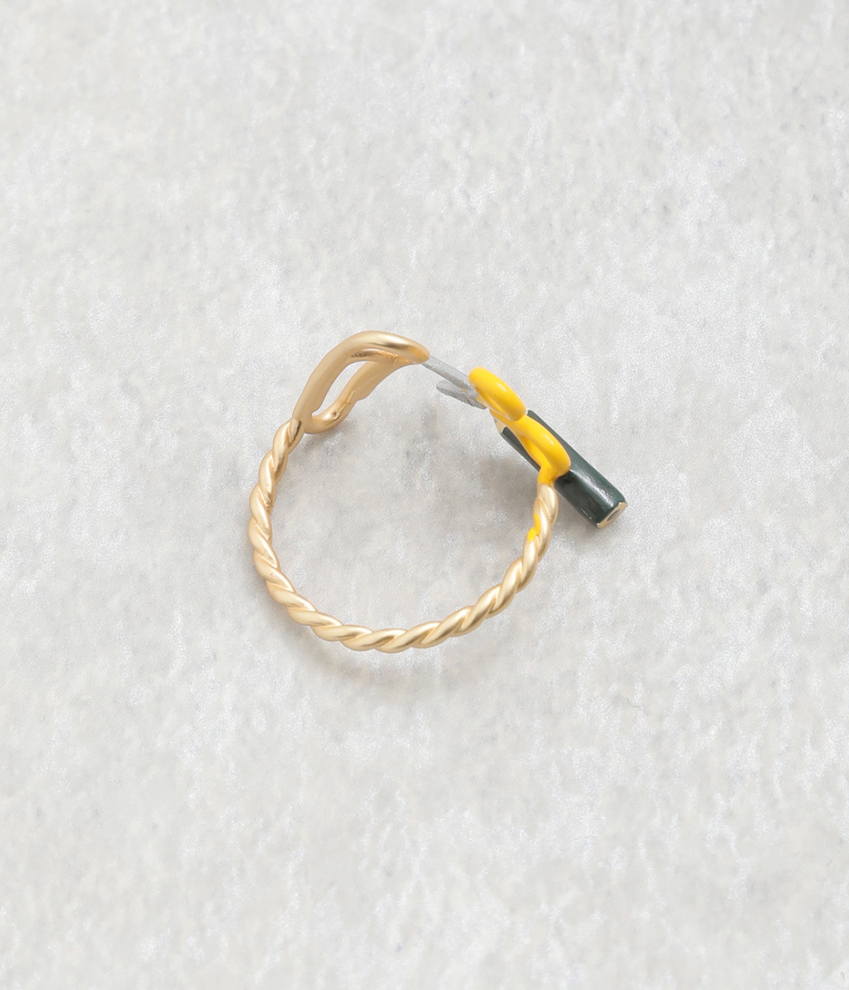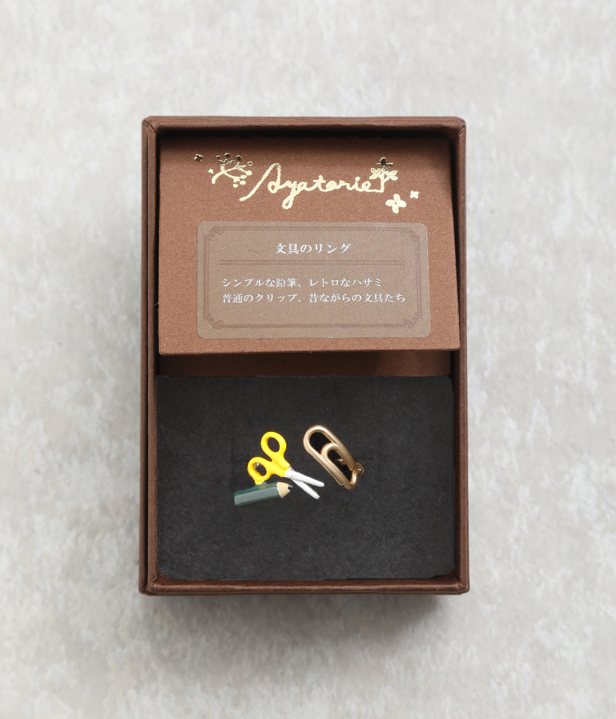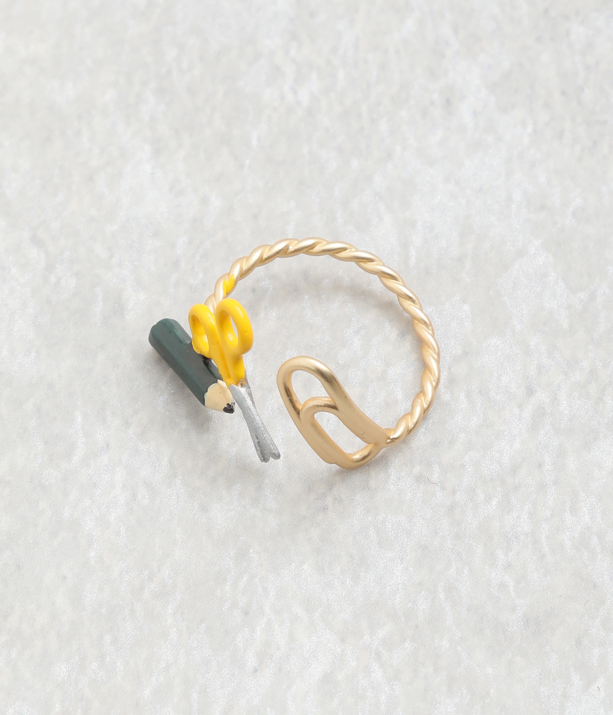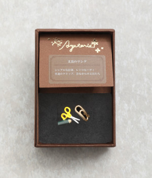 シンプルな鉛筆やレトロなハサミ、ふつうのクリップ、昔ながらの文具たちが仲良くならんだモチーフ使いが他にはないリングです。リング部分からクリップまでつながっているような、流れのいいデザインにも注目です。