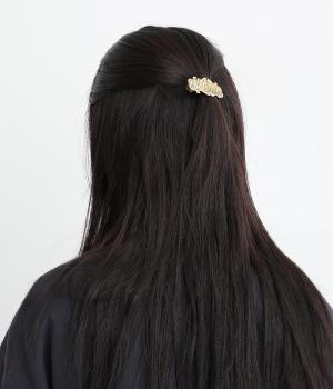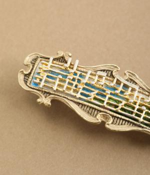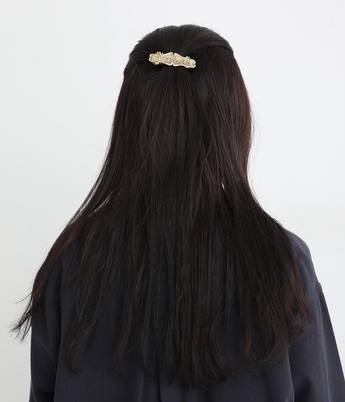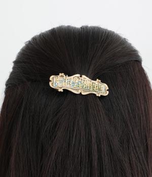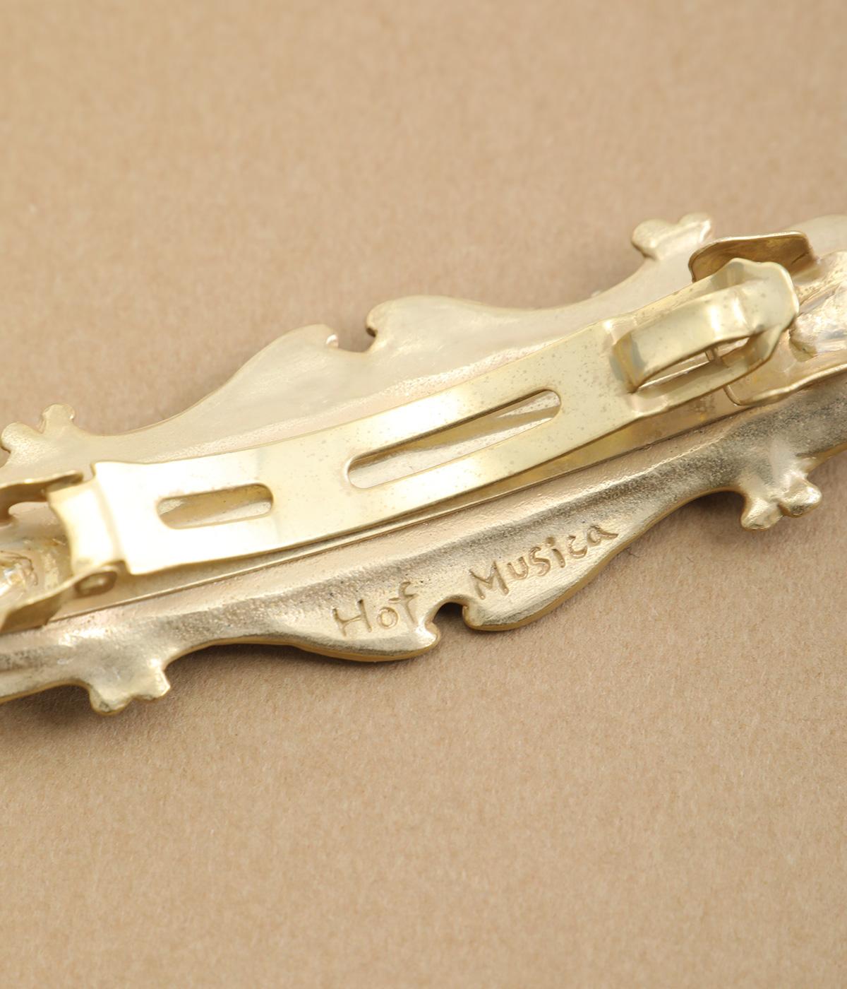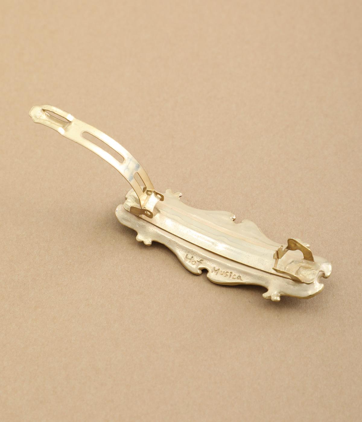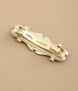 バッハの「フランス組曲 第5番 ト長調 BWV 816 ガヴォット」の楽譜をモチーフにしたバレッタです。楽譜越しにのぞく風景画には、爽やかな青空とほのかに揺れる草木を描き、のどかで優雅な情景を窓辺から眺めているかのような印象に仕上げました。
