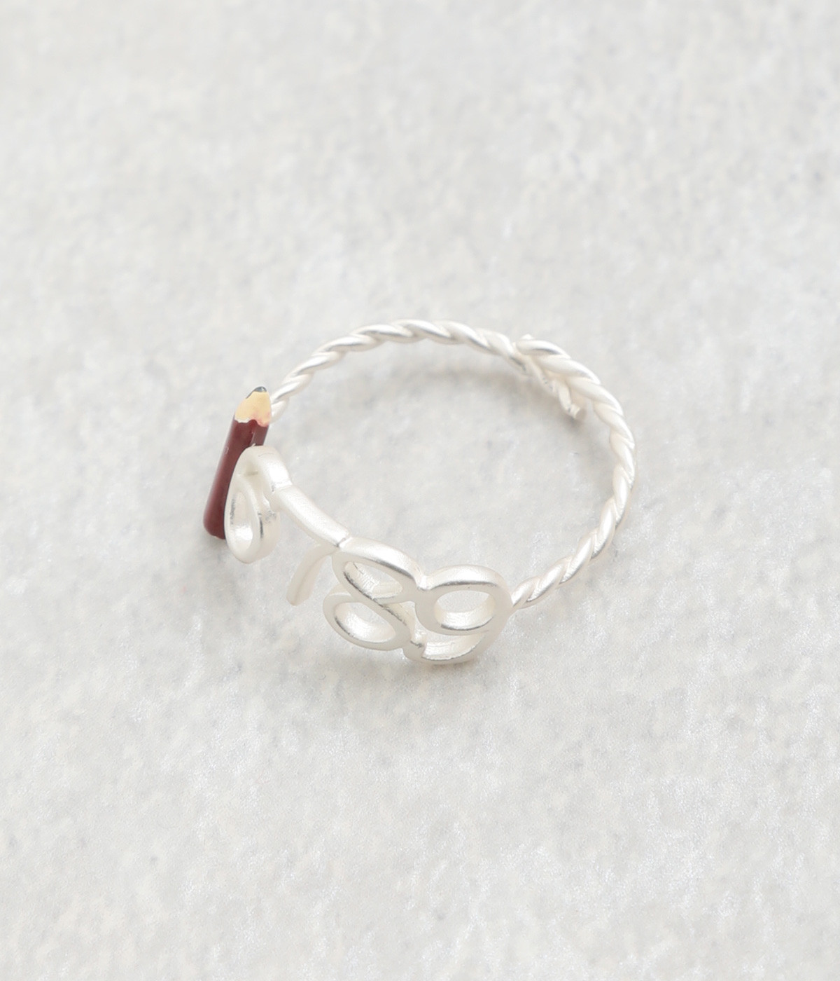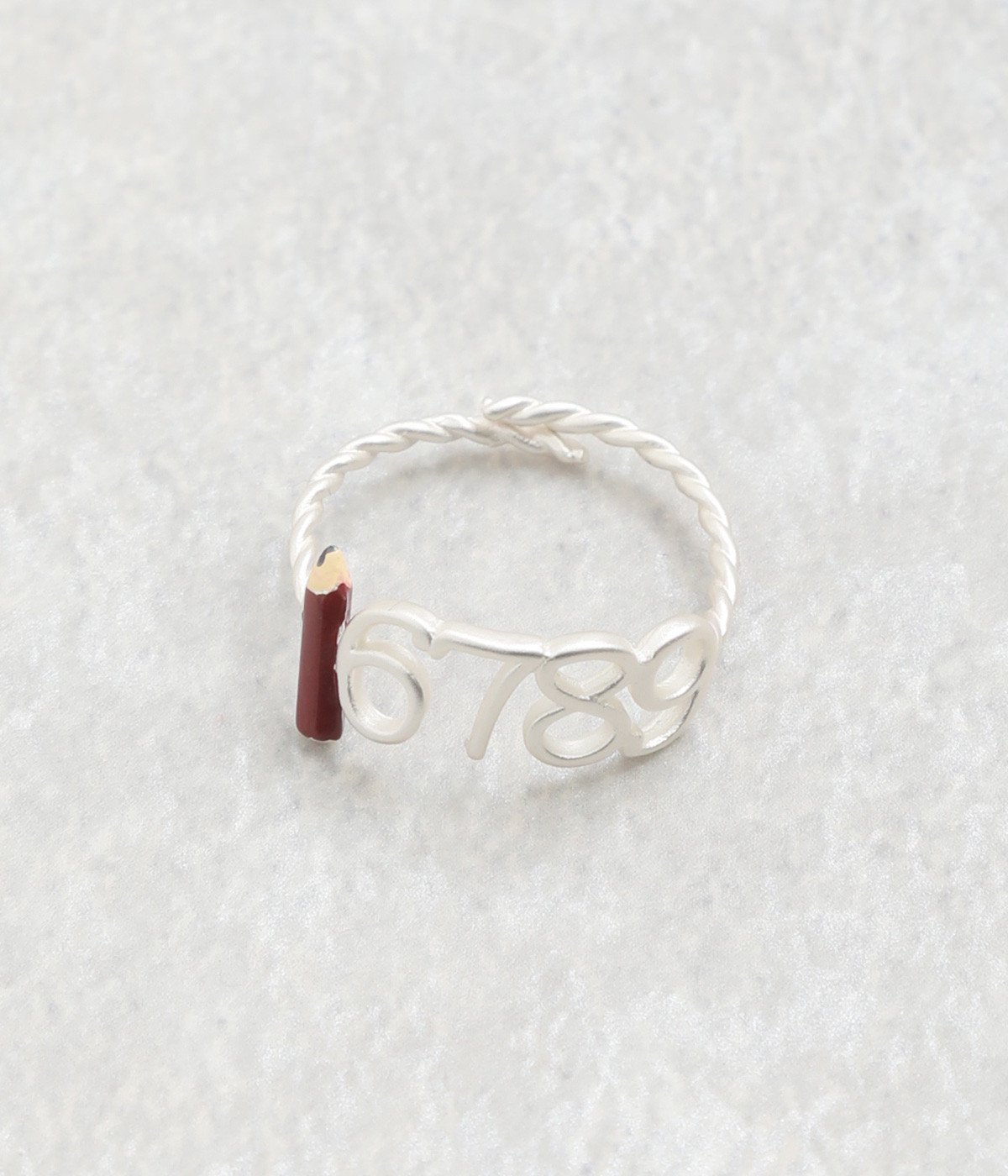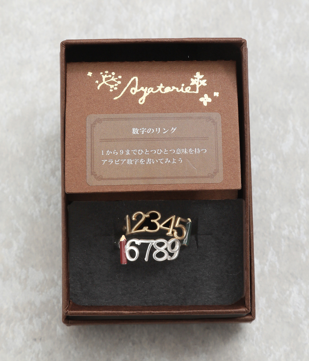 1から9までひとつひとつ意味を持つアラビア数字に、鉛筆がワンポイントになったリングです。ユニークなモチーフも控えめな輝きの真鍮に繊細なつくりで、手元になじむ仕上がりになっています。