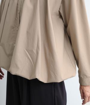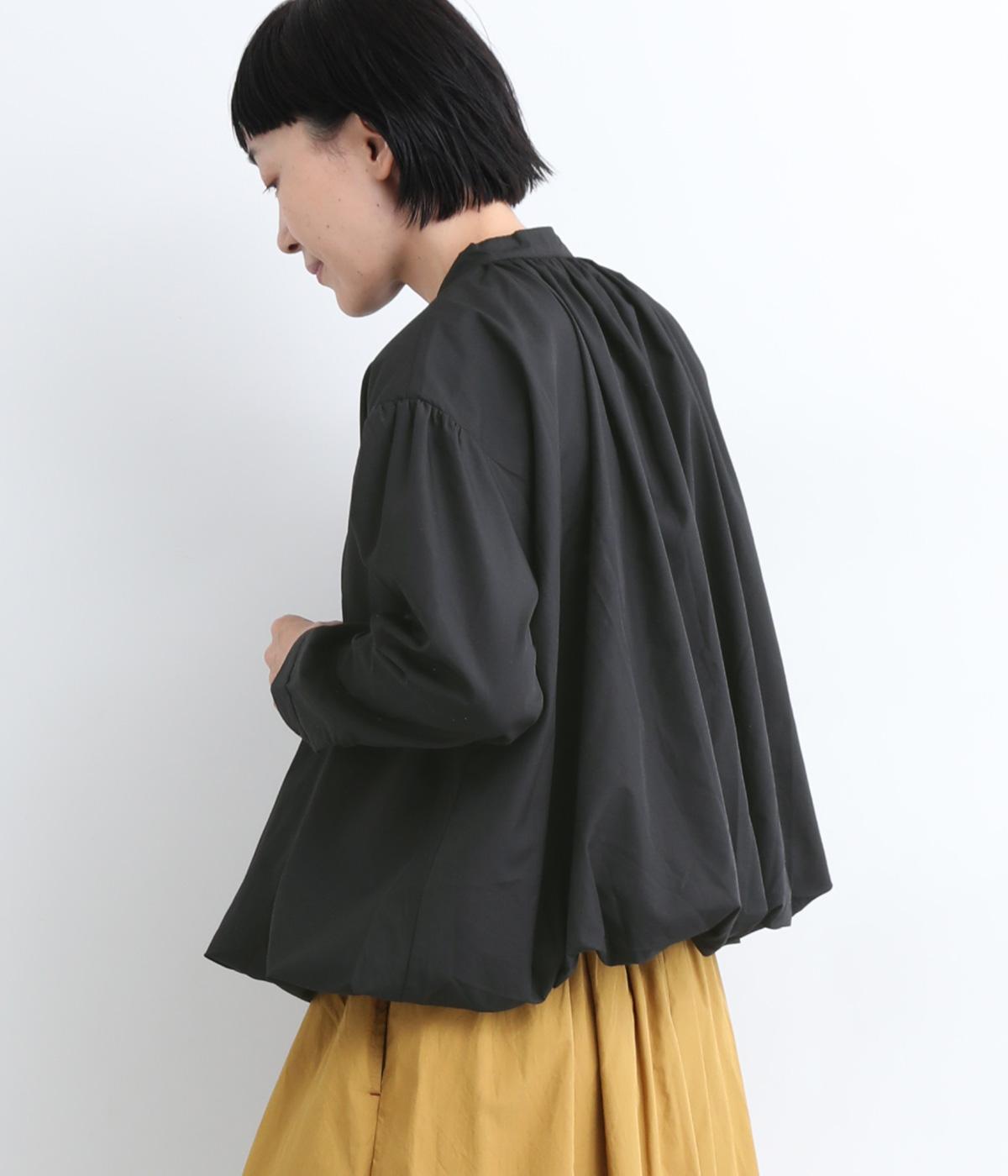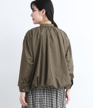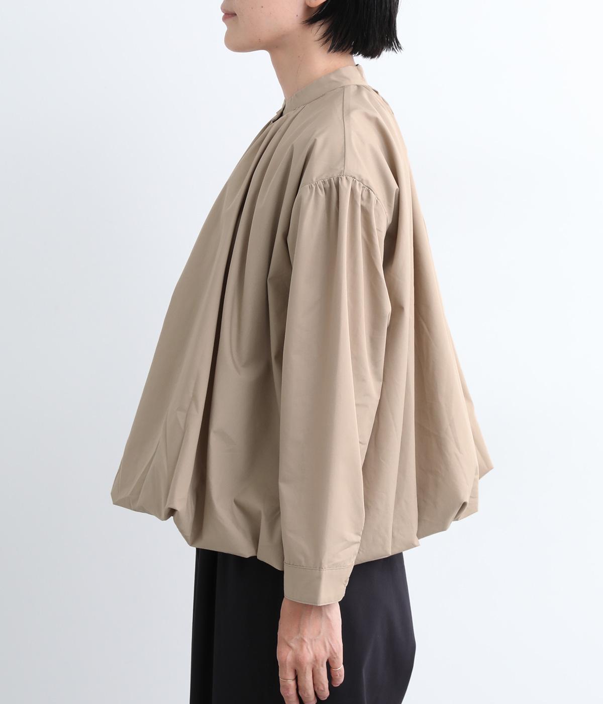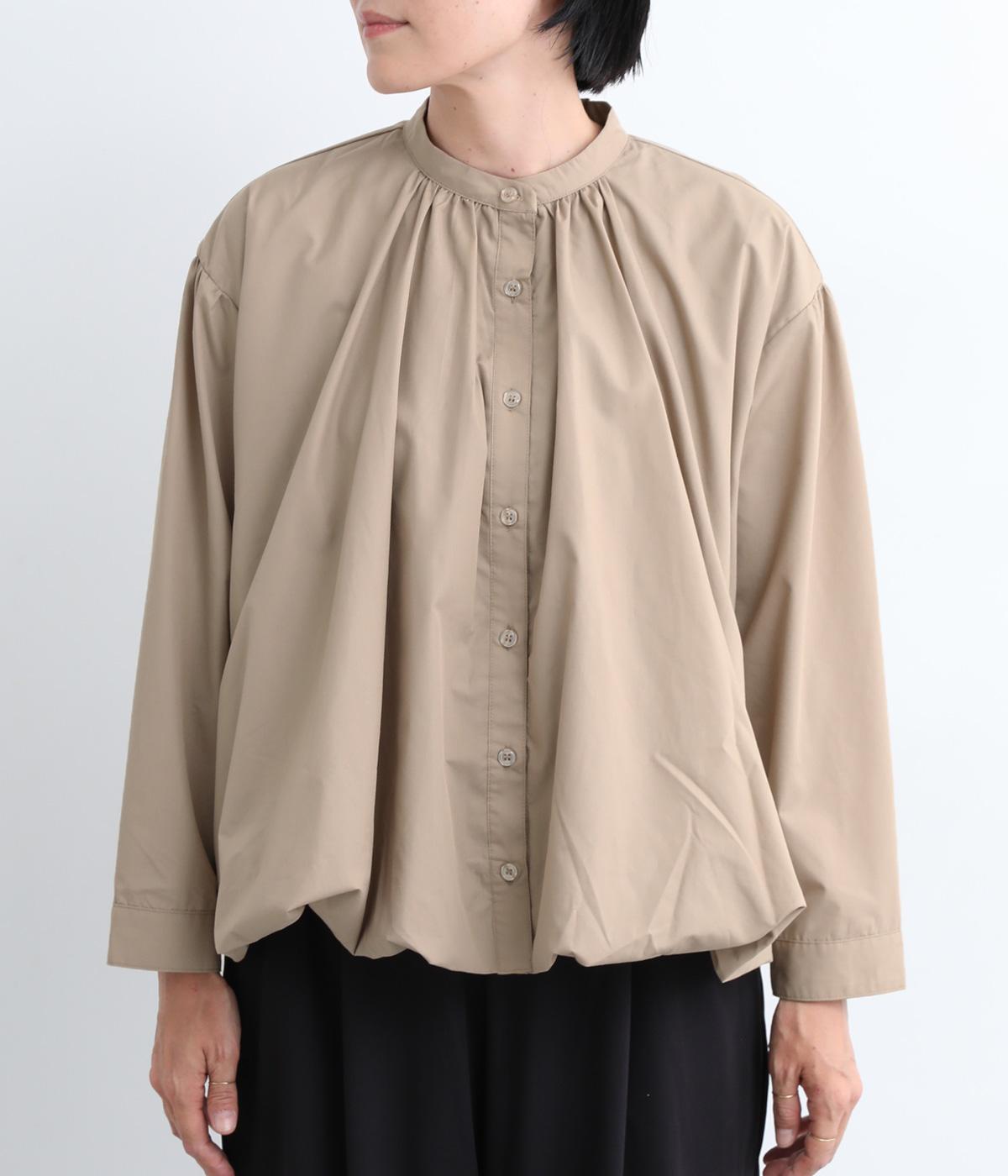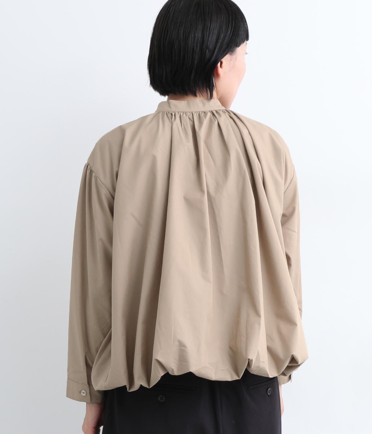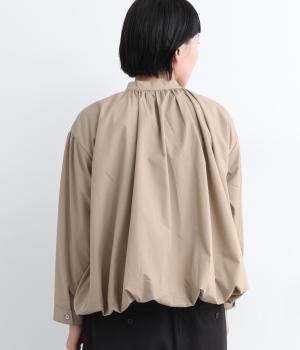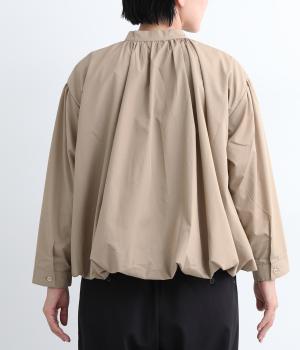 きれいめなシャツスタイルを新鮮に魅せてくれるバルーンシルエットが特徴的な一枚。襟ぐりにギャザーを寄せ、立体感とニュアンスをつけています。バンドカラーで顔まわりはすっきりと。袖は裏地がついていないのでラフに折り返しても◎。