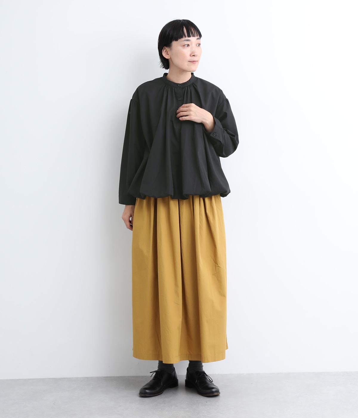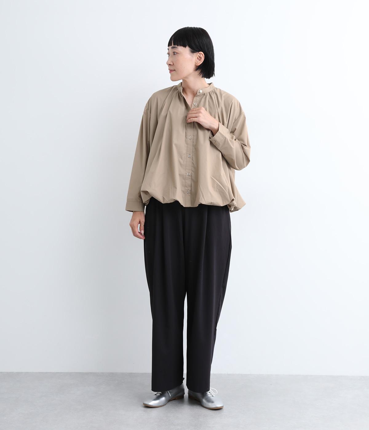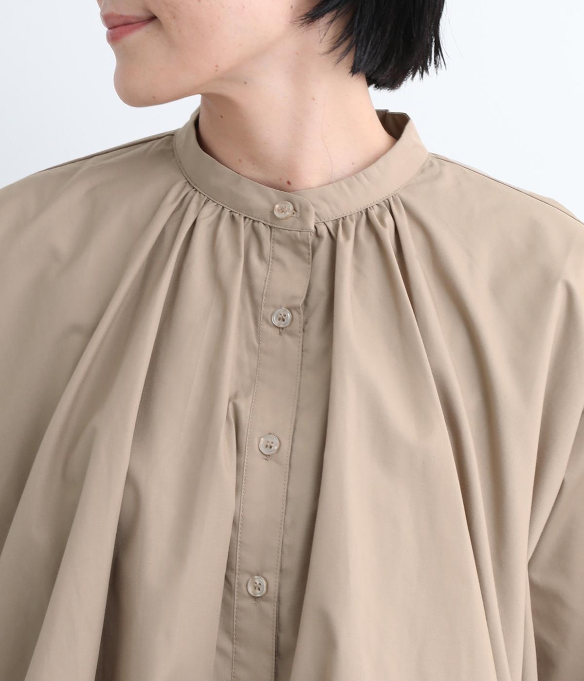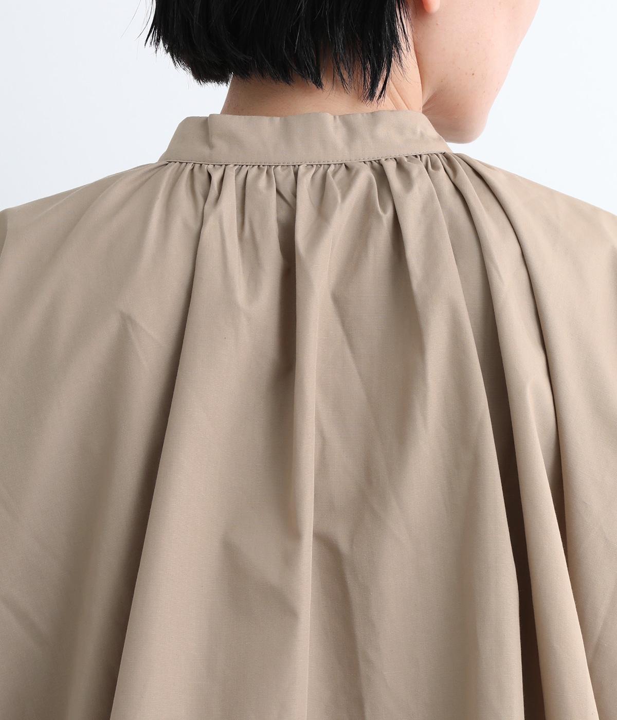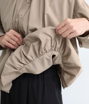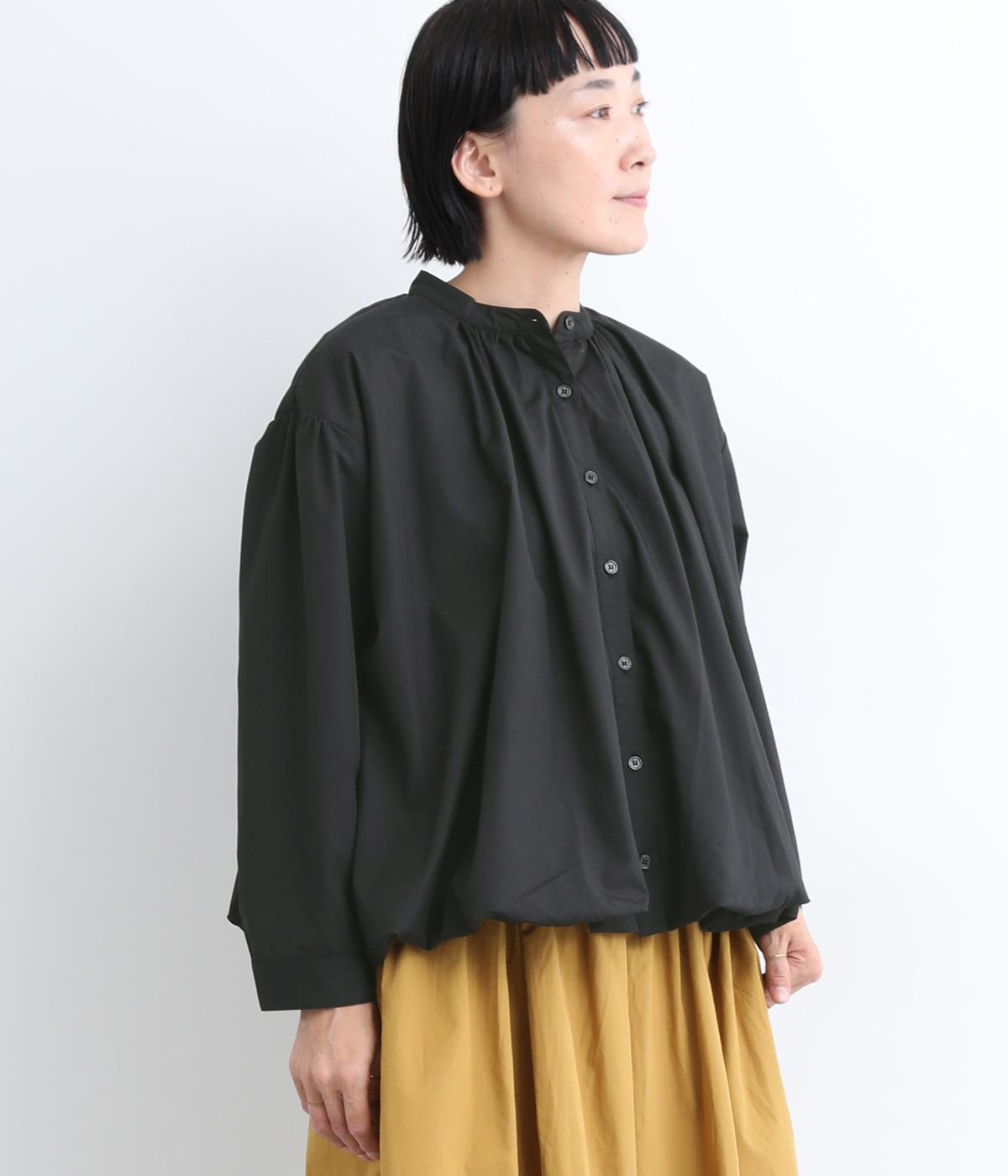 きれいめなシャツスタイルを新鮮に魅せてくれるバルーンシルエットが特徴的な一枚。襟ぐりにギャザーを寄せ、立体感とニュアンスをつけています。バンドカラーで顔まわりはすっきりと。袖は裏地がついていないのでラフに折り返しても◎。