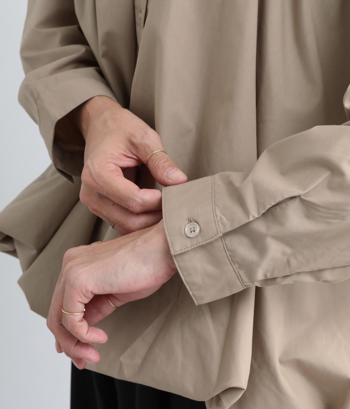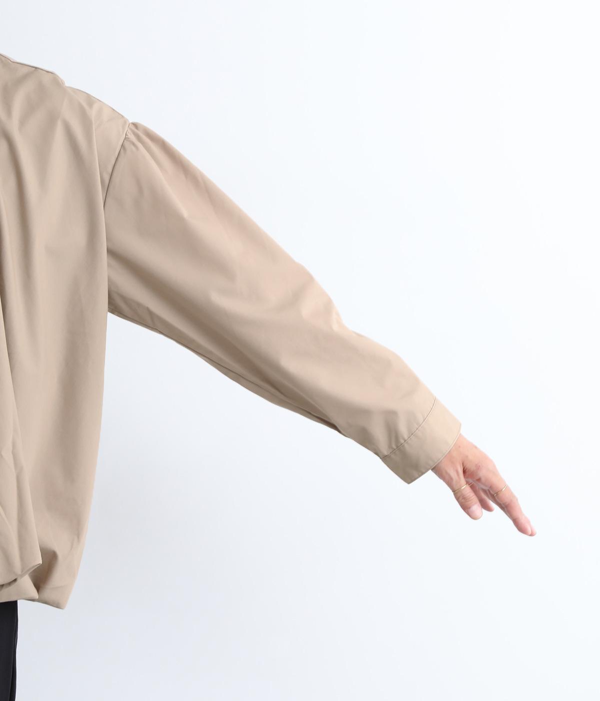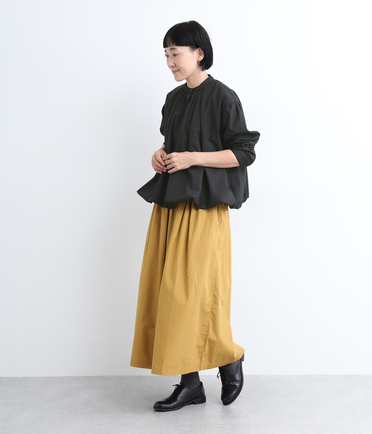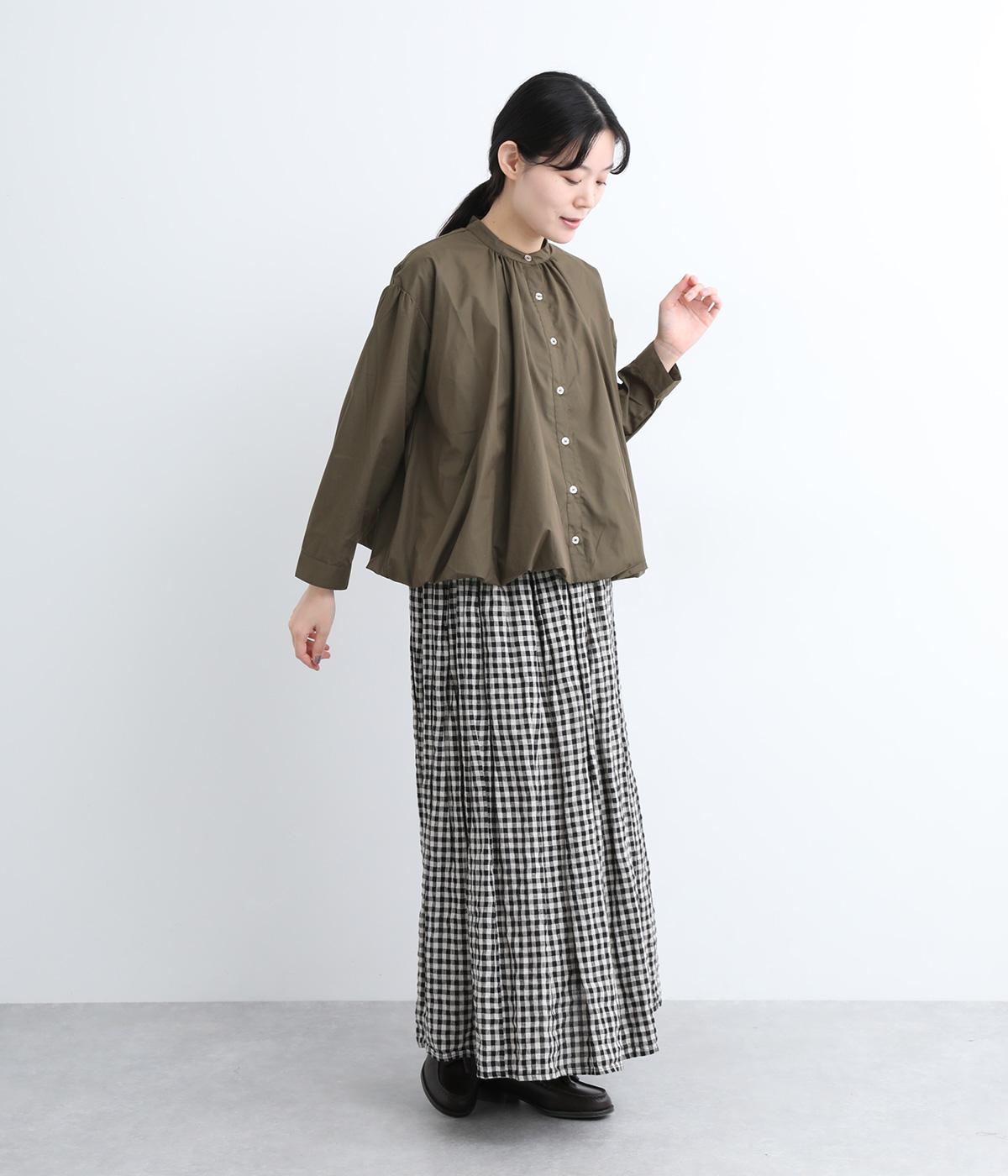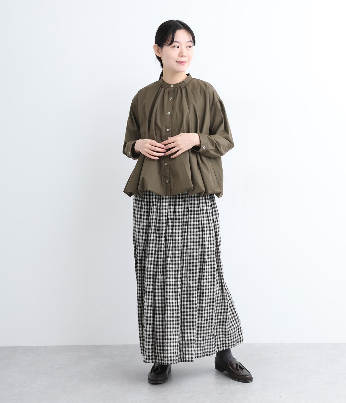 きれいめなシャツスタイルを新鮮に魅せてくれるバルーンシルエットが特徴的な一枚。襟ぐりにギャザーを寄せ、立体感とニュアンスをつけています。バンドカラーで顔まわりはすっきりと。袖は裏地がついていないのでラフに折り返しても◎。