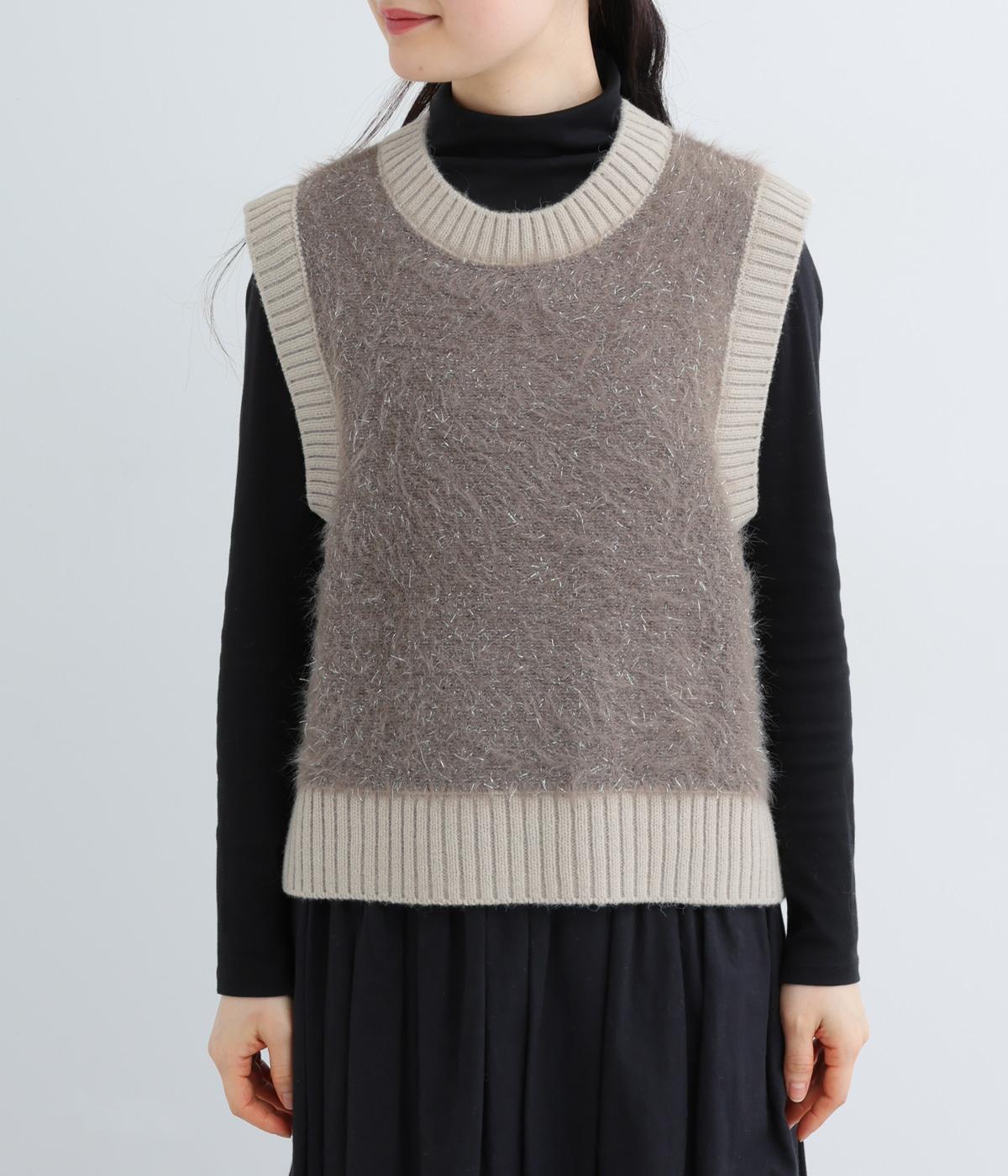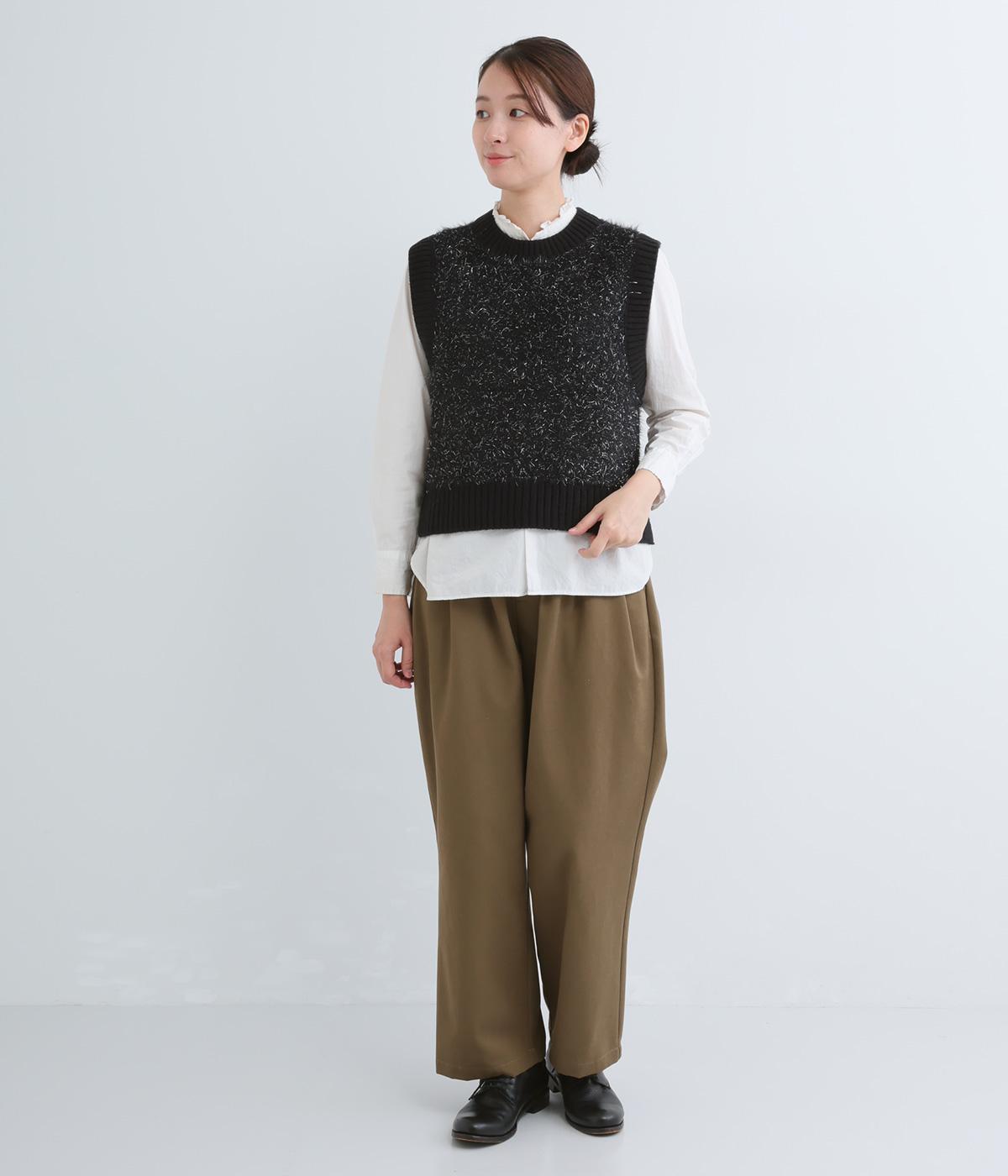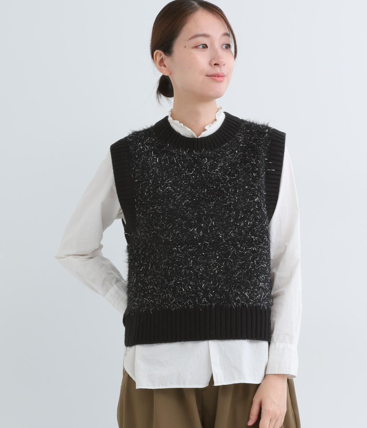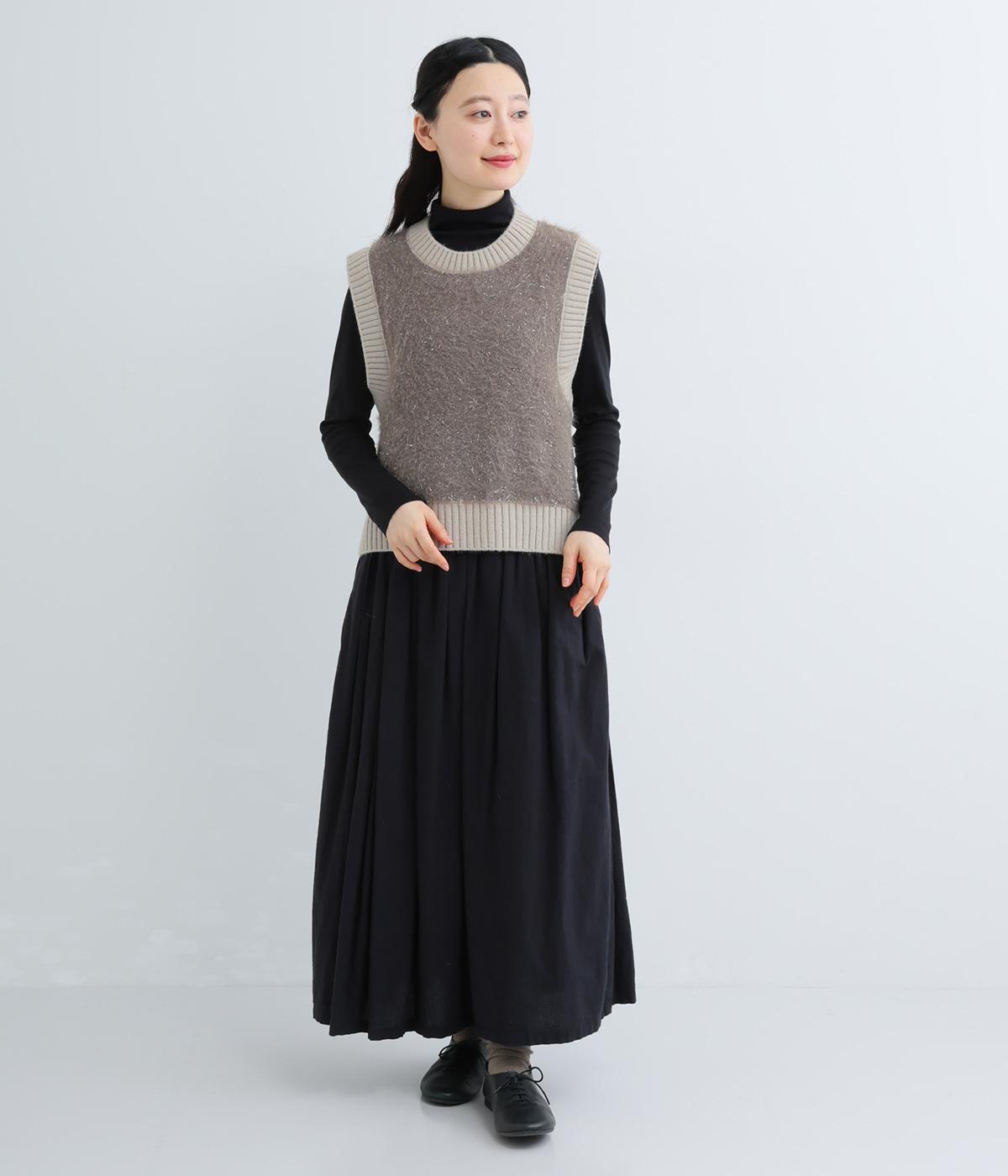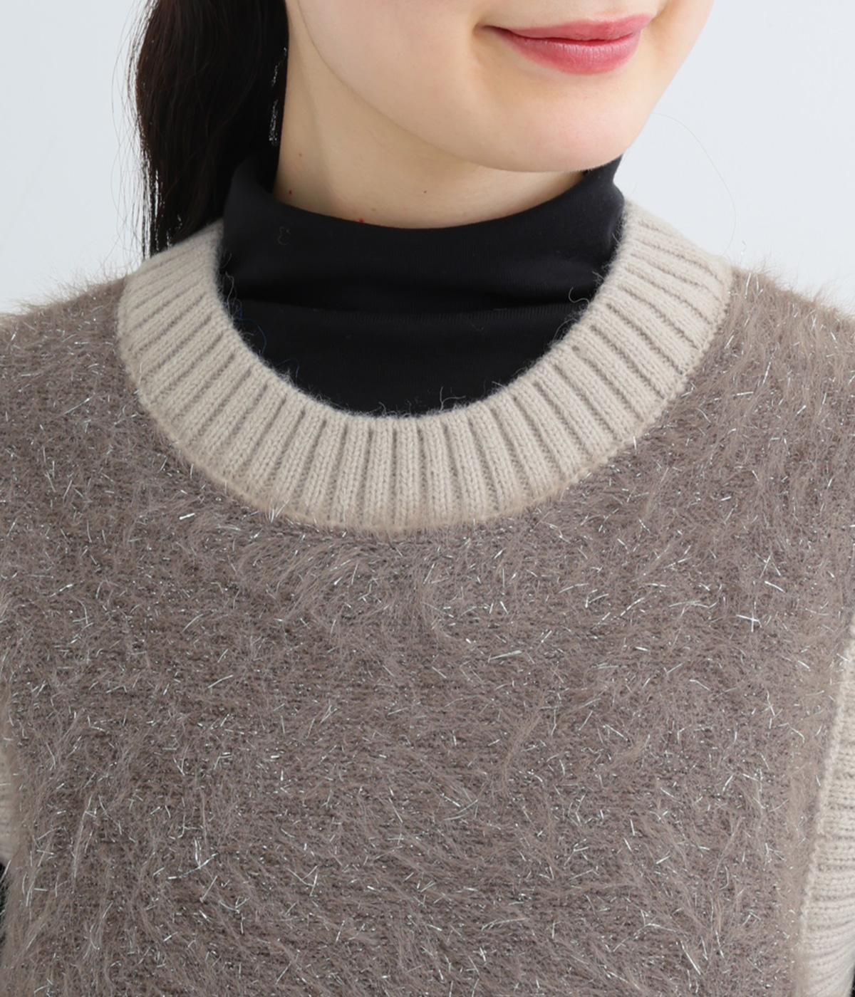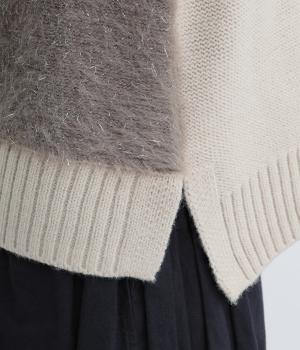 見た目にもあたたかなフェザーヤーンはところどころラメが光り、装いに上品な華やかさを添えます。伸縮性のある素材感やサイドスリットで、インナーと重ねやすい仕上がりです。ほどよい丈感でボトムスを選ばず、さまざまなスタイリングになじみます。
