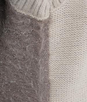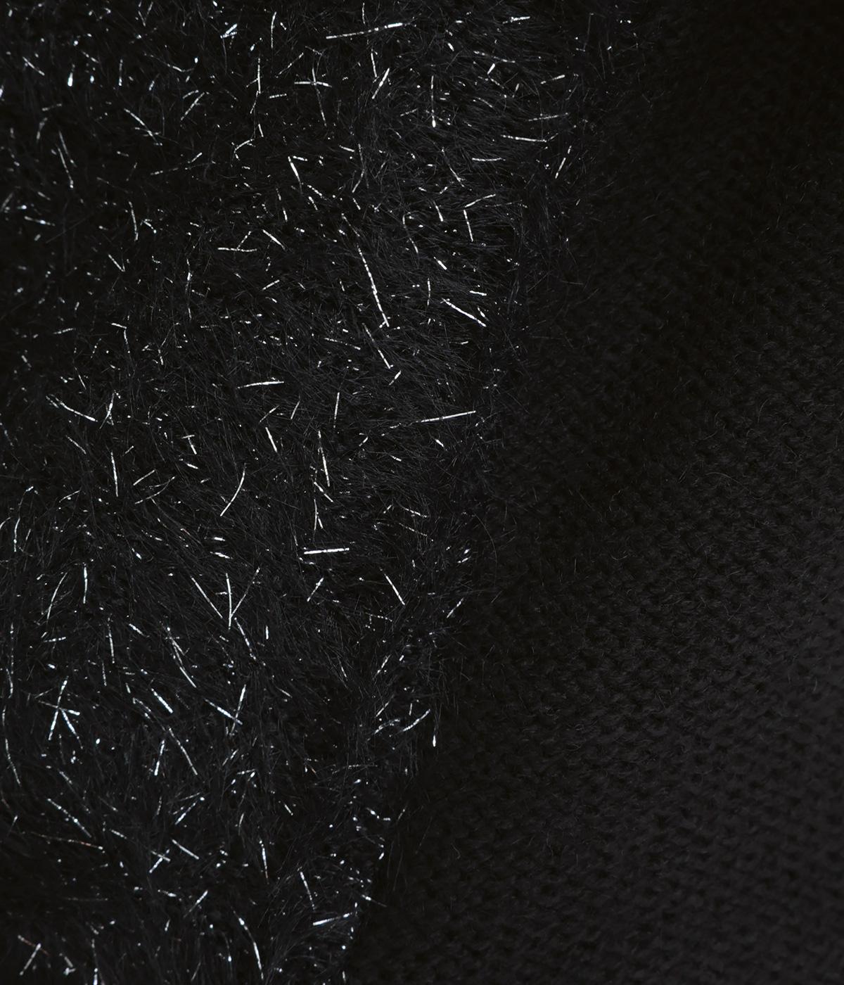 空気をふくんでふっくらとやわらかく、伸縮性に富んだ混紡生地に、前身頃にラメ糸をミックスしたフェザーヤーンを編み込みました。しっとりとやわらかな肌ざわりで心地よくフィットします。