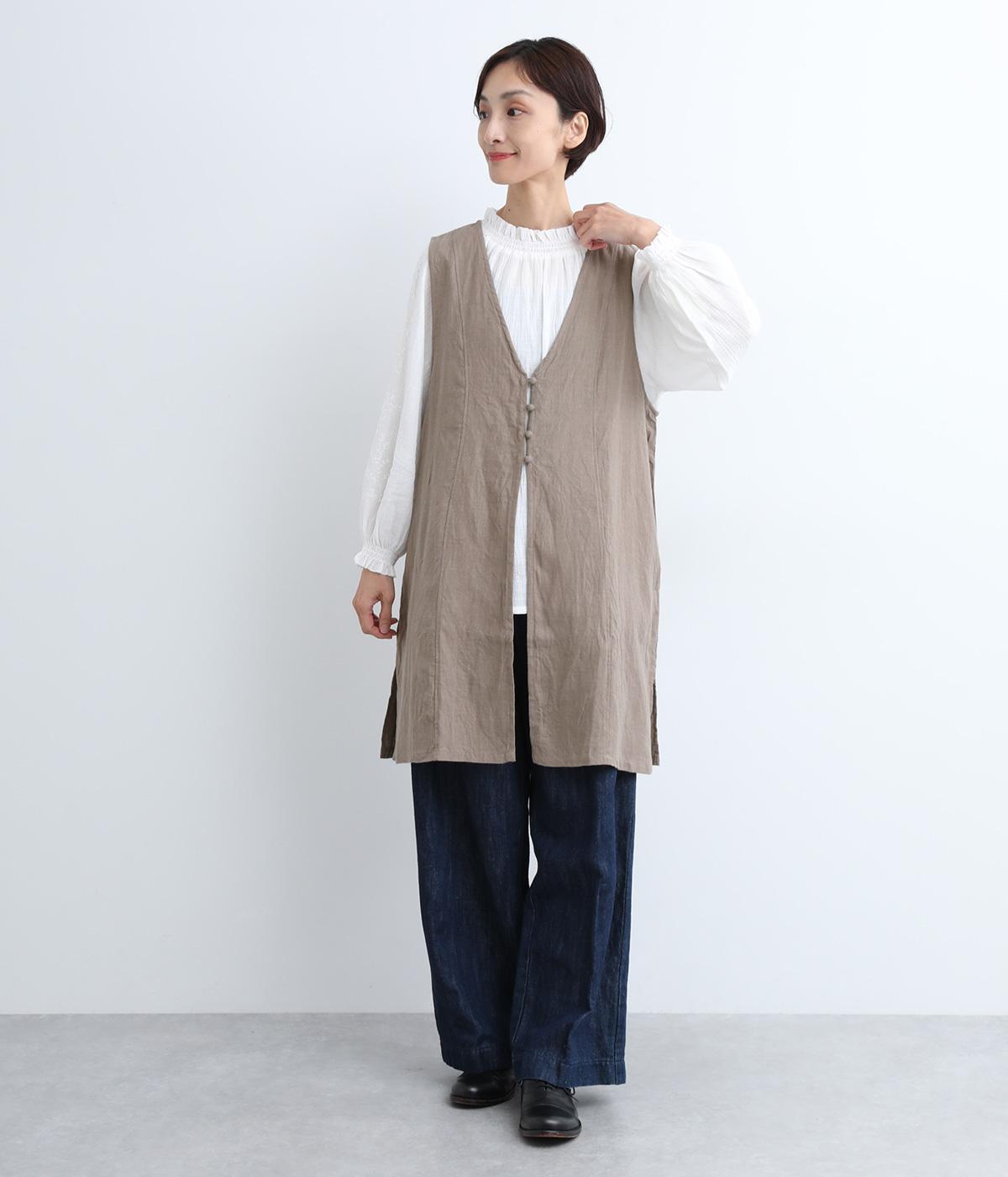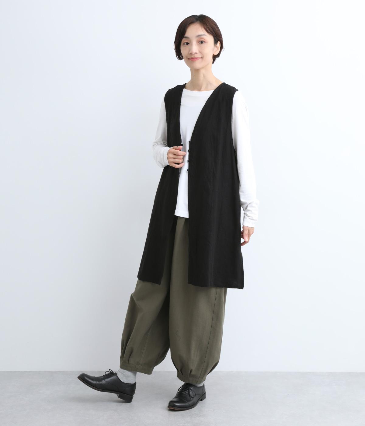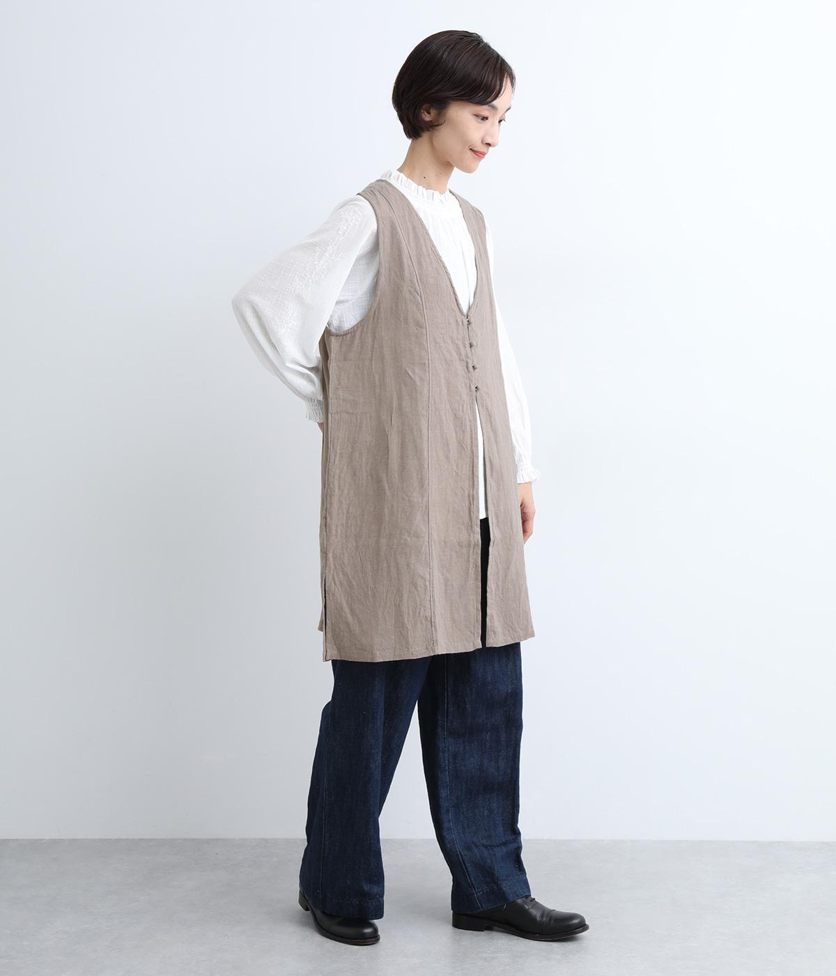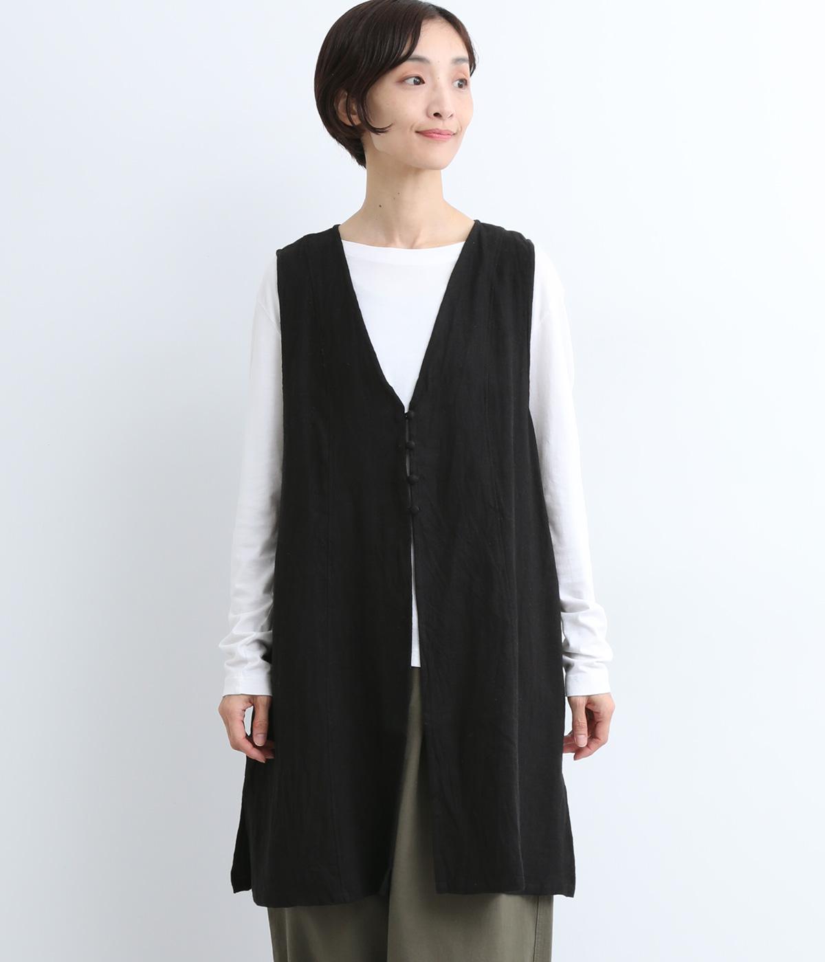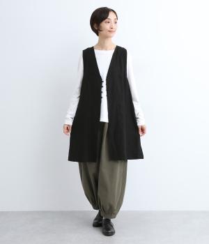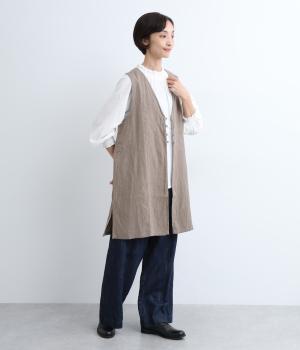 スタイリングに動きをつけてくれるロングジレです。くるみボタンが控えめながらもデザインポイントになっています。襟ぐりや袖まわりの開きも広く、サイドスリット入りでワンピースなどボリュームのあるアイテム合わせもすっきりまとまります。