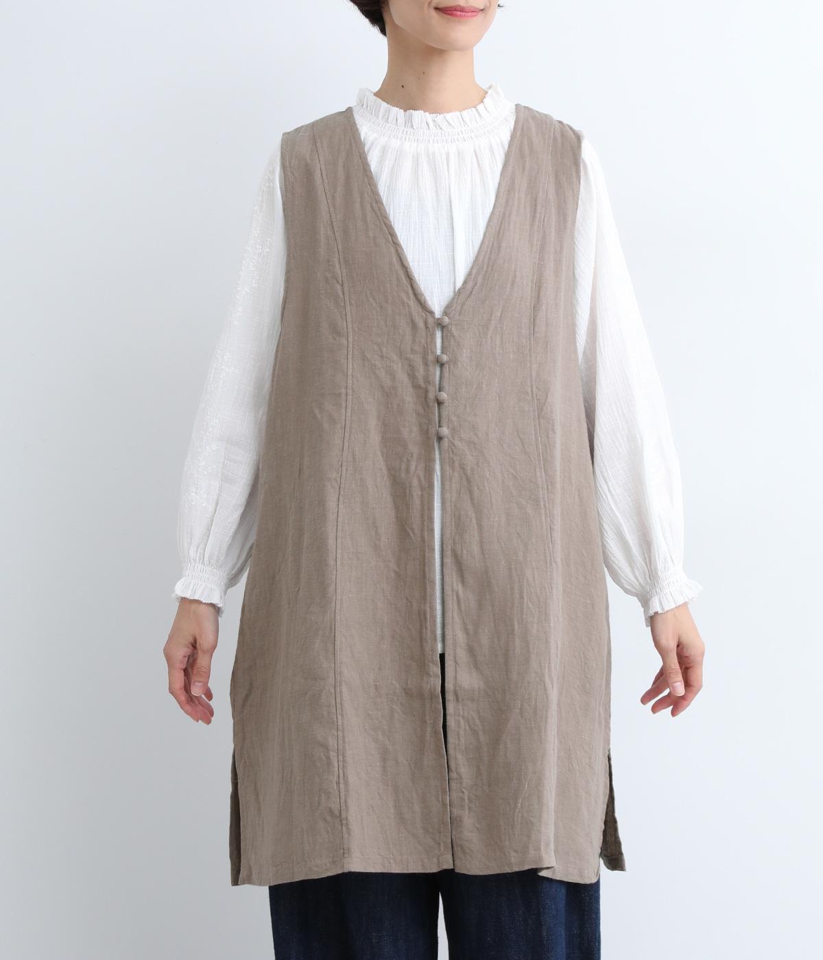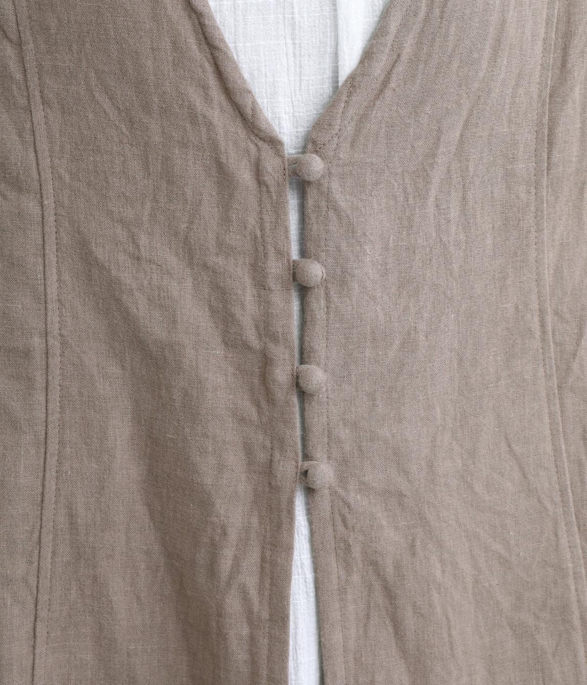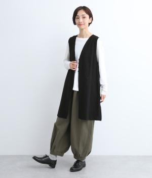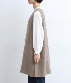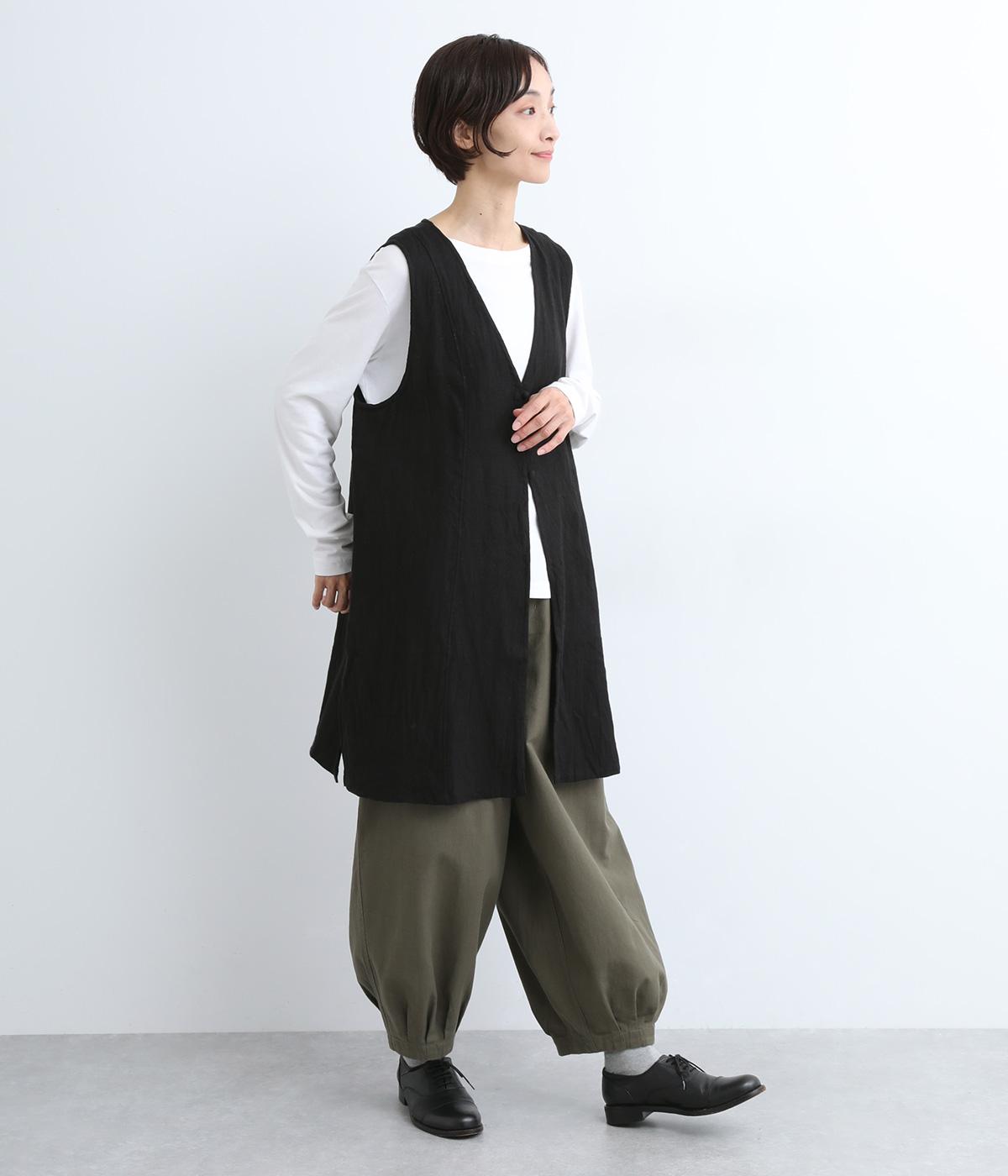 スタイリングに動きをつけてくれるロングジレです。くるみボタンが控えめながらもデザインポイントになっています。襟ぐりや袖まわりの開きも広く、サイドスリット入りでワンピースなどボリュームのあるアイテム合わせもすっきりまとまります。