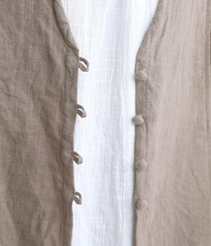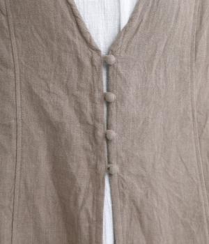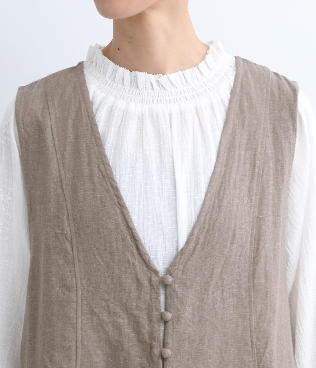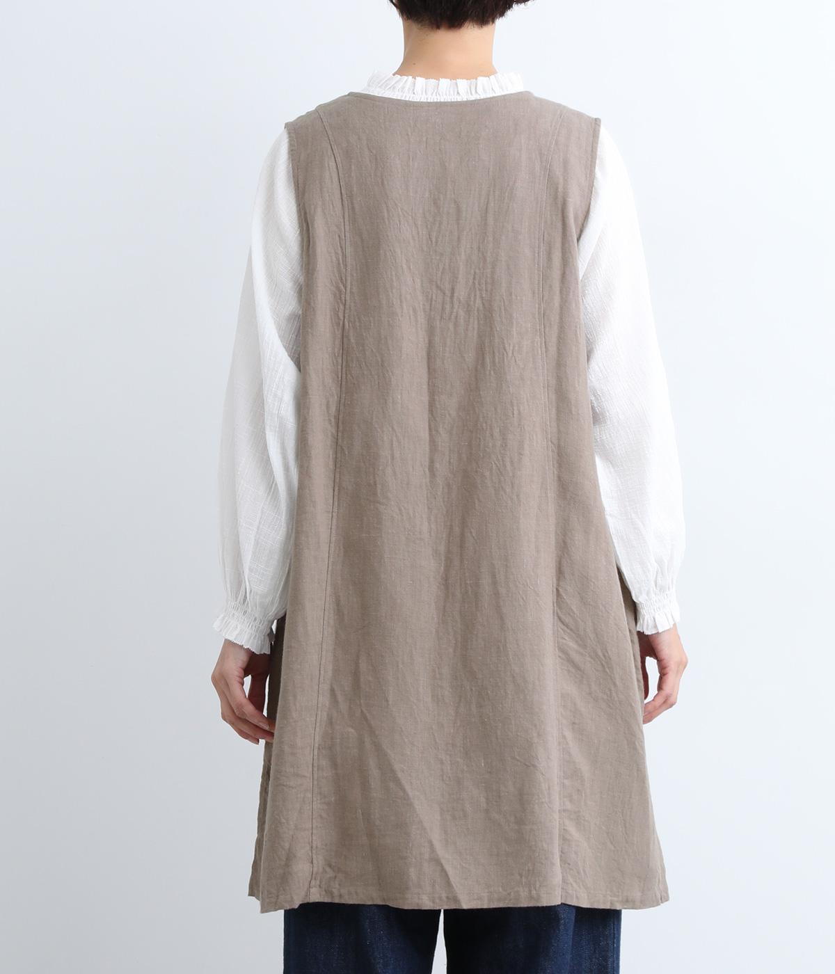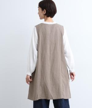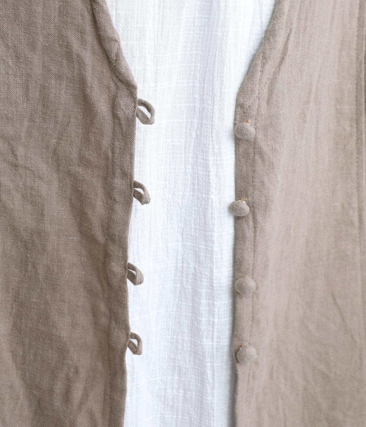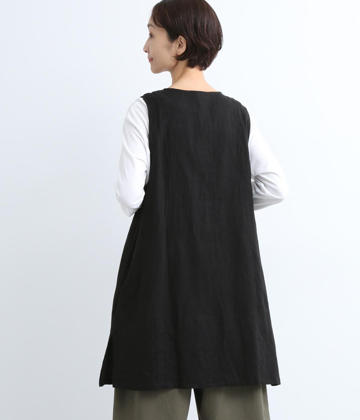 スタイリングに動きをつけてくれるロングジレです。くるみボタンが控えめながらもデザインポイントになっています。襟ぐりや袖まわりの開きも広く、サイドスリット入りでワンピースなどボリュームのあるアイテム合わせもすっきりまとまります。