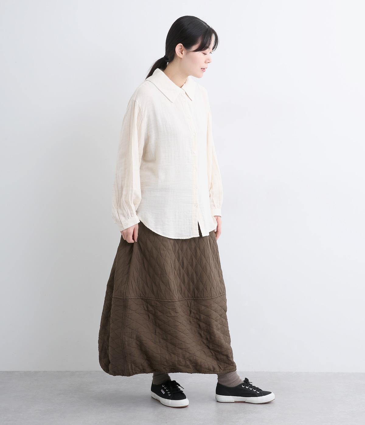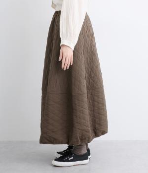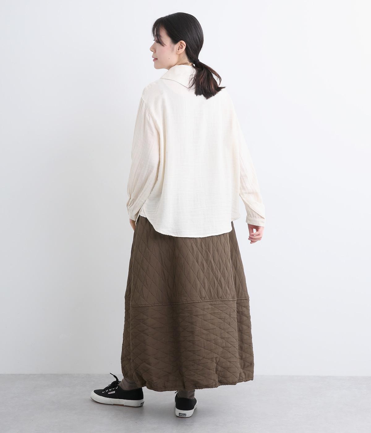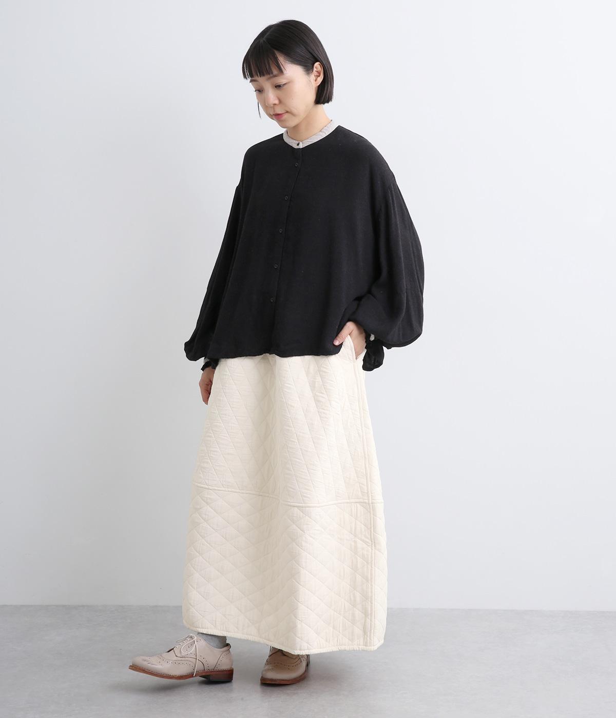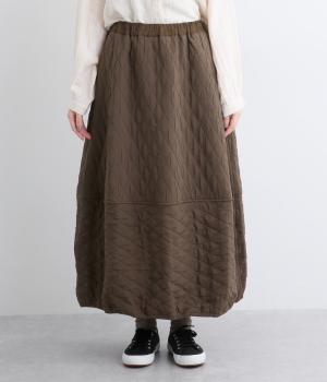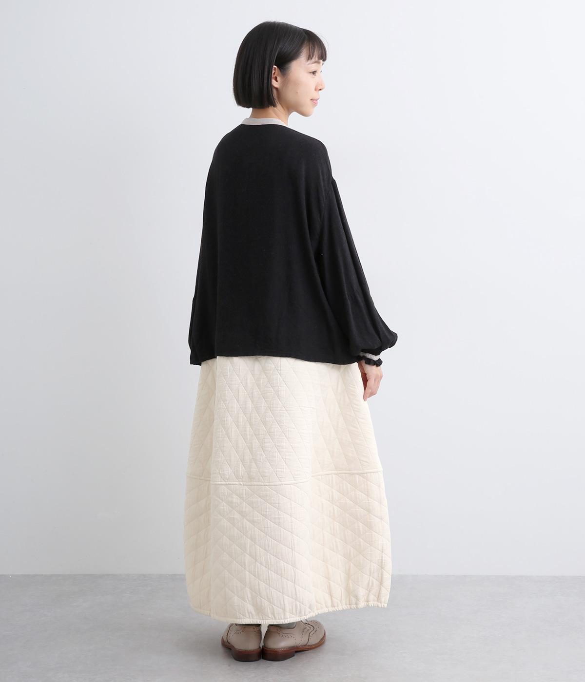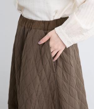 向きの異なるダイヤ柄を切り替えて、こなれ感ある仕上がりにしました。裾はゴム入りで丸みを出し、かわいらしさを演出しています。個性が光りつつも素朴であたたかみのある風合いです。ウエストは総ゴム仕様で紐で調節できます。