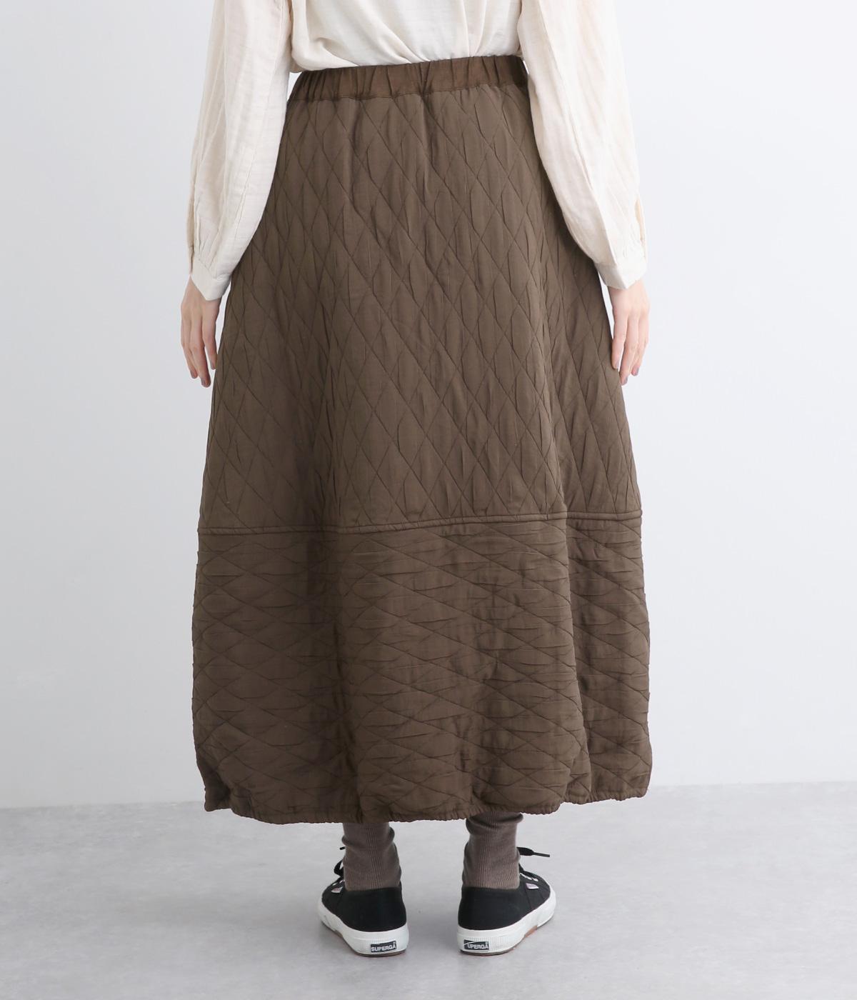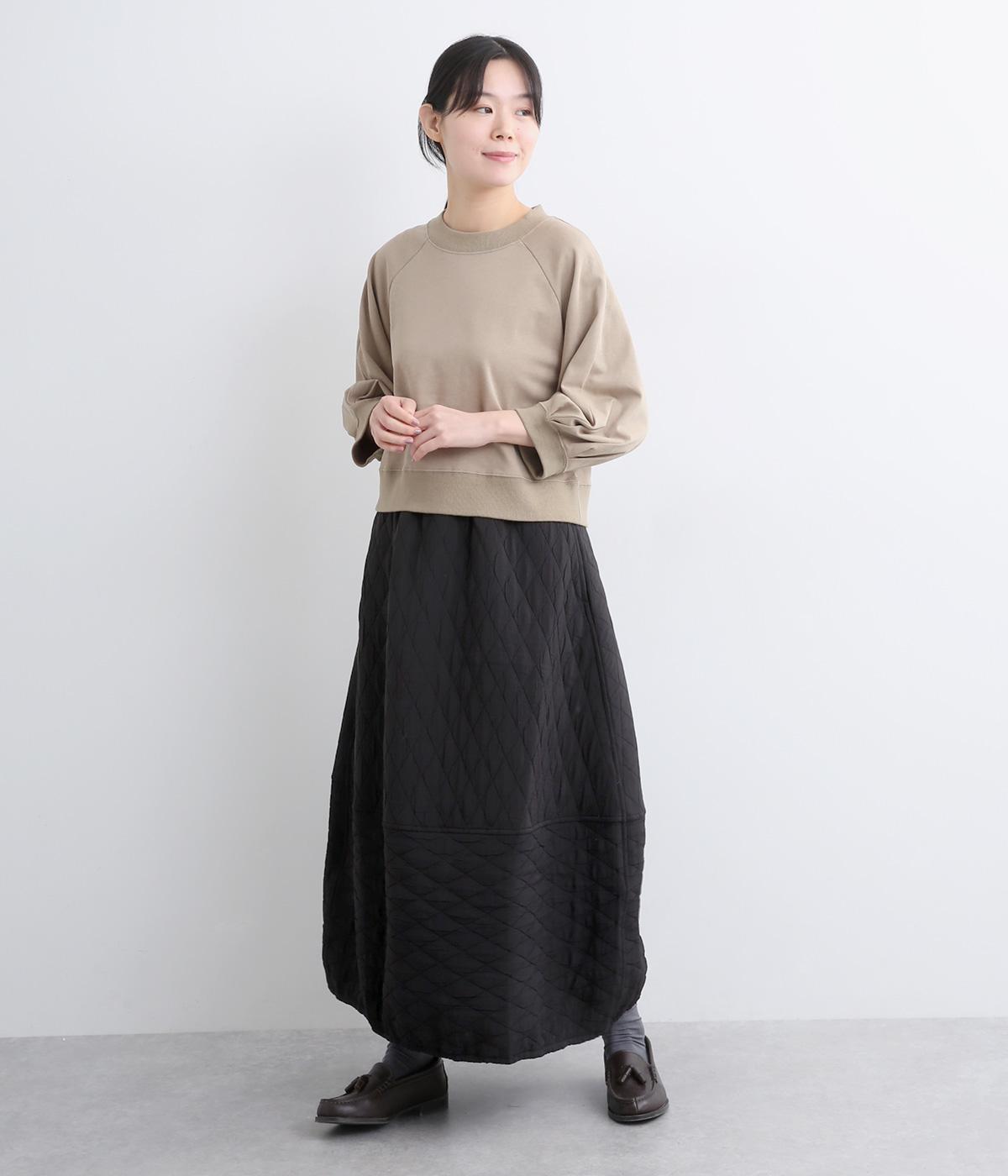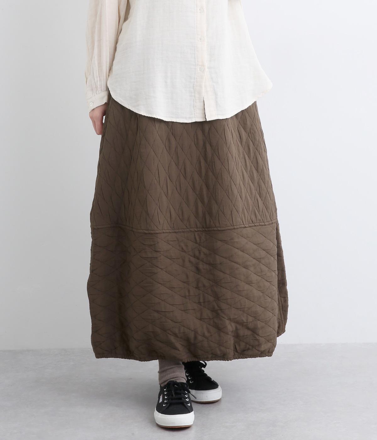 向きの異なるダイヤ柄を切り替えて、こなれ感ある仕上がりにしました。裾はゴム入りで丸みを出し、かわいらしさを演出しています。個性が光りつつも素朴であたたかみのある風合いです。ウエストは総ゴム仕様で紐で調節できます。