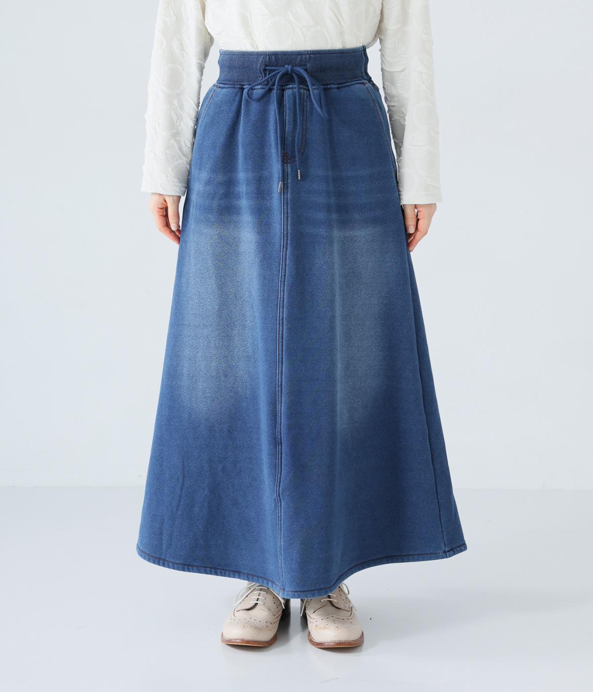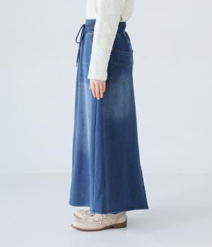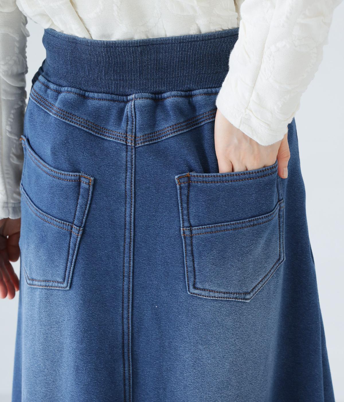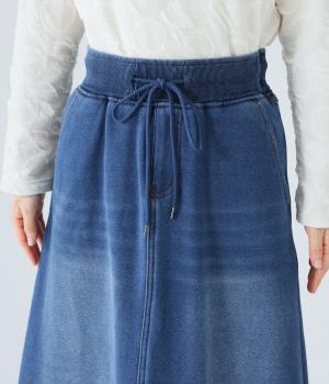 裾に向かって広げたAラインシルエットがフェミニンンなスカート。随所のステッチワークやヒップポケットでデニムらしいカジュアルなムードに仕上げました。後ろ裾に入れたスリットで足さばきも◎。ウエストは総ゴム仕様で、外側に紐をプラスしています。