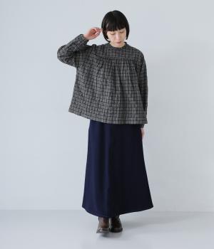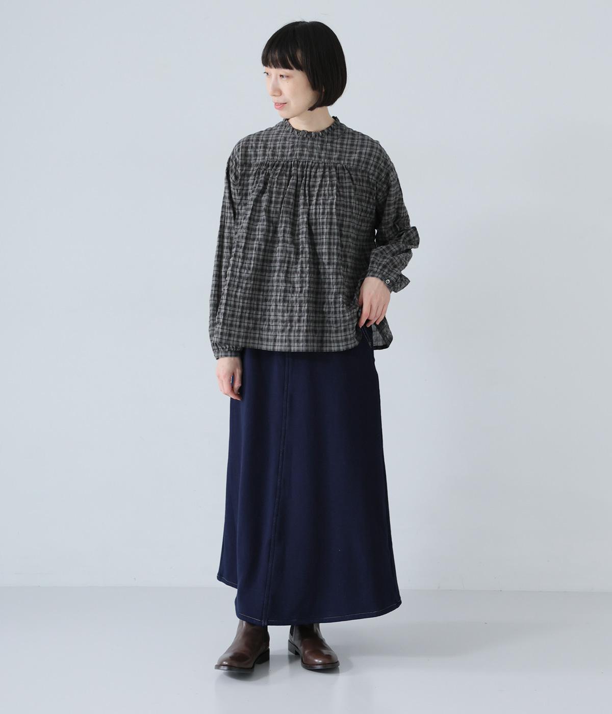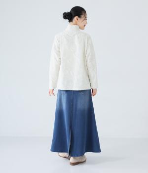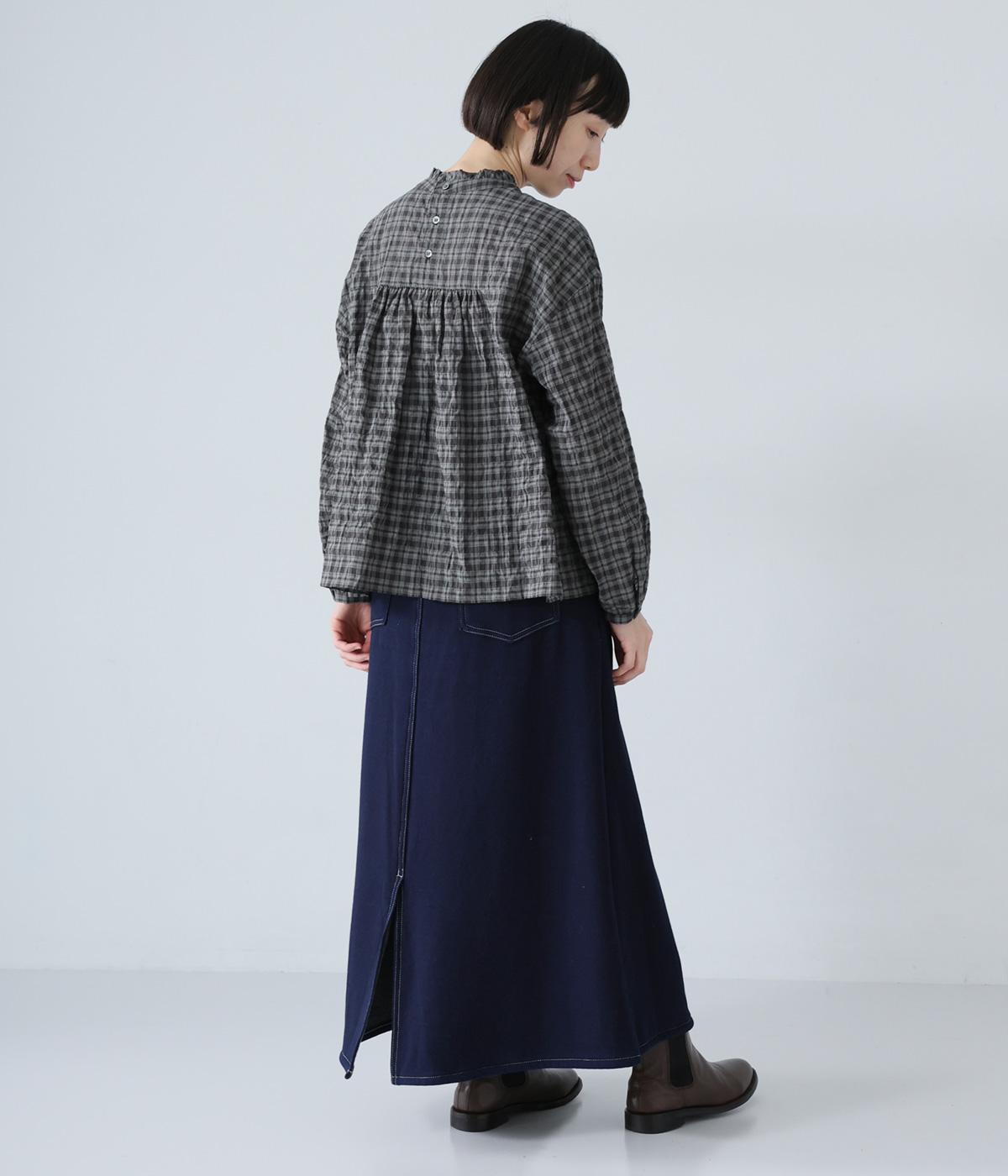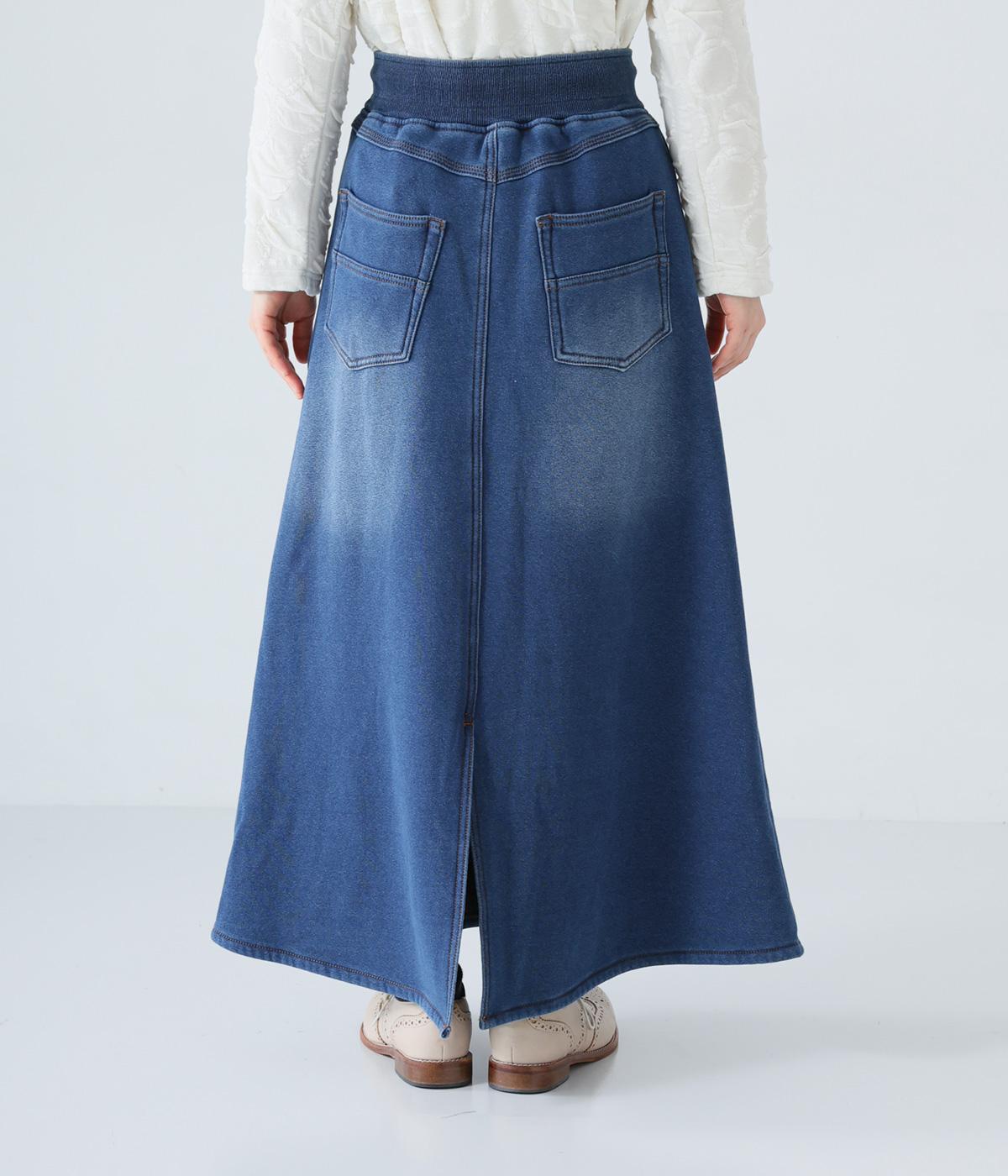 裾に向かって広げたAラインシルエットがフェミニンンなスカート。随所のステッチワークやヒップポケットでデニムらしいカジュアルなムードに仕上げました。後ろ裾に入れたスリットで足さばきも◎。ウエストは総ゴム仕様で、外側に紐をプラスしています。