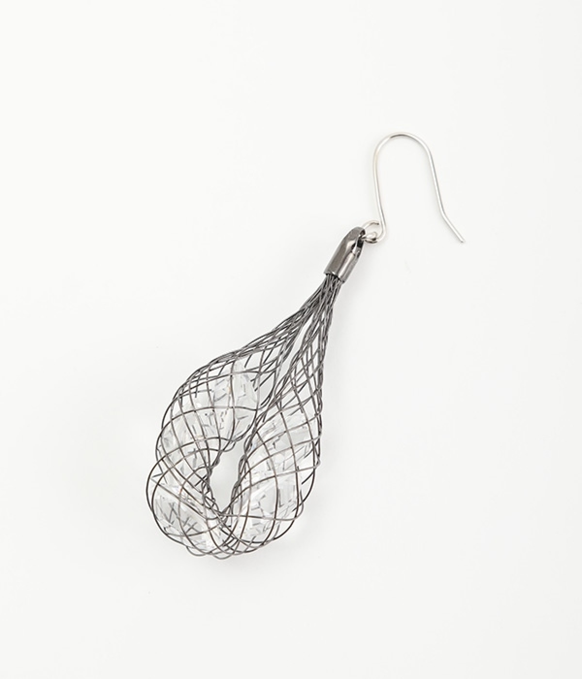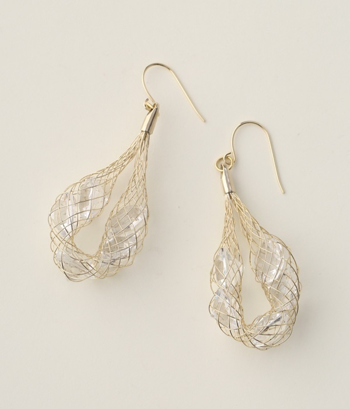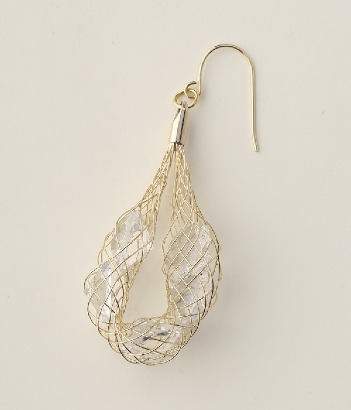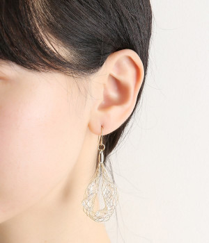 真鍮でできたネットの中にキラキラ輝くビジューを閉じ込めたピアス。細めのネットが、華奢で女性らしい雰囲気を醸し出します。大きめのモチーフが耳元で揺らめき、着こなしに大人っぽいアクセントをプラス。さまざまな洋服に合わせやすいのもうれしいポイントです。普段使いにはもちろん、結婚式やパーティなどのお呼ばれシーンにもおすすめ。