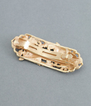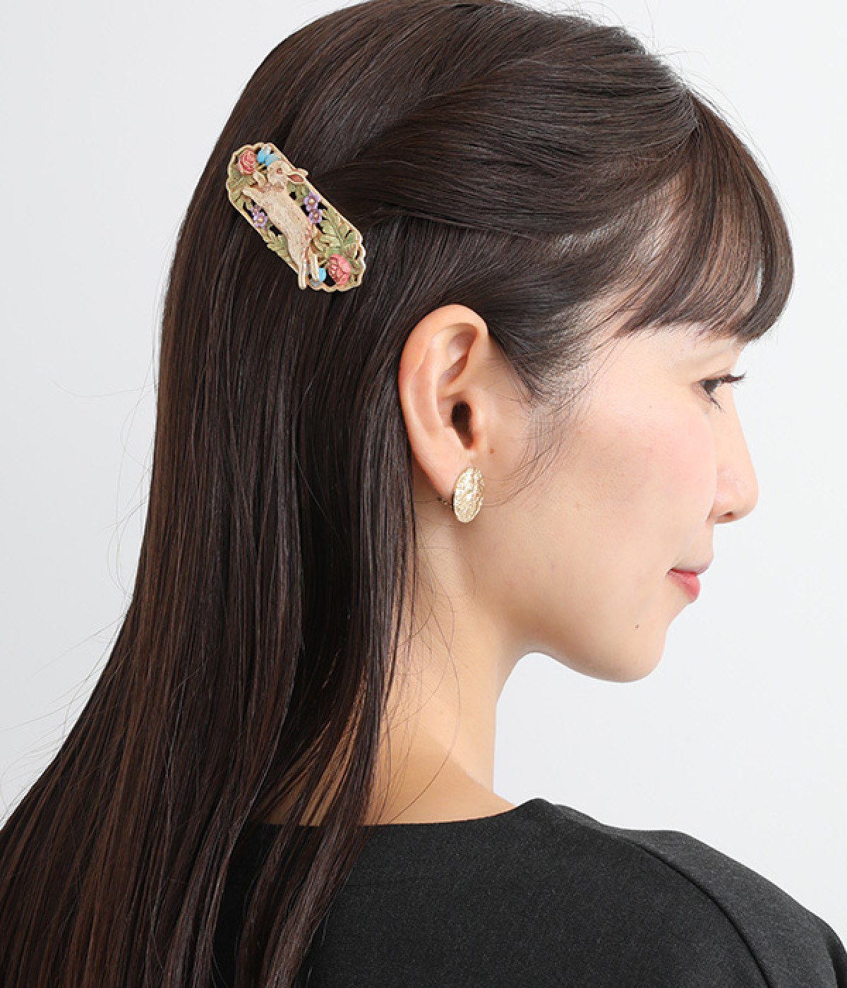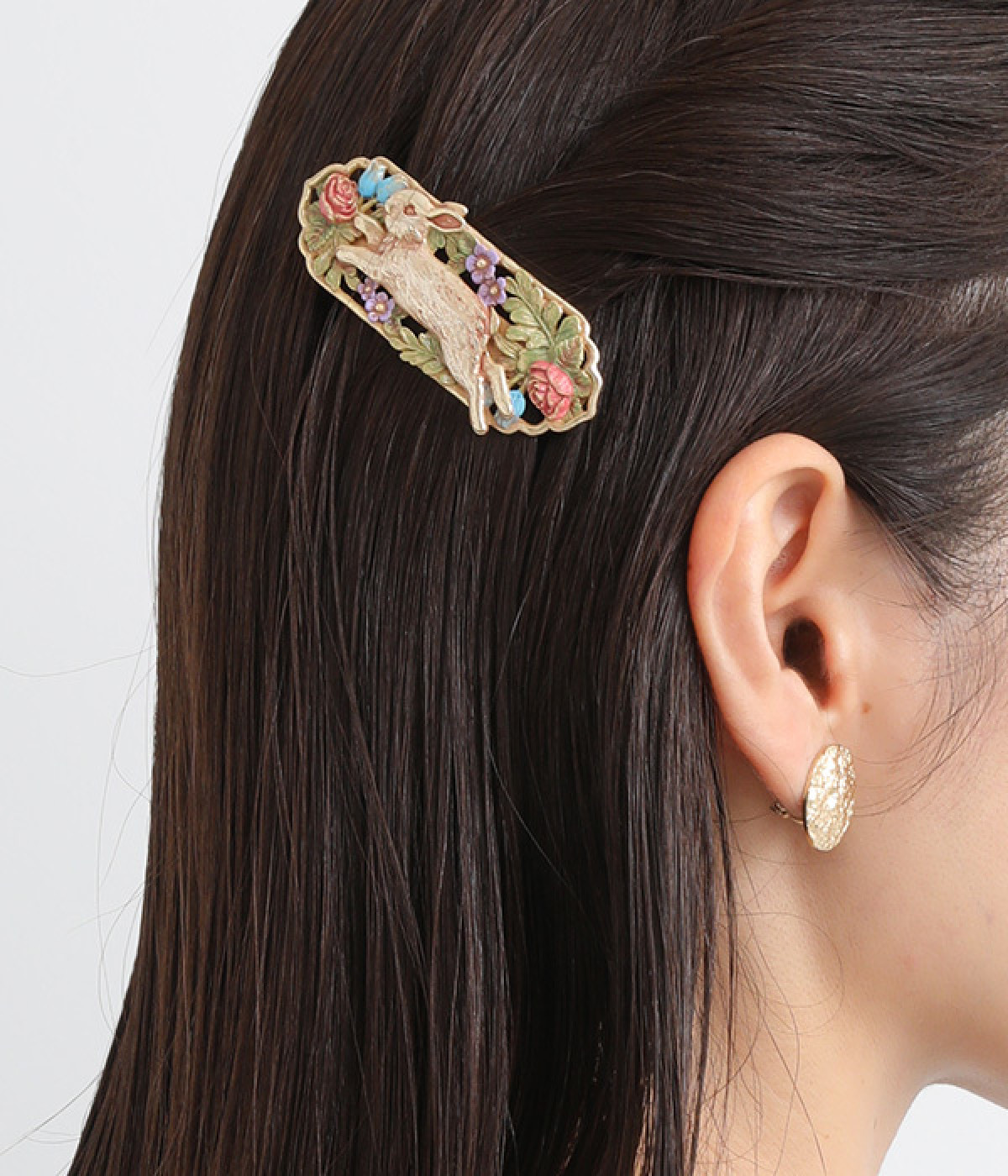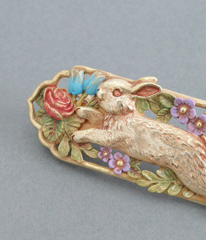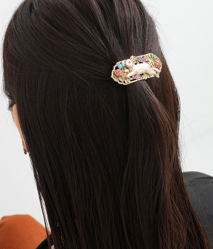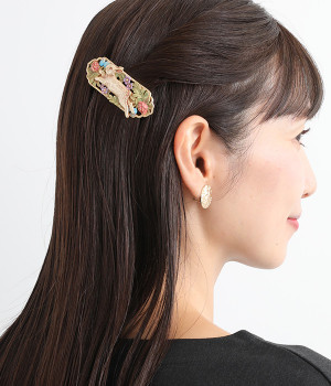 優雅に飛び跳ねる野ウサギの様子が大胆に描かれたバレッタです。パープルやブルーなどの花々が咲き乱れ、豊かな色彩は見ているだけで心が踊ります。シンプルなスタイルにこそ取り入れたい手の込んだデザインが◎。ぱちんと閉じるだけで着用できるので、ヘアアレンジが苦手な方にもおすすめです。