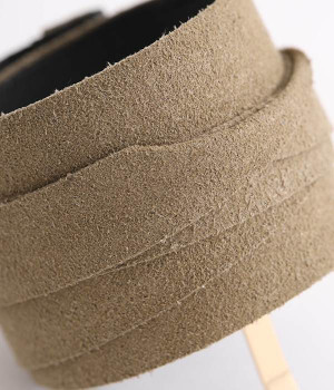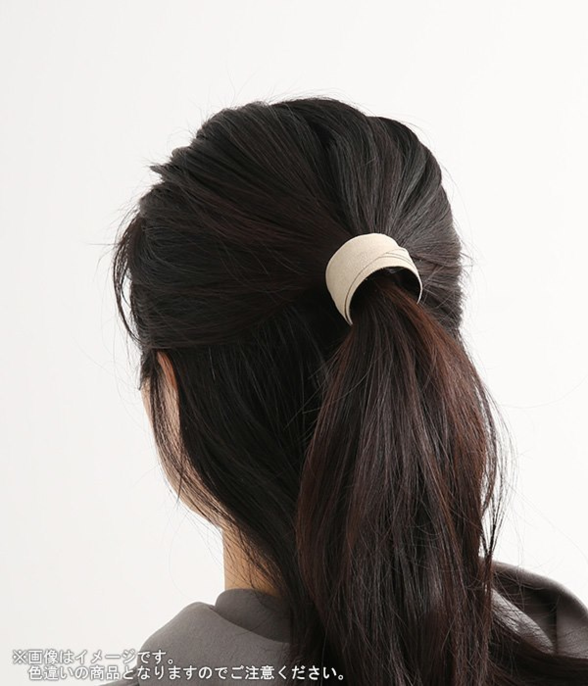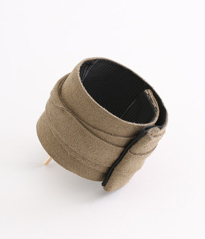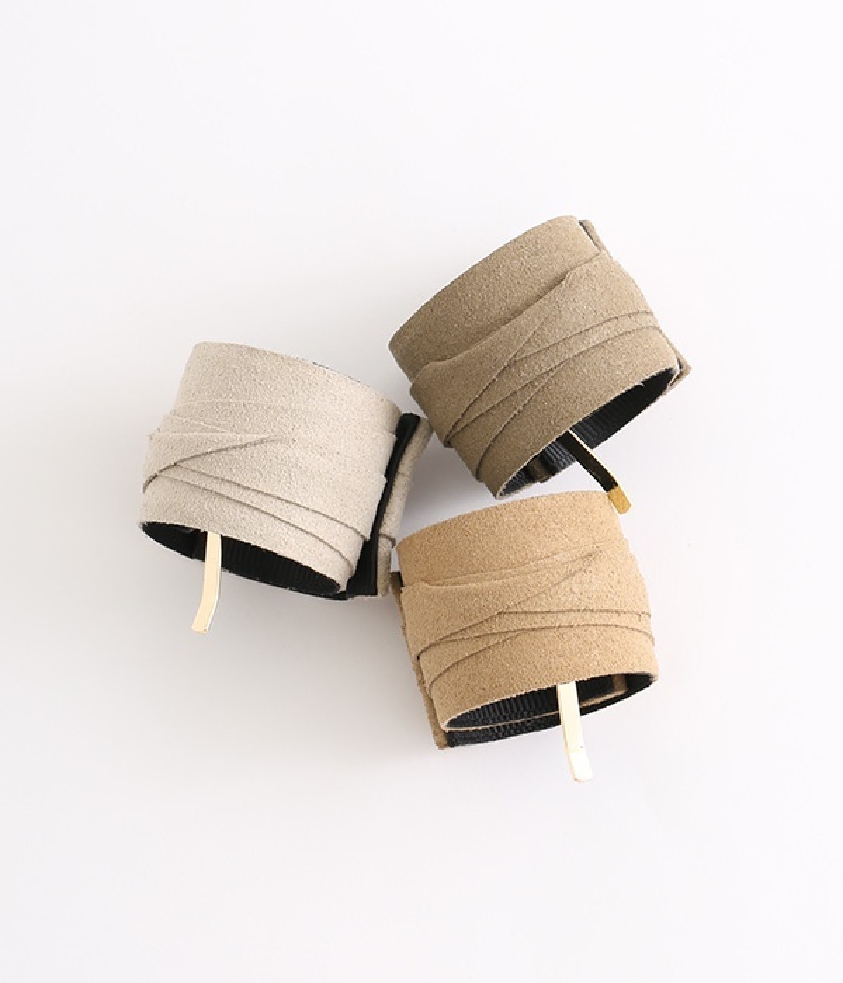 スエード調の風合いが上品なヘアカフです。一見するとくるんと丸まっていますが、帯のような部分を広げて長く伸ばすことができるクラップタイプのヘアカフなので、帯部分を広げて束ねた髪にピンを差し込むだけ。手軽な操作でヘアアレンジをお楽しみいただけます。お肌に優しいニッケルフリーメッキを使用した金具もうれしいポイントです。