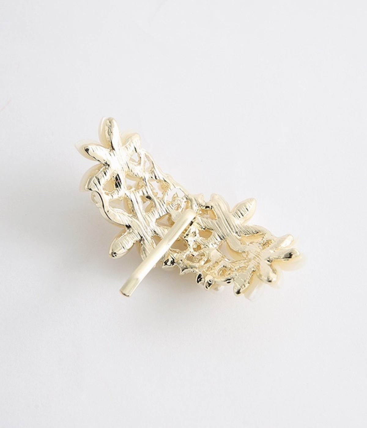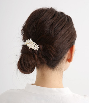 ゴールドを基調とした、艶やかで上品な輝きを放つパールのお花モチーフが女性らしさを引き立たせるヘアカフです。ハーフアップやお団子ヘア、ポニーテールなどまとめ髪にさっと差し込むだけで華やかなヘアスタイルが完成します。普段使いにはもちろん、卒業式や入学式などの式典やパーティーシーンのスタイリングにもおすすめです。