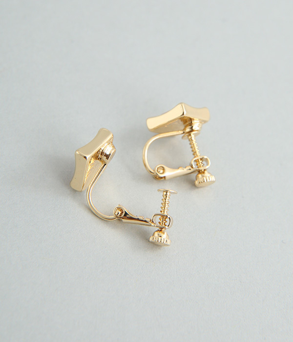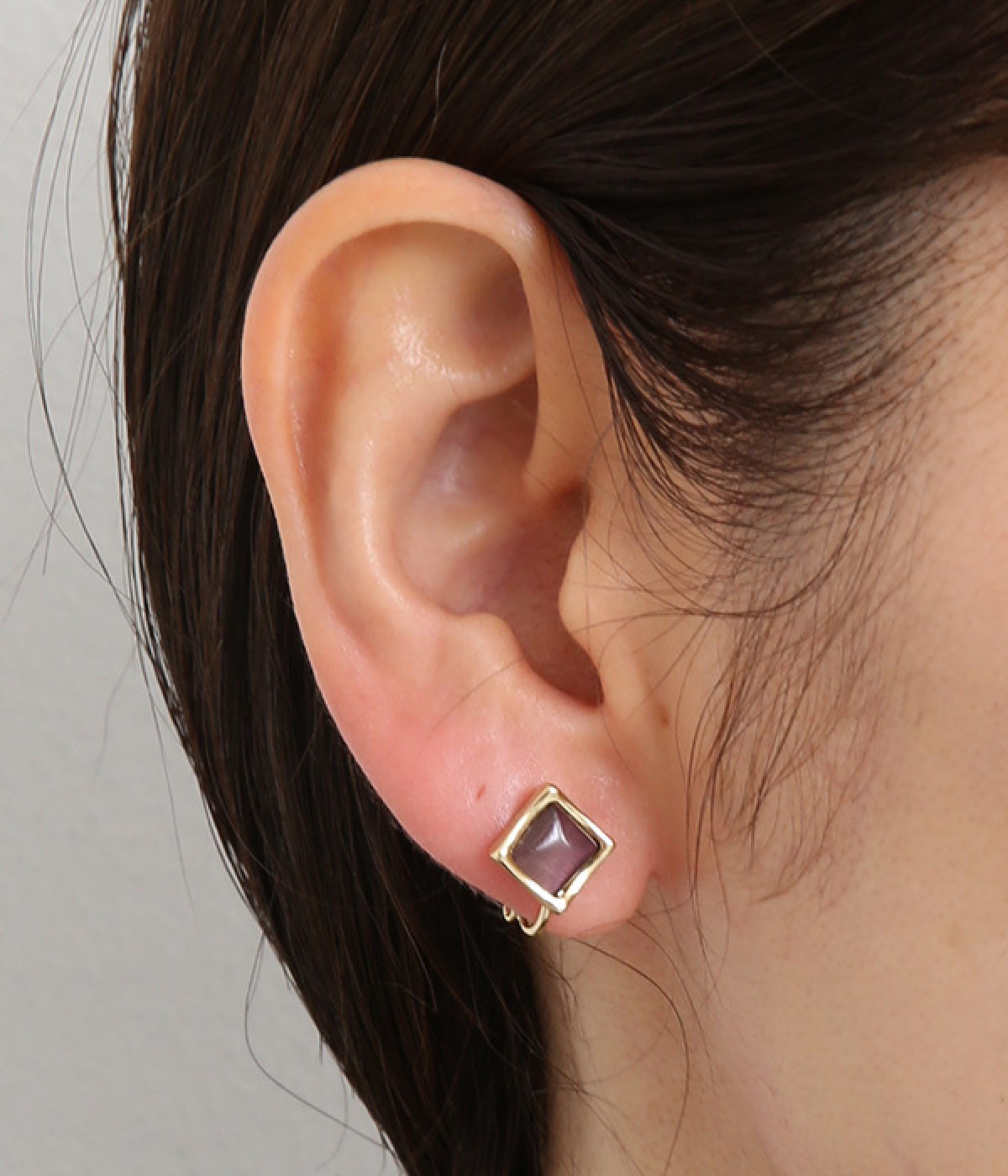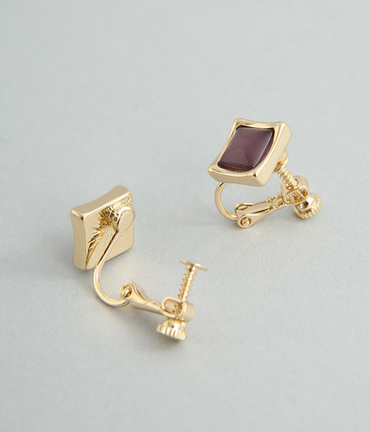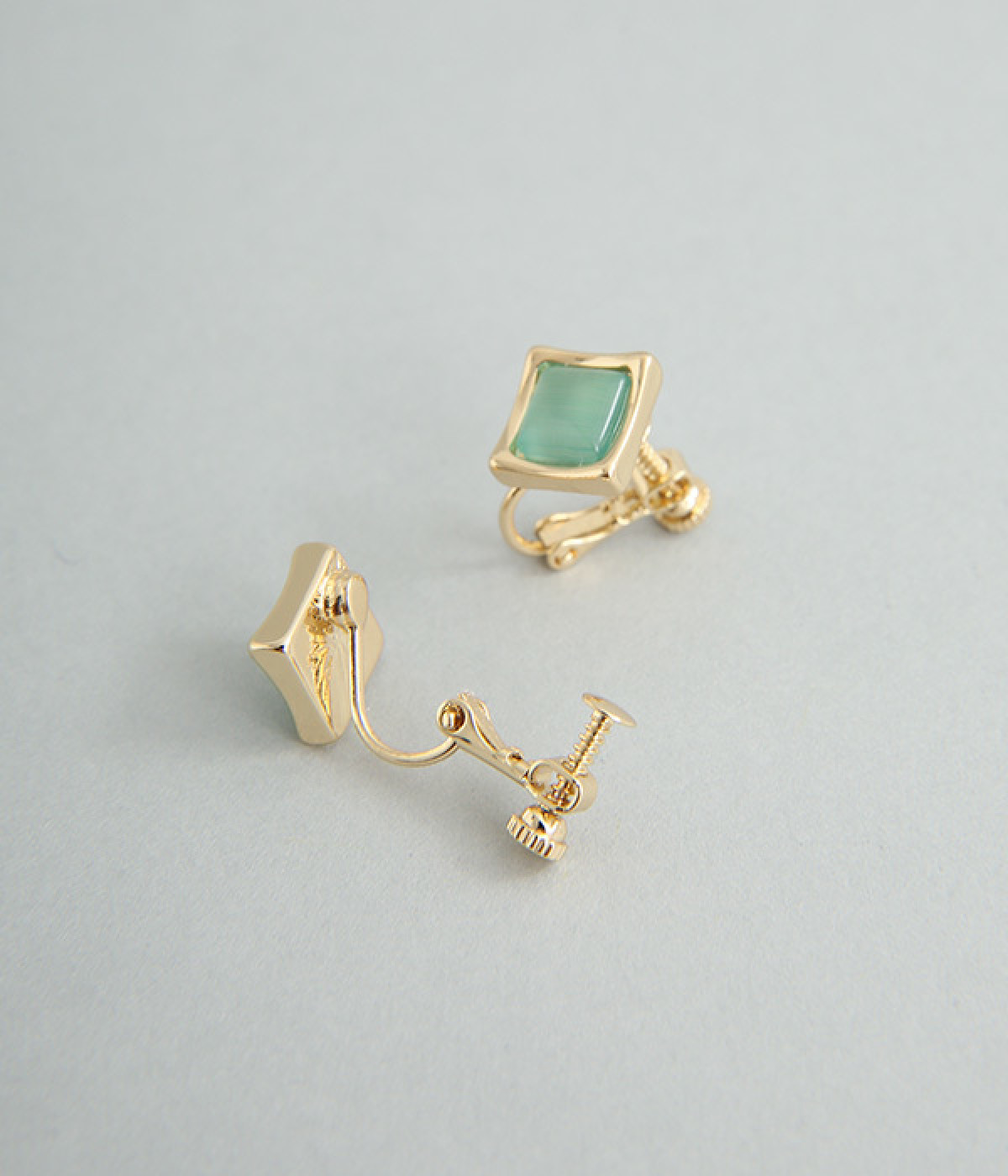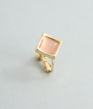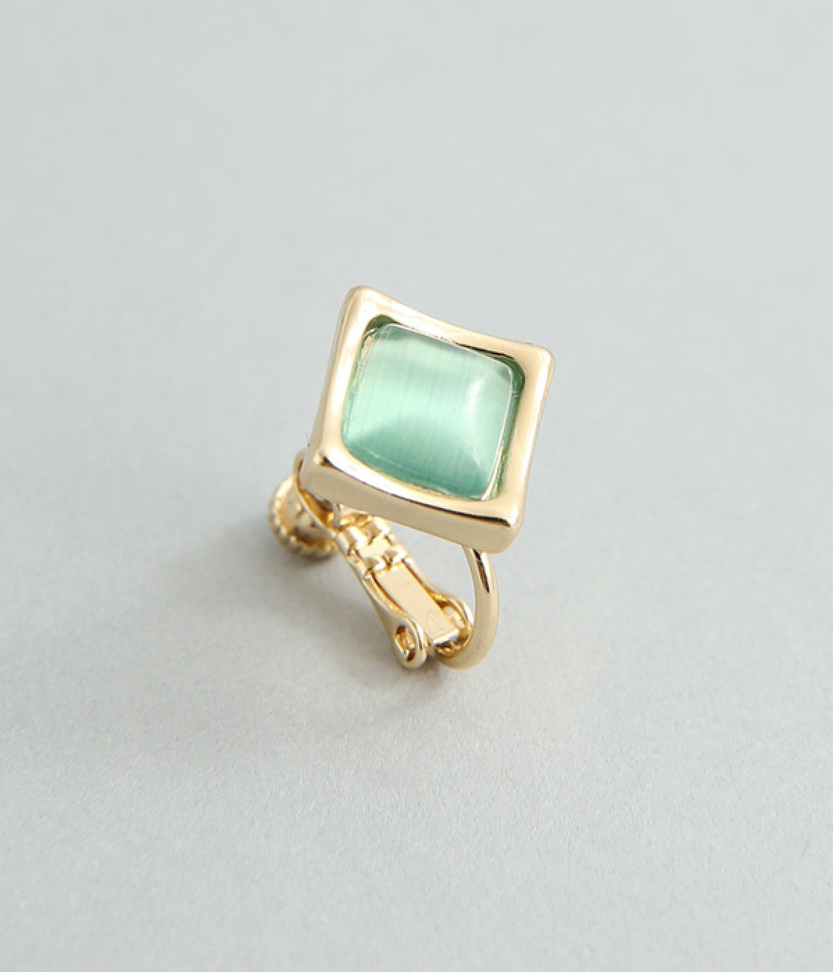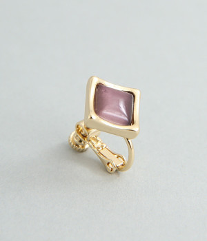 キャッツアイ風のストーンが上品なスクエア型イヤリング。ストーンはふっくらと丸みを帯び、フレームはやや反りあがったように動きをつけ、スクエア型でもクールすぎないバランスをとりました。品よくパーツが輝き、顔まわりが華やかに。調節可能なネジバネ式は着脱しやすく、お肌に優しいニッケルフリーメッキ素材もうれしいポイントです。