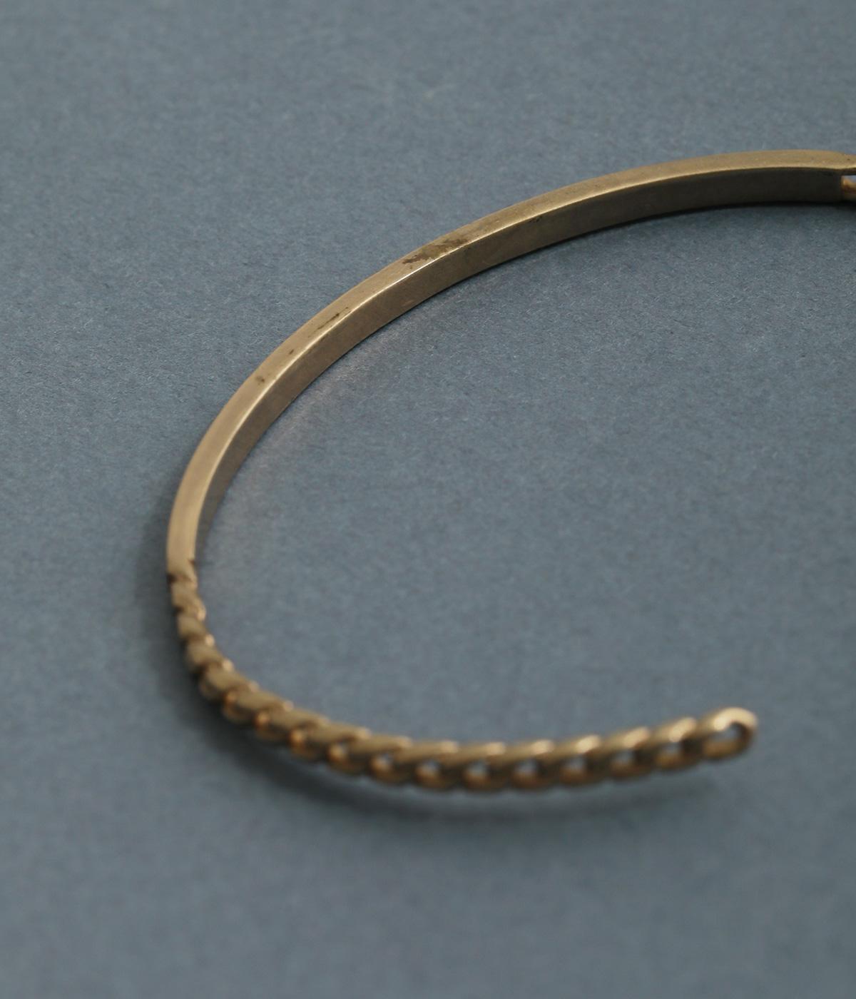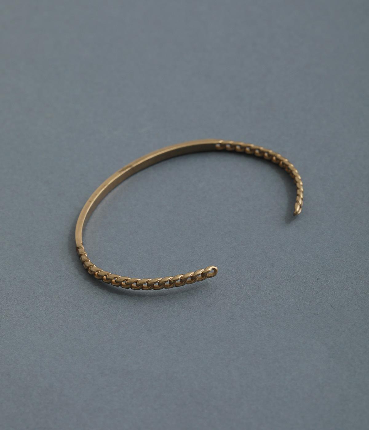 アンティークゴールド風の自然なかがやきが、大人の女性の手元を美しく彩ります。フロントはすっきりとしたライン、サイドはチェーン風の二面性のあるデザインでデイリースタイルに取り入れやすくなっています。