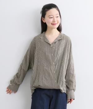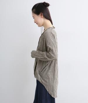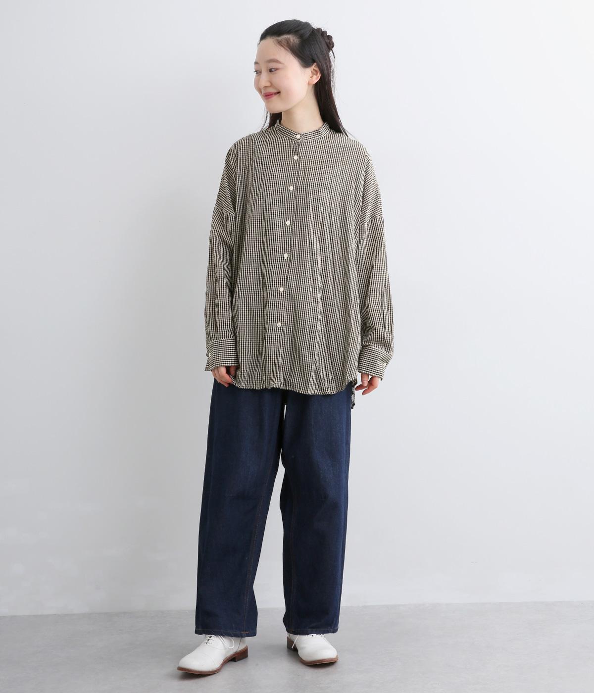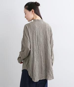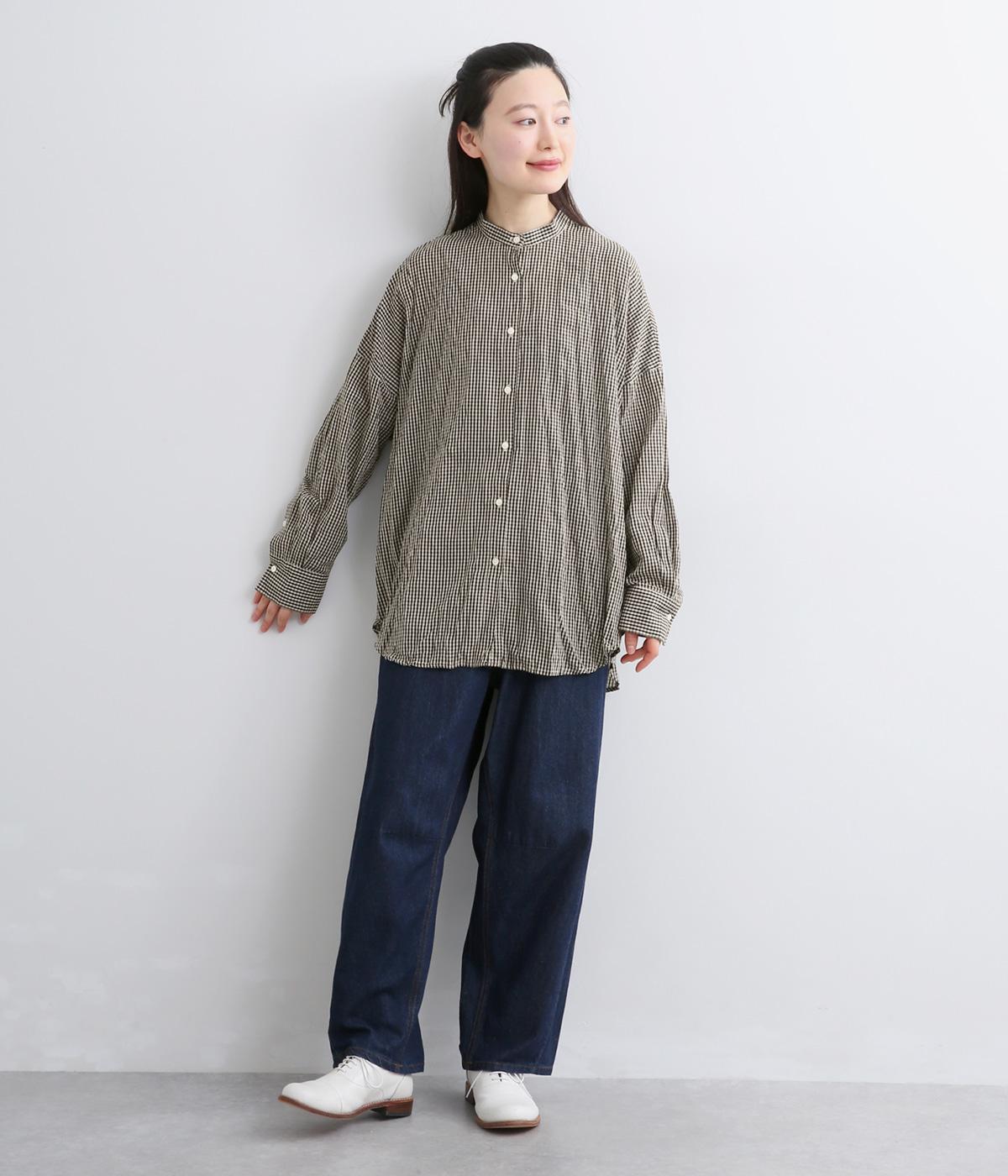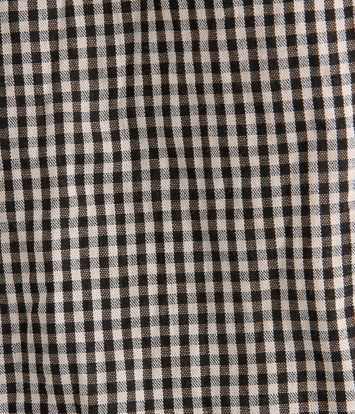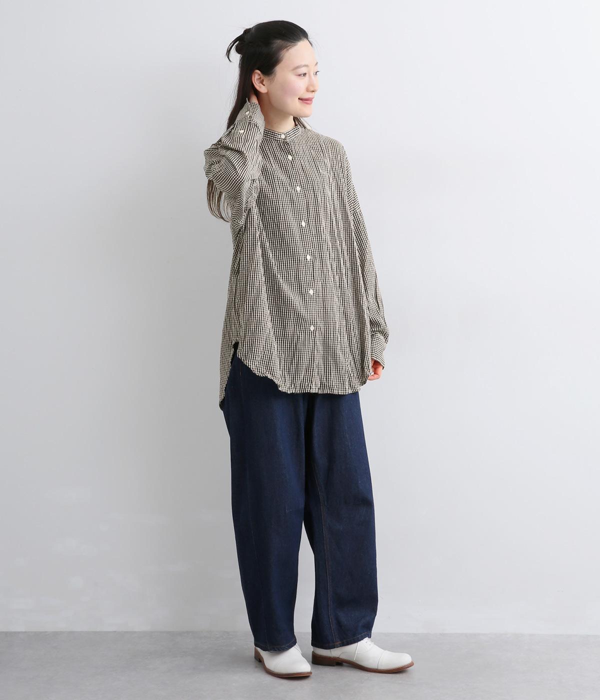 ギンガムチェックとネイビーはコットンメインの混紡シャーリング生地で、ドットはレーヨンメインのプレーンなプリント生地を使用しています。製品をねじることで自然なシワ感を出した、味わいのある素材感です。