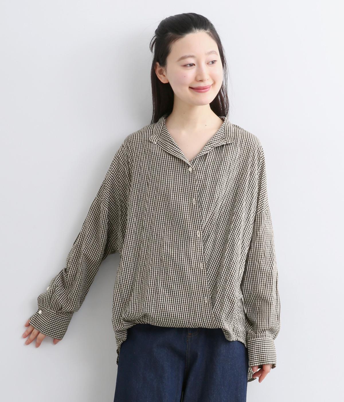 内側のボタンを留めるとカシュクール風にも着られる2way仕様のシャツです。落ち感のある生地がリラックスした雰囲気を後押し。華やかさがありながらも気負わずに着られ、サッと羽織るだけでこなれ感のある着こなしが叶う一枚です。