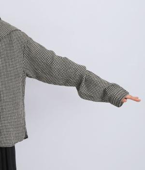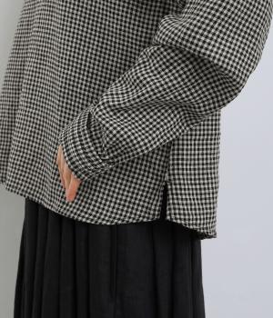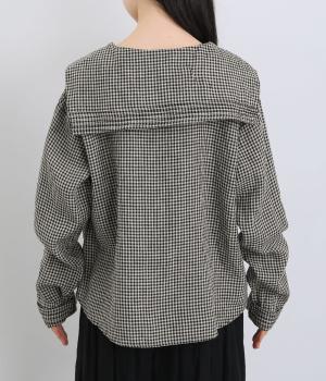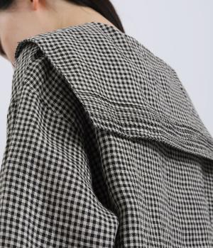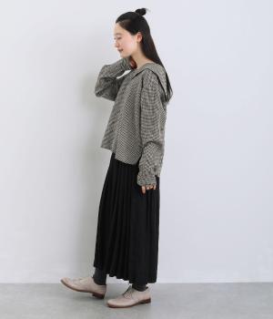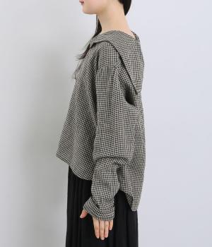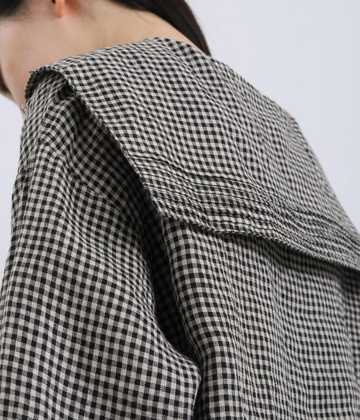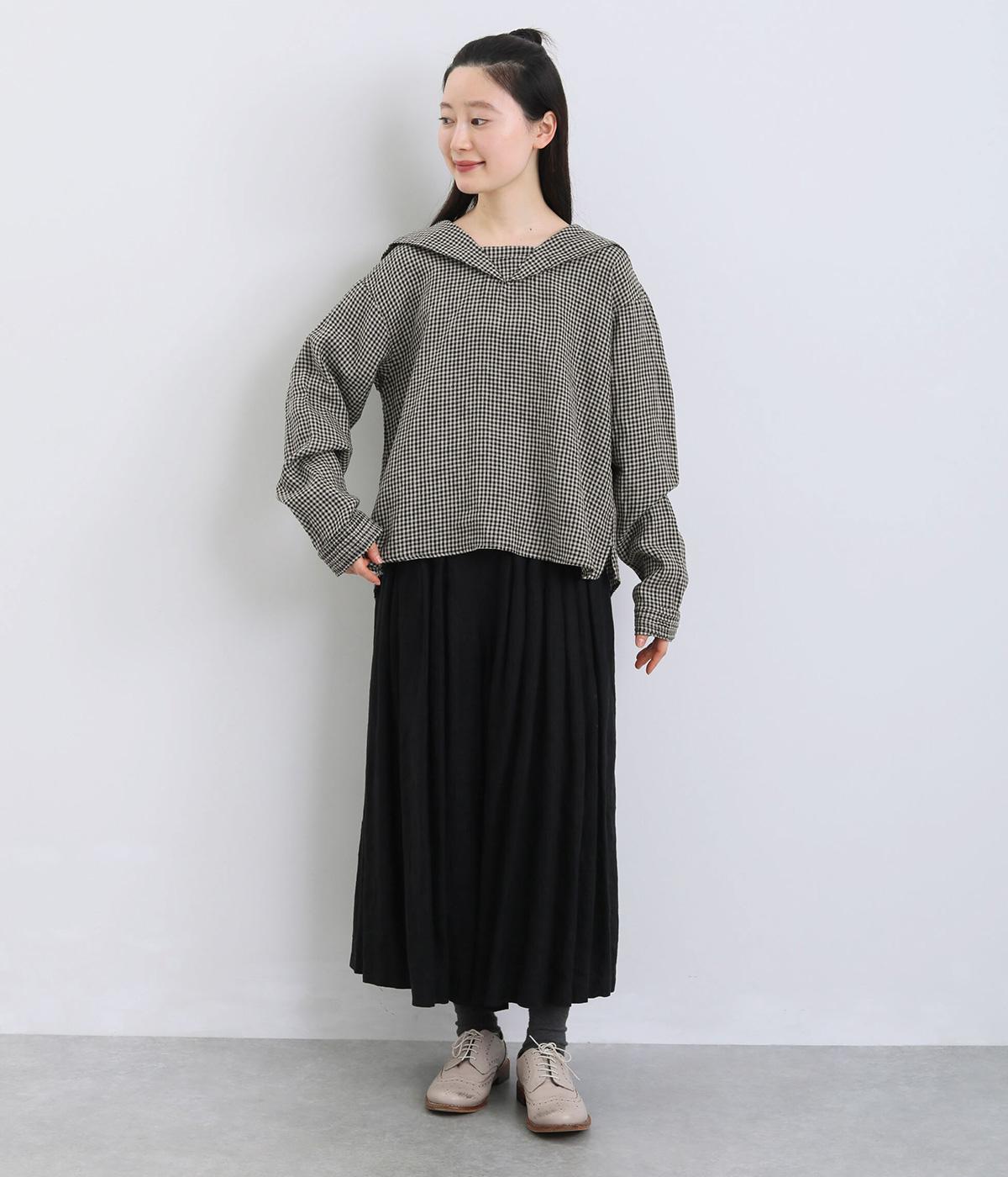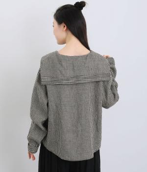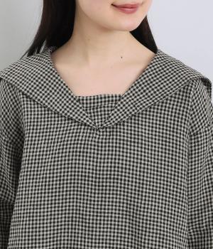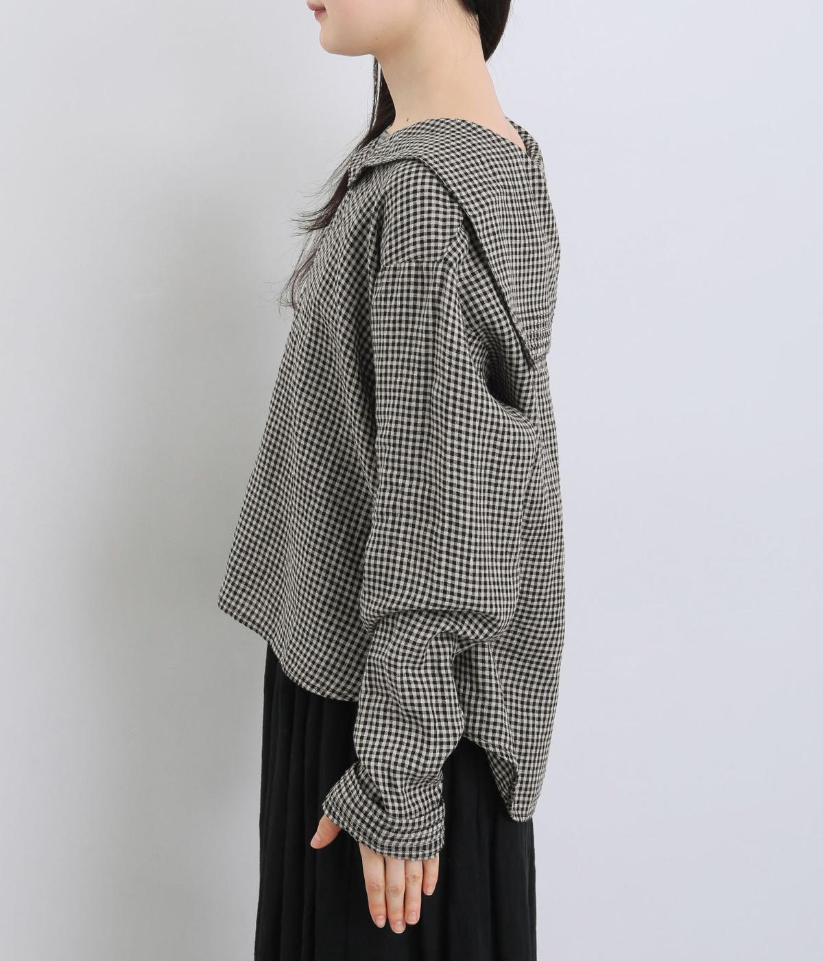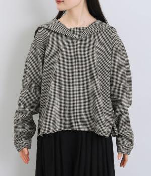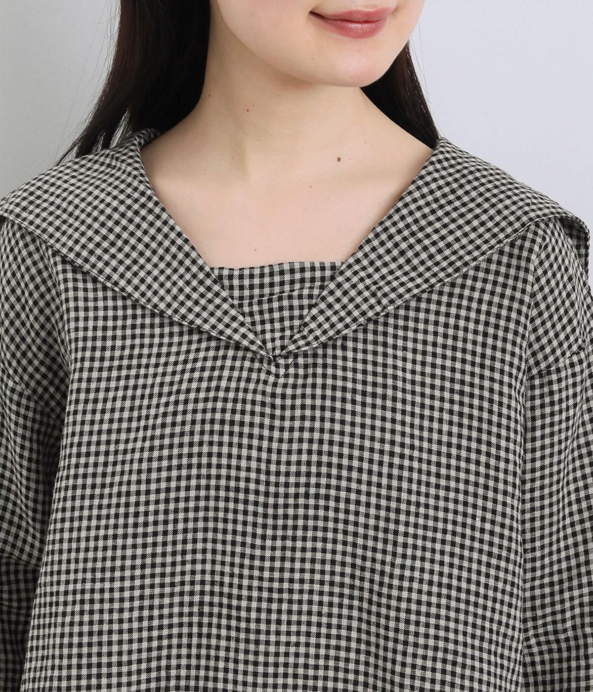 細かなギンガムチェック柄とほどよい存在感のセーラーカラーが印象的な、プルオーバーブラウスです。うしろ襟の端と、袖口の折り返し部分に細かなピンタックを施し、さりげないアクセントを添えました。前後差のある長めの丈感で、着るだけでバランスよく決まる一枚です。