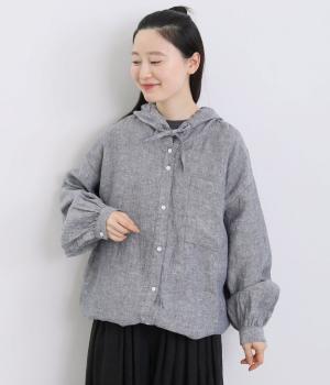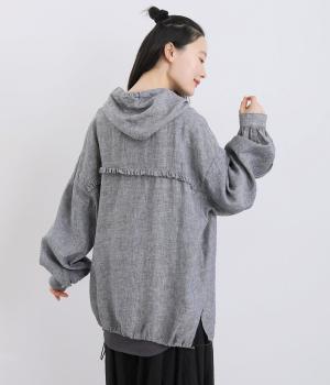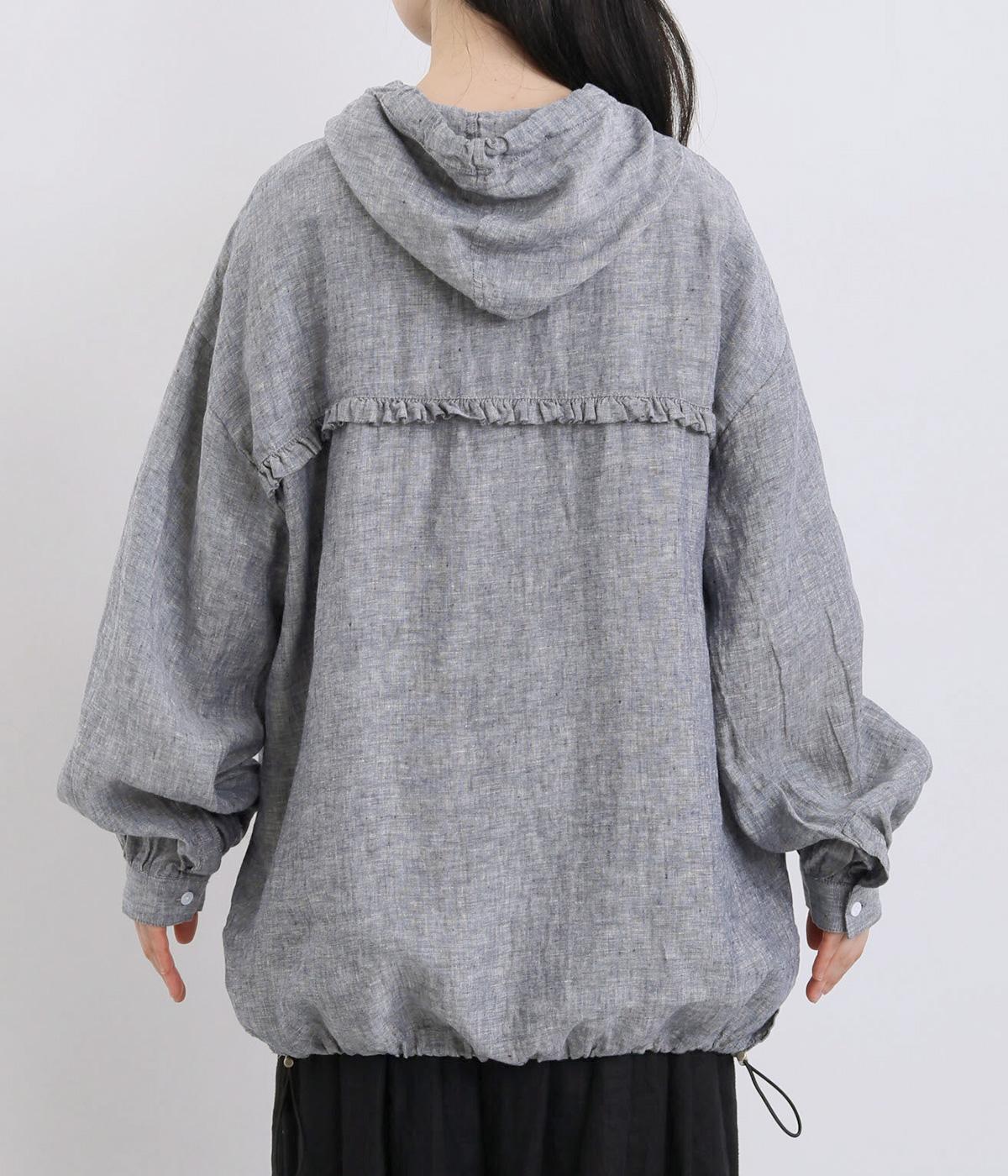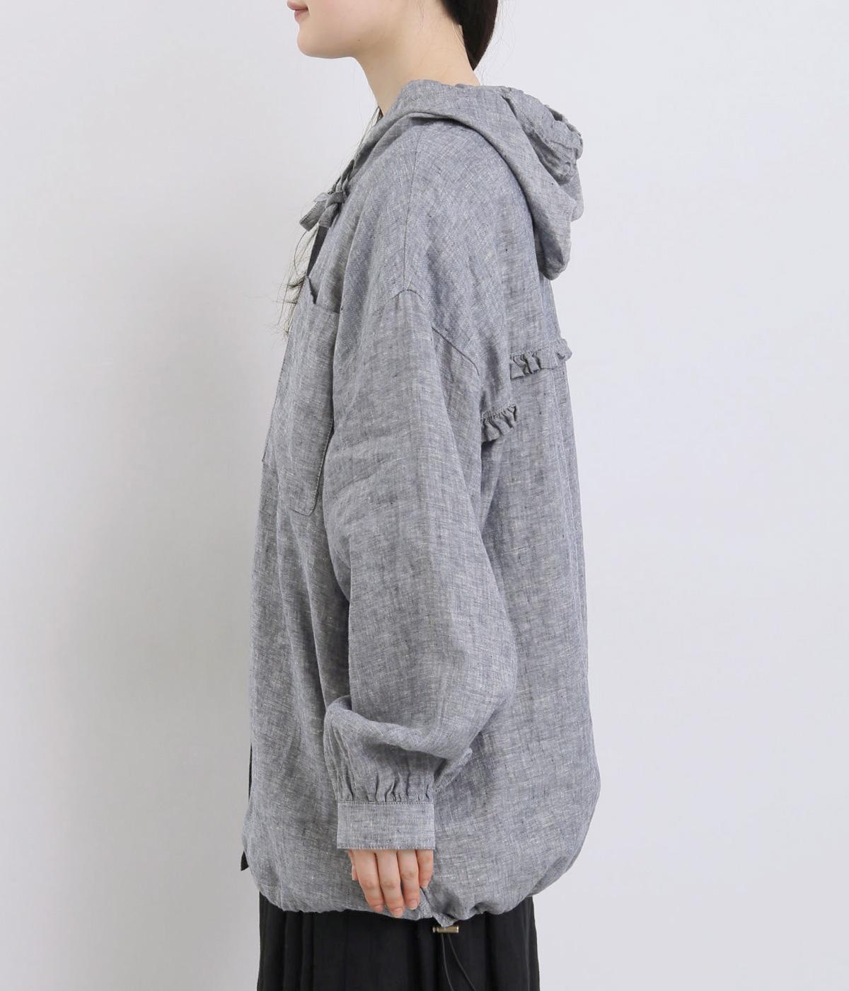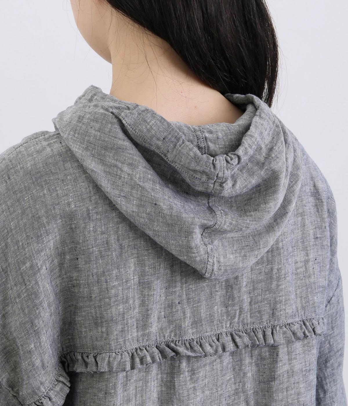 フードつきのカジュアルなシルエットに、背ヨークのフリルがやさしいアクセントを添えるブラウスです。前あき仕様で軽く羽織れ、季節の変わり目には軽アウターとしても活躍します。裾の両サイドにはスピンドルをあしらい、絞ることで丸みのあるフォルムにアレンジできます。