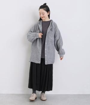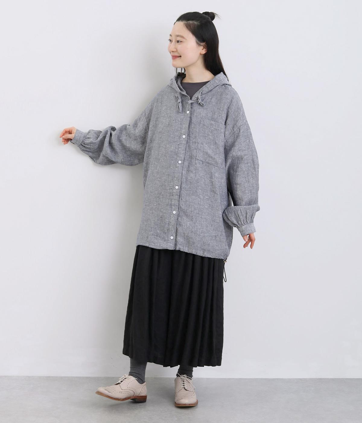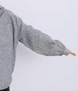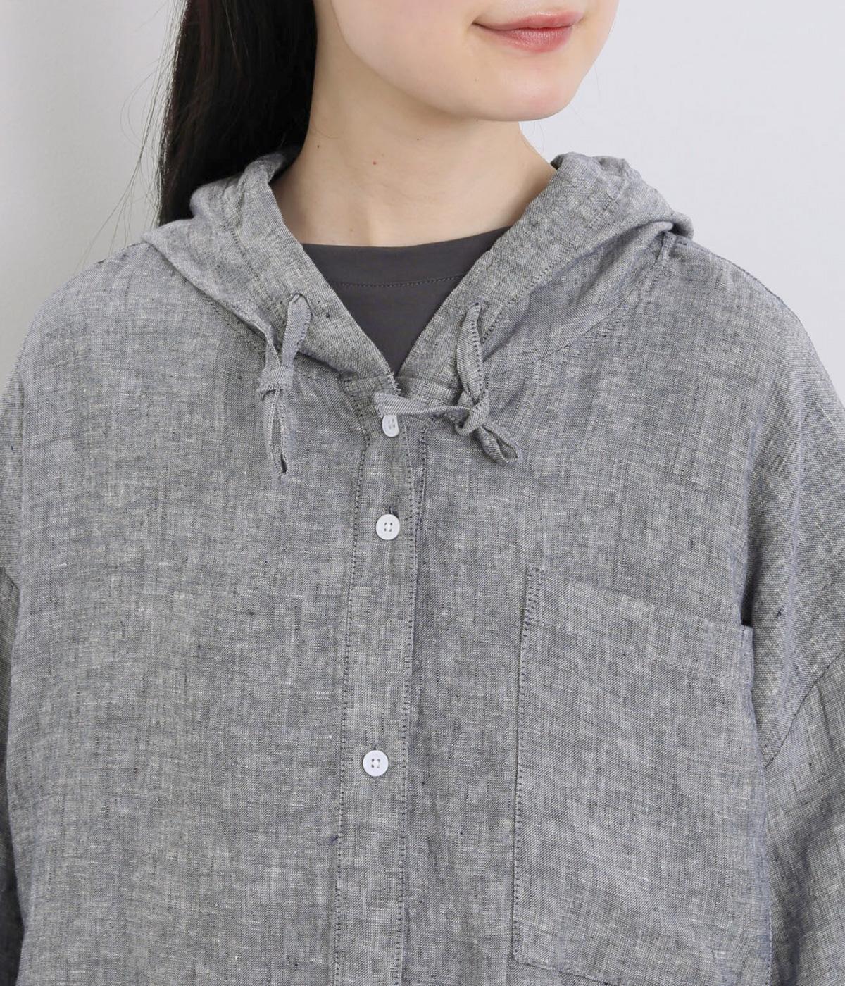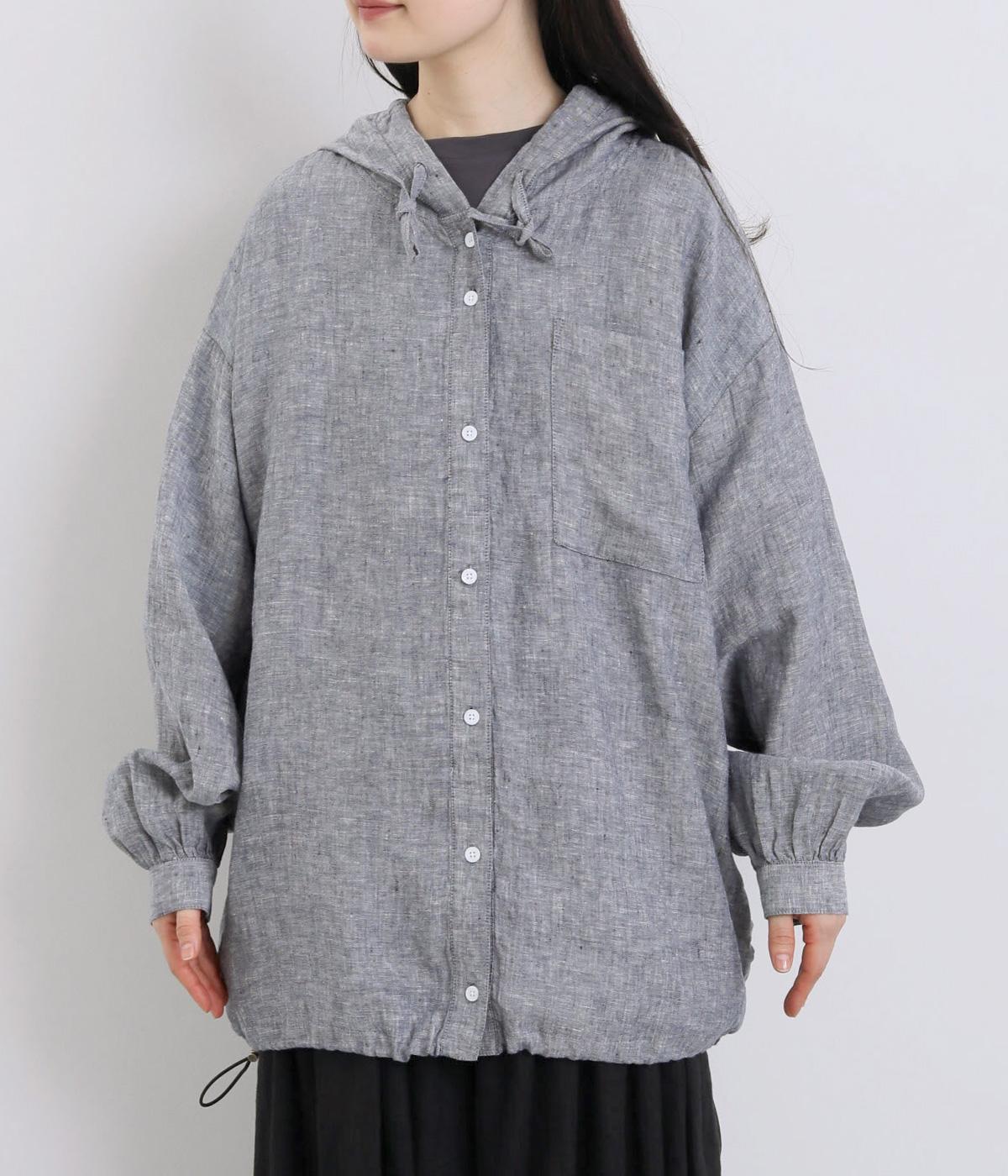フードつきのカジュアルなシルエットに、背ヨークのフリルがやさしいアクセントを添えるブラウスです。前あき仕様で軽く羽織れ、季節の変わり目には軽アウターとしても活躍します。裾の両サイドにはスピンドルをあしらい、絞ることで丸みのあるフォルムにアレンジできます。