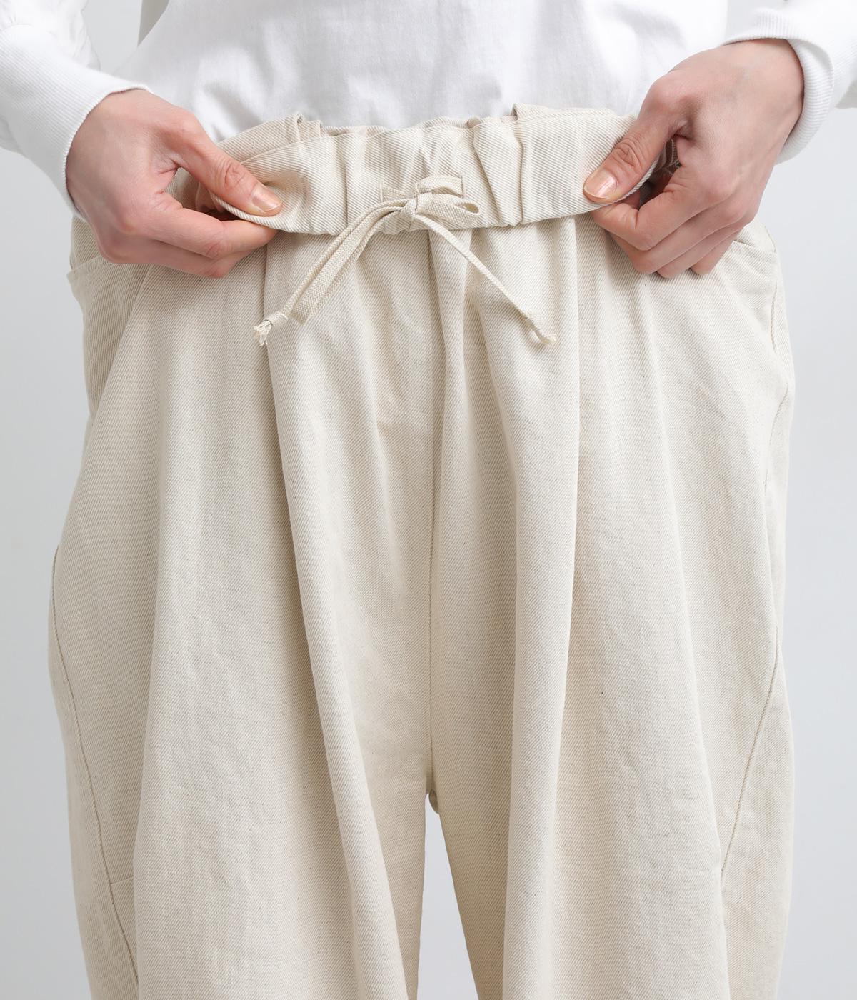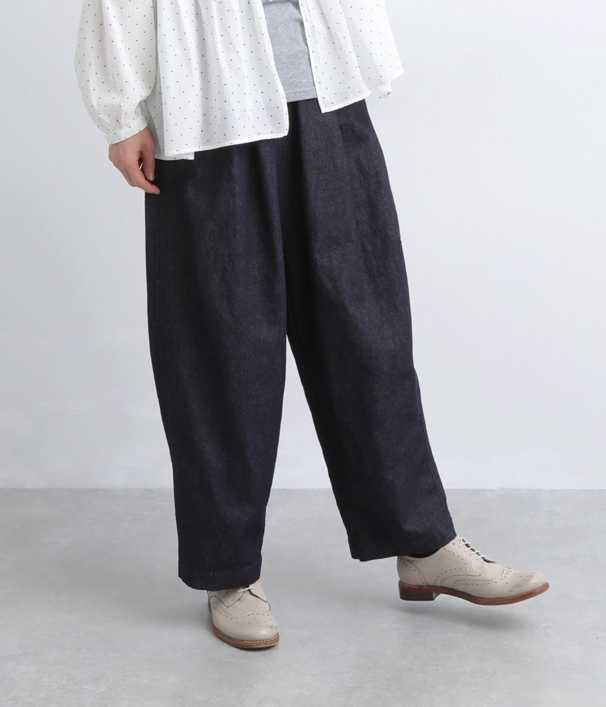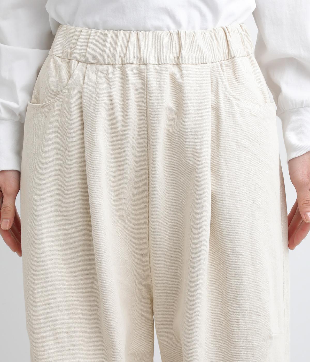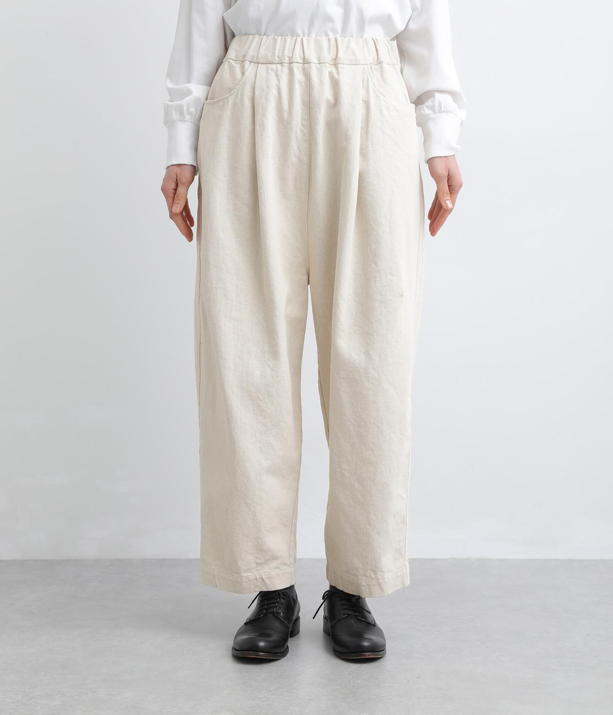 タックを入れて腰まわりはふっくらと、裾に向かってゆるくしぼったワイドテーパードパンツ。ひざ部分にダーツを入れることで自然な立体感あるシルエットに仕立てています。低めのヒップポケットも◎。ウエストはフィット感のいい総平ゴムに調整紐入り。