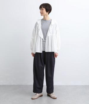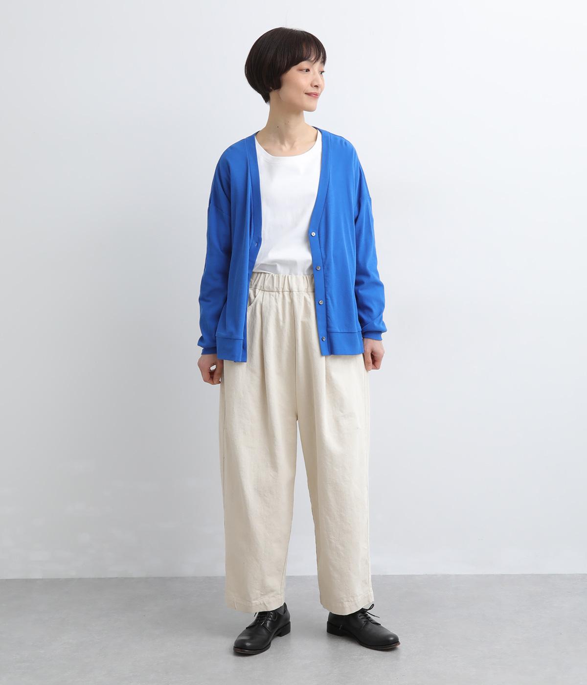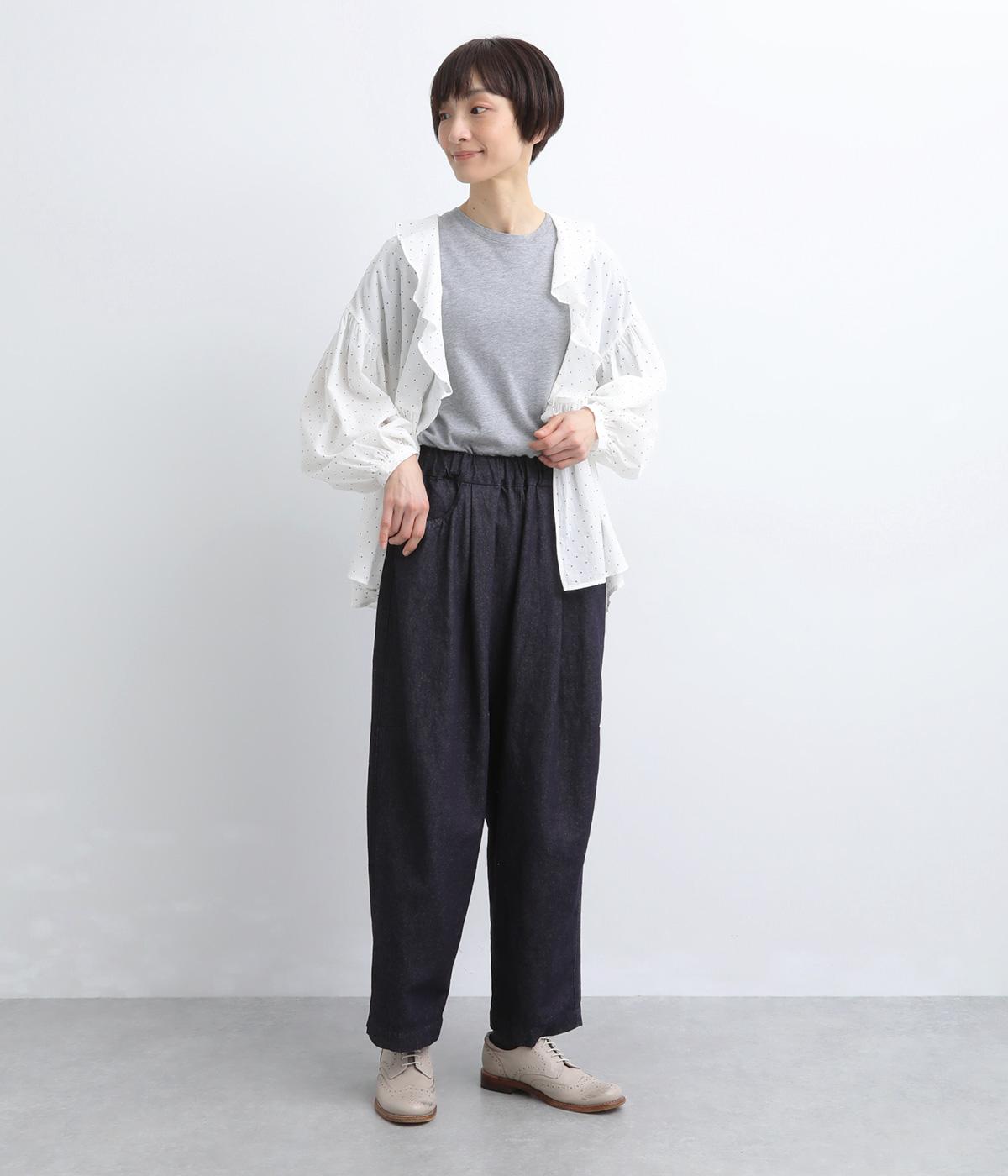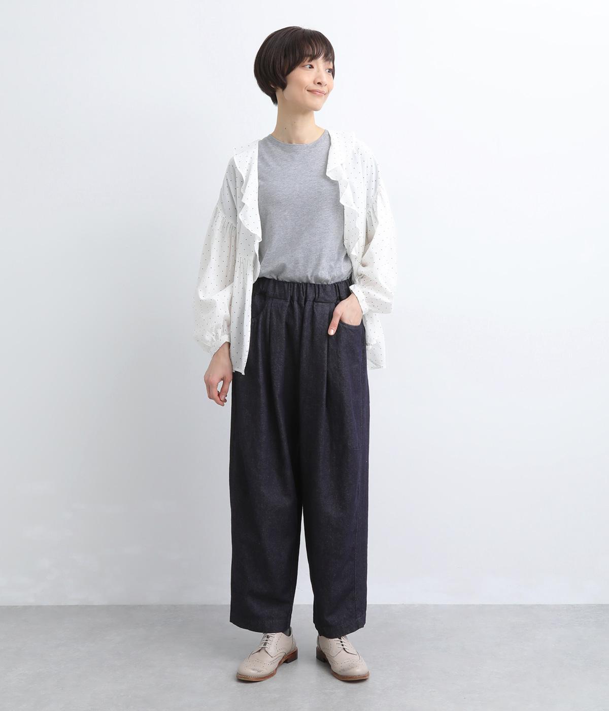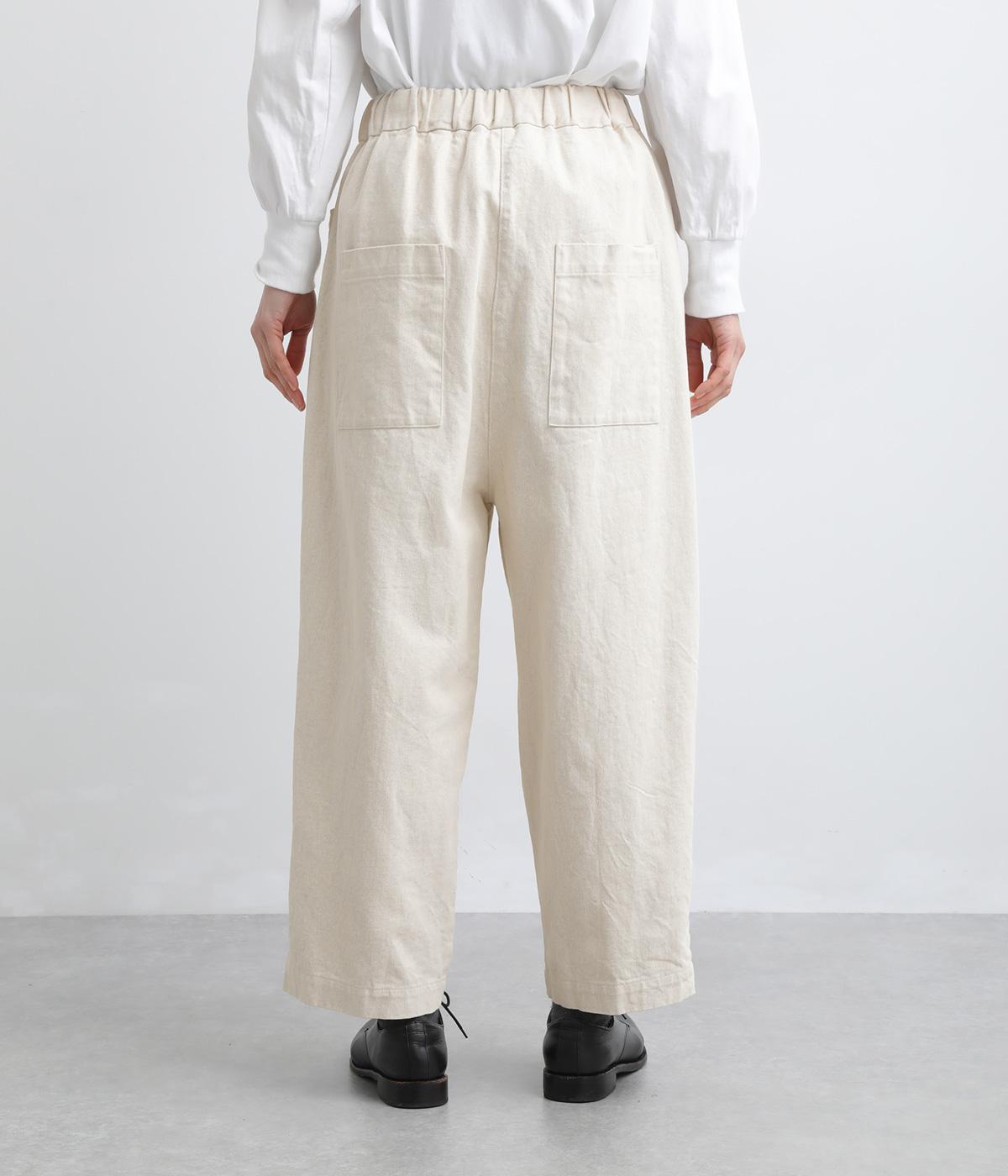 タックを入れて腰まわりはふっくらと、裾に向かってゆるくしぼったワイドテーパードパンツ。ひざ部分にダーツを入れることで自然な立体感あるシルエットに仕立てています。低めのヒップポケットも◎。ウエストはフィット感のいい総平ゴムに調整紐入り。