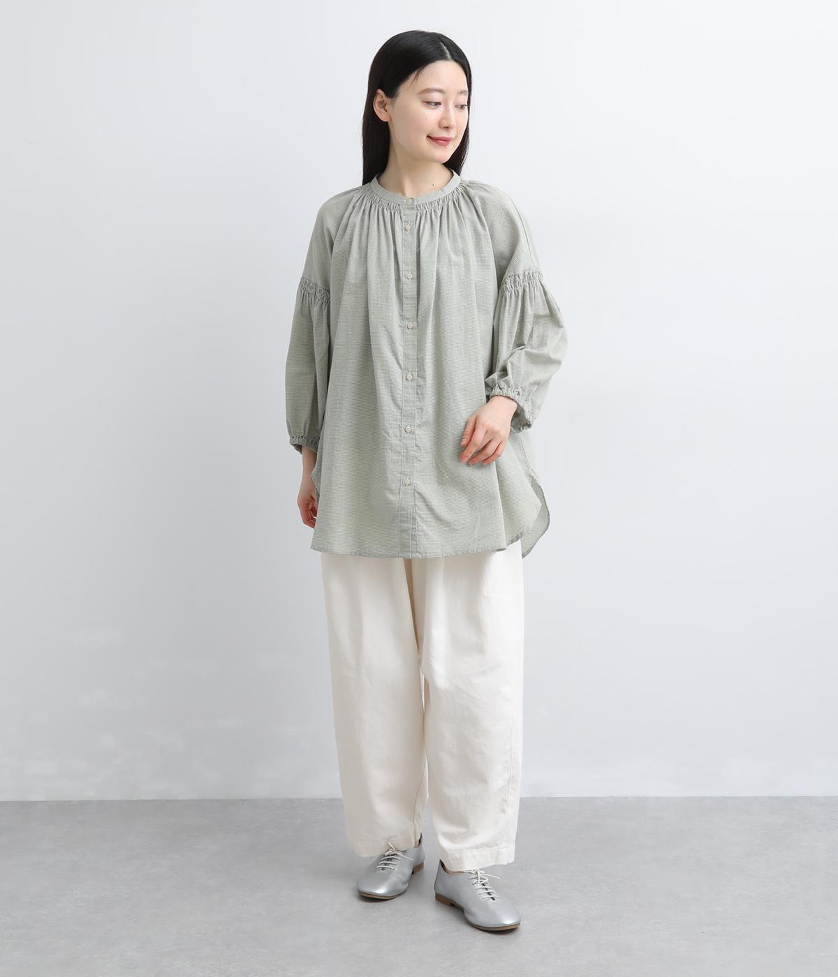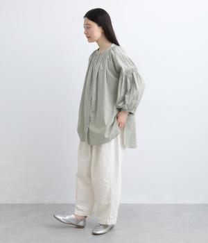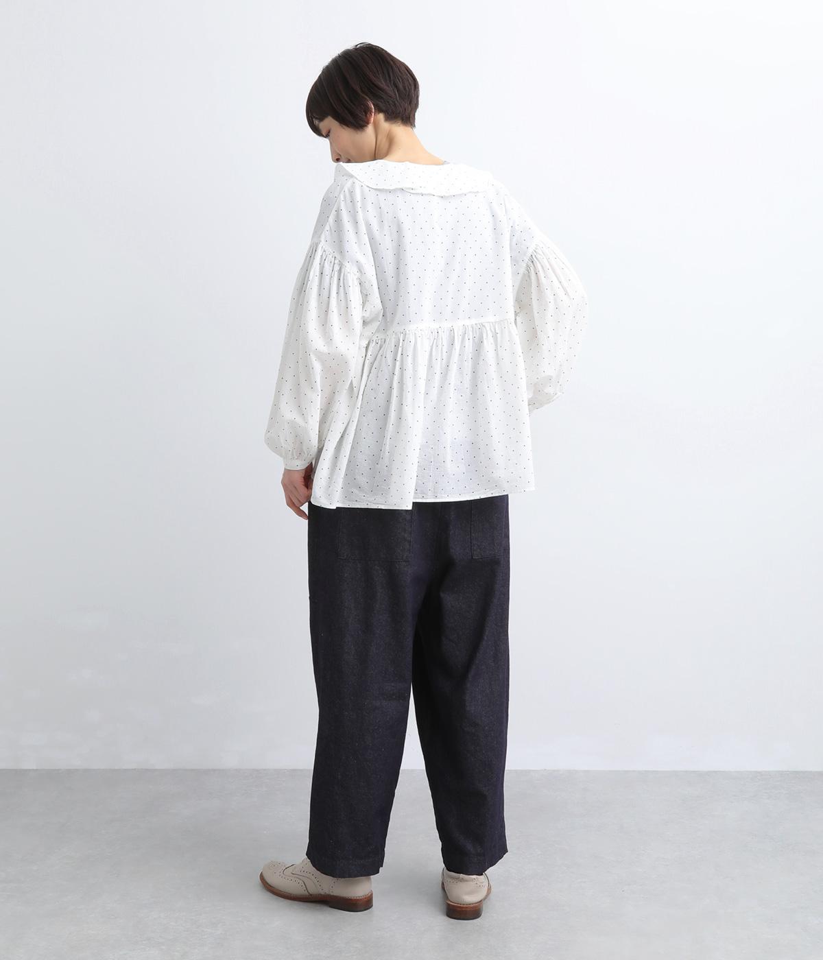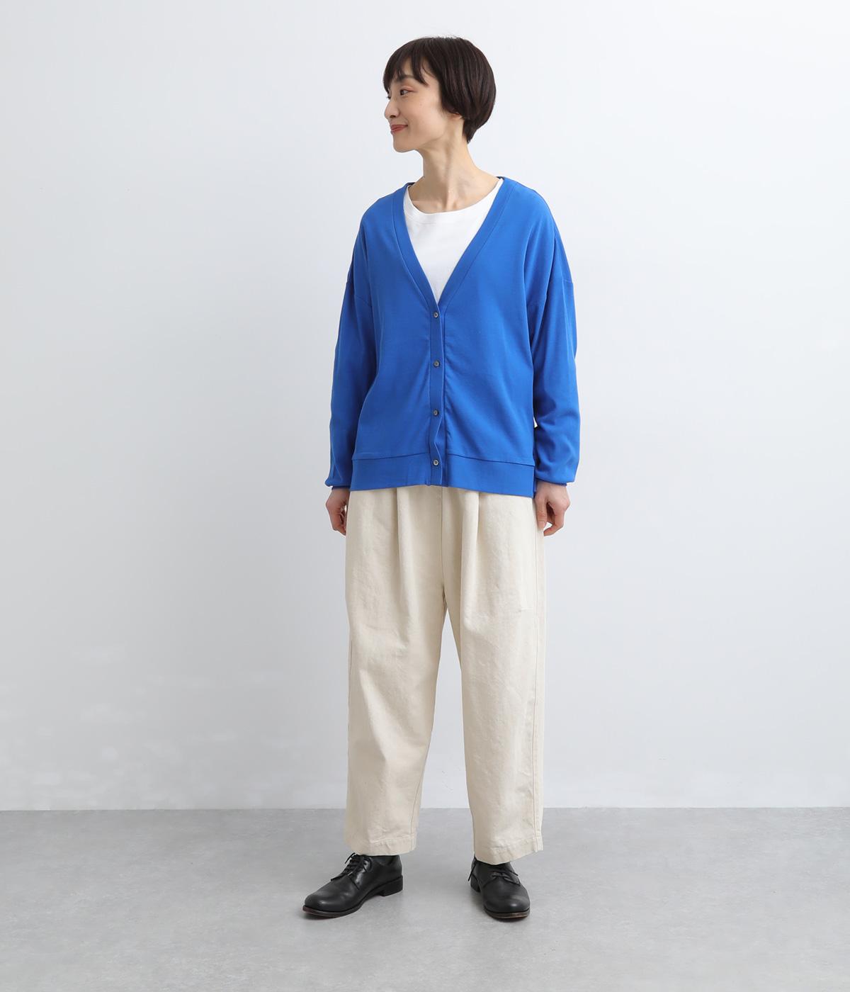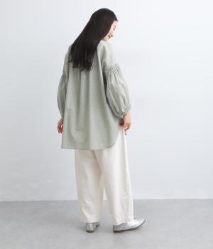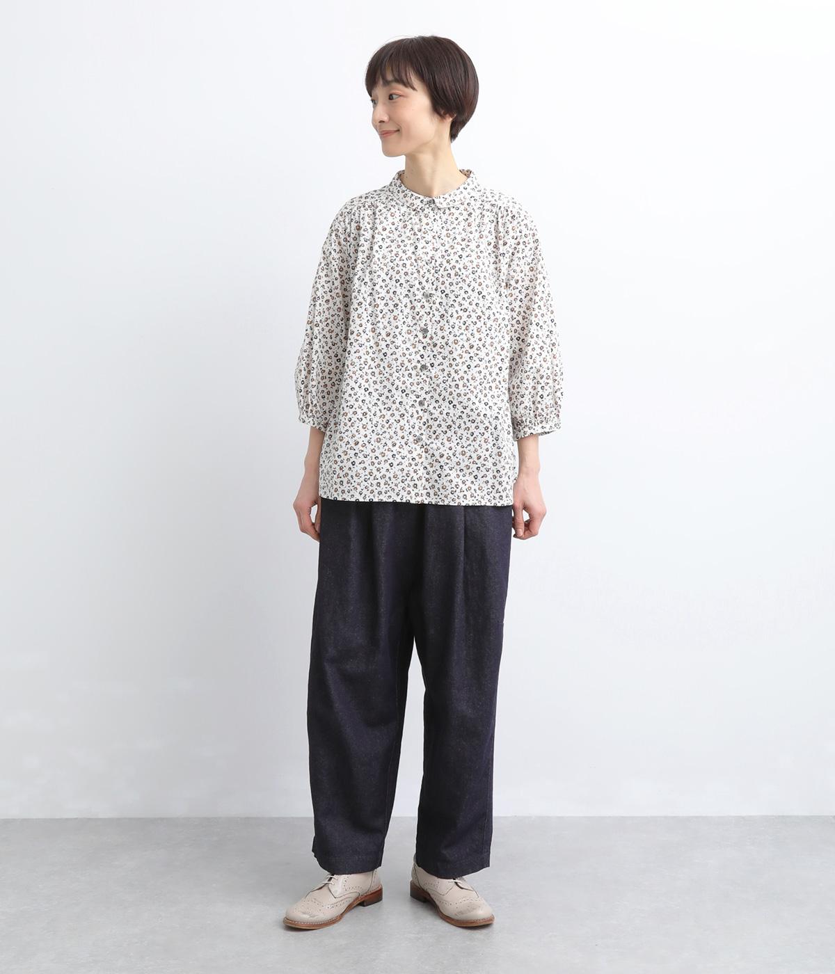 タックを入れて腰まわりはふっくらと、裾に向かってゆるくしぼったワイドテーパードパンツ。ひざ部分にダーツを入れることで自然な立体感あるシルエットに仕立てています。低めのヒップポケットも◎。ウエストはフィット感のいい総平ゴムに調整紐入り。