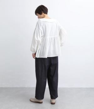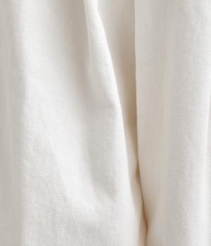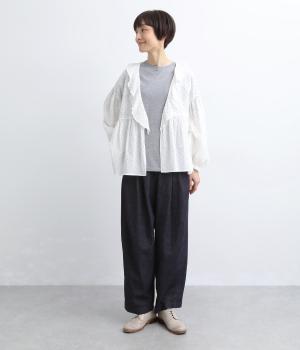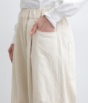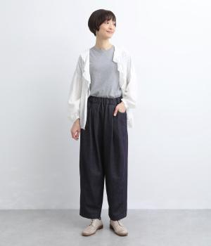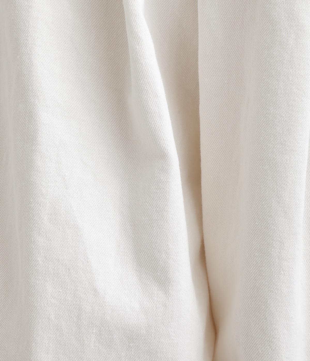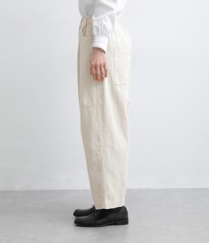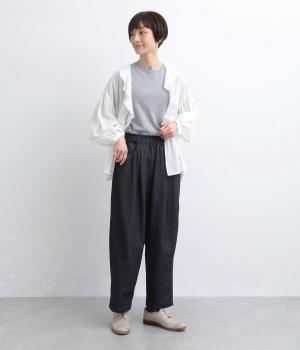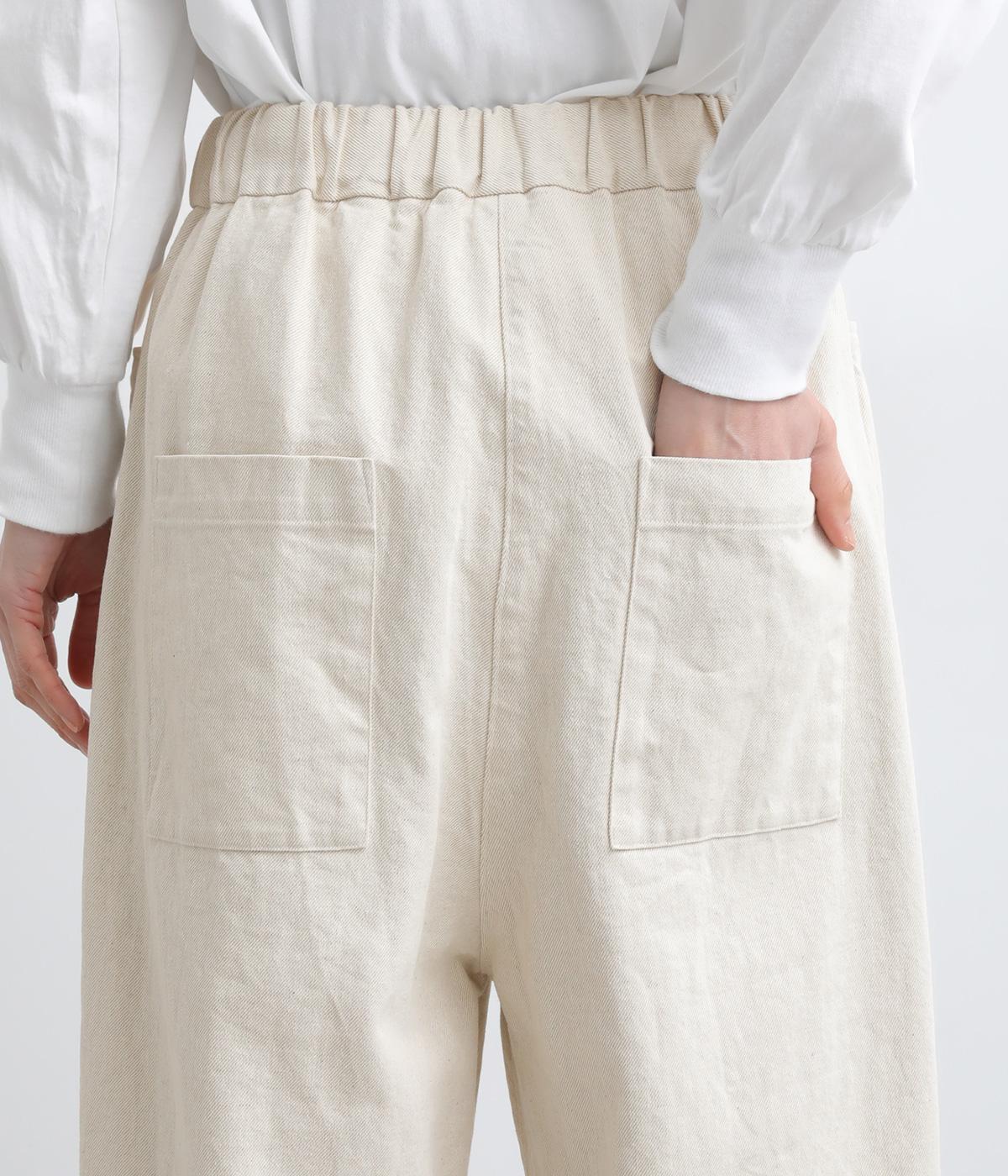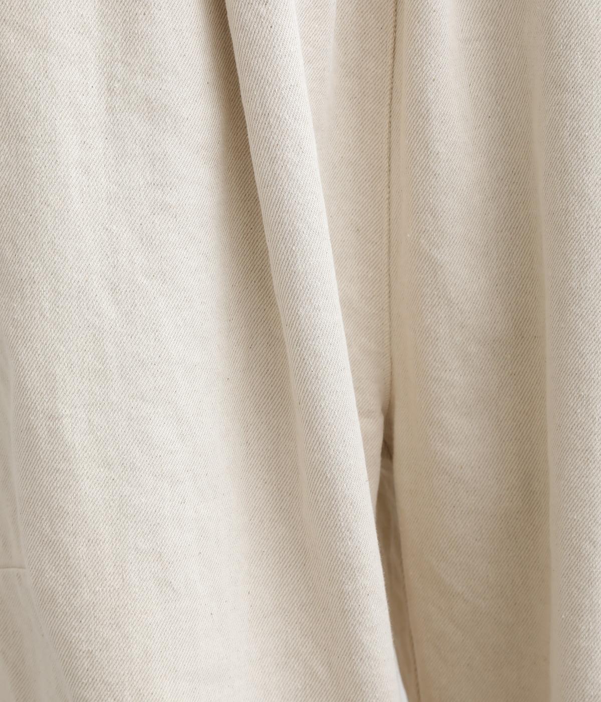 ナチュラルな風合いが心地よいコットンリネンデニムを使用。タフなコシ感を残しながらも着用初期からはきやすく、使い勝手のいい中厚手生地でロングシーズン活躍します。
