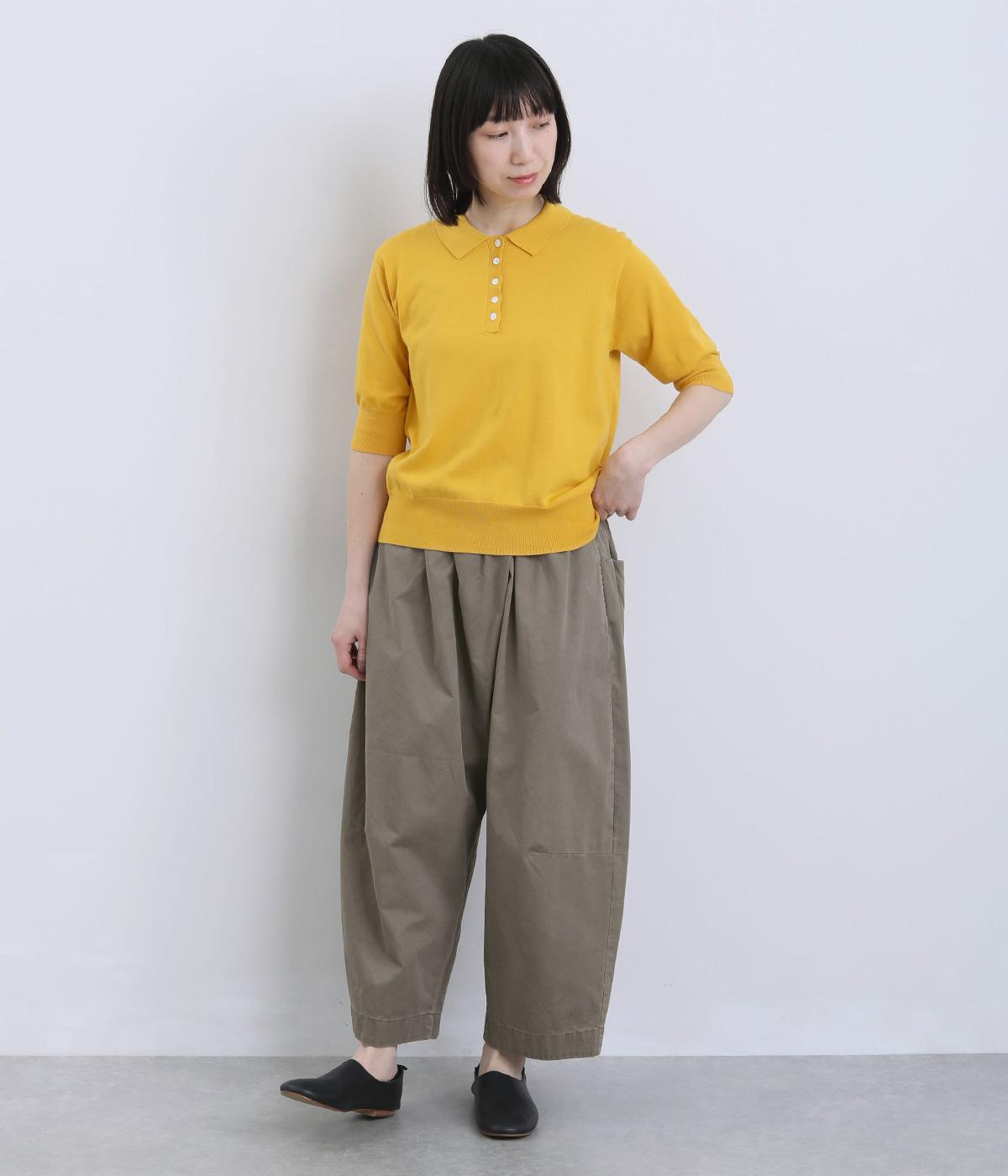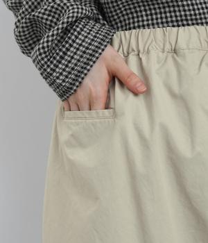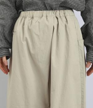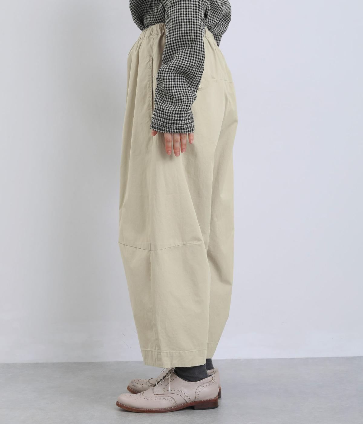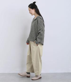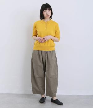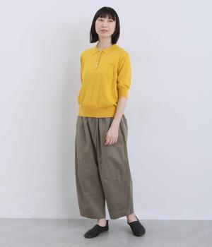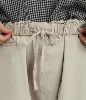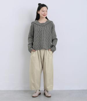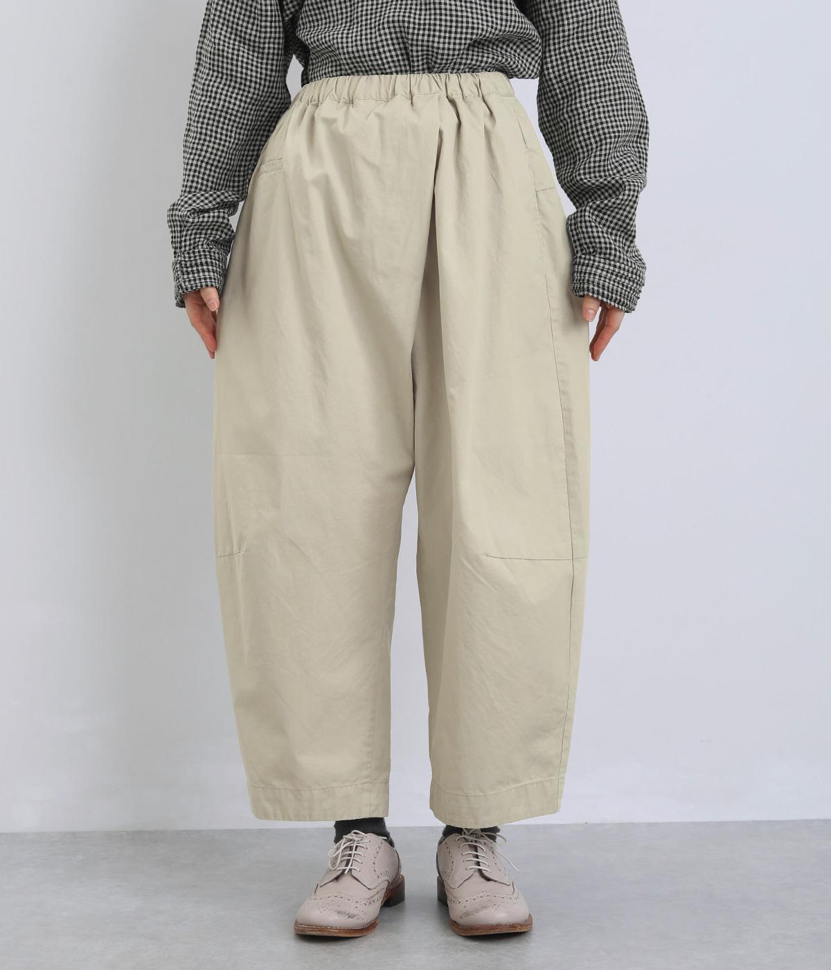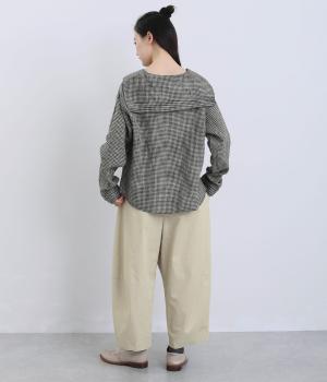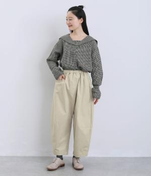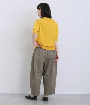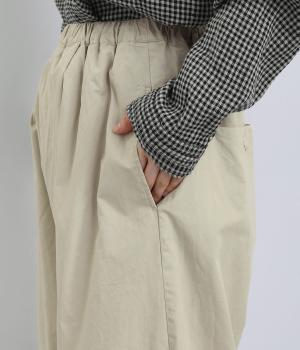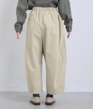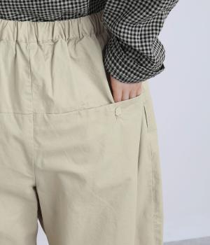 ななめに布を重ねたフロントのデザインが、さりげない洒落感を添えるパンツ。ヒップまわりにはゆとりを持たせながら、ウエストはゴム仕様でリラックスしたはき心地です。バックの切り替えラインがうしろ姿のアクセントとなり、シンプルながらも個性を感じる仕上がりに。
