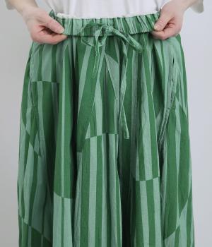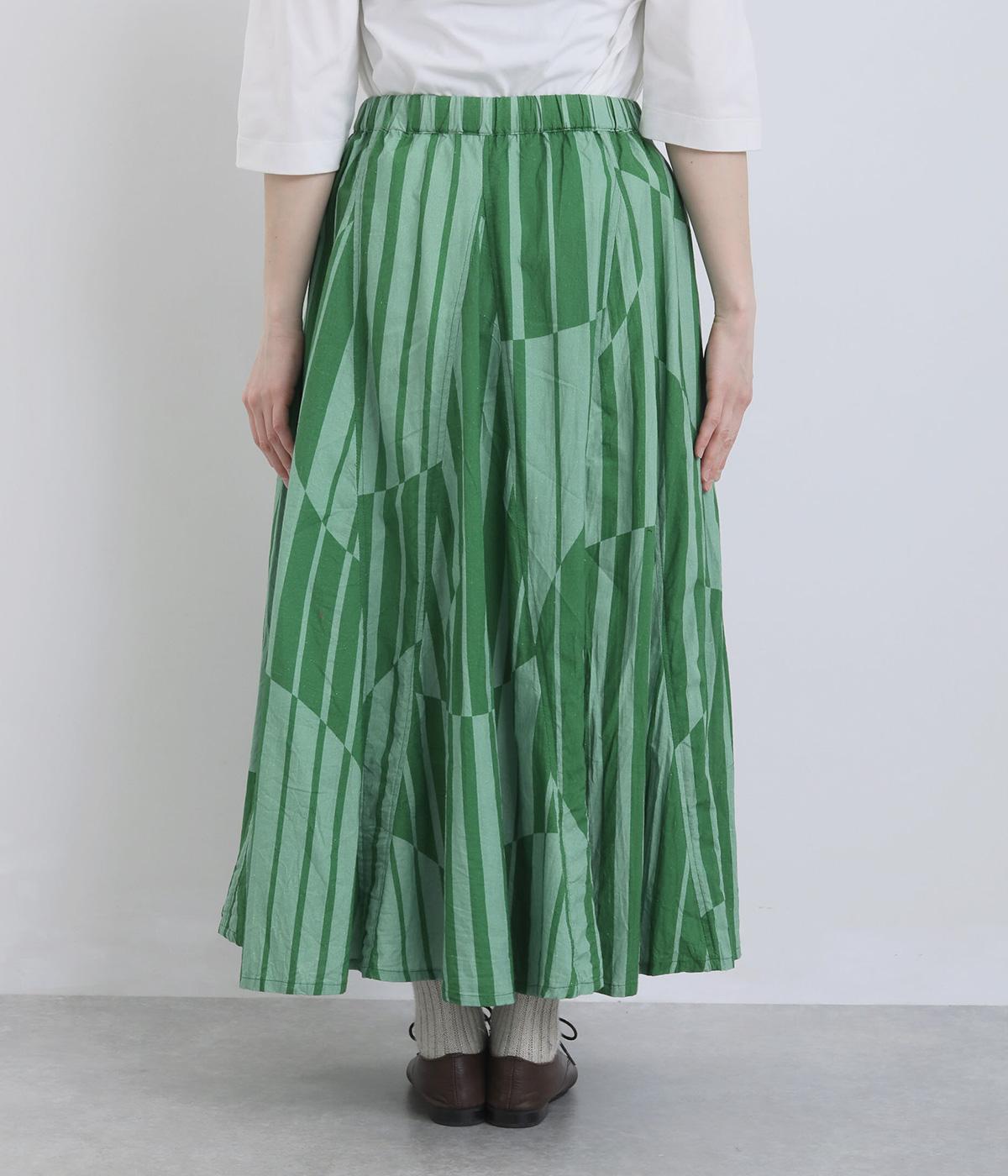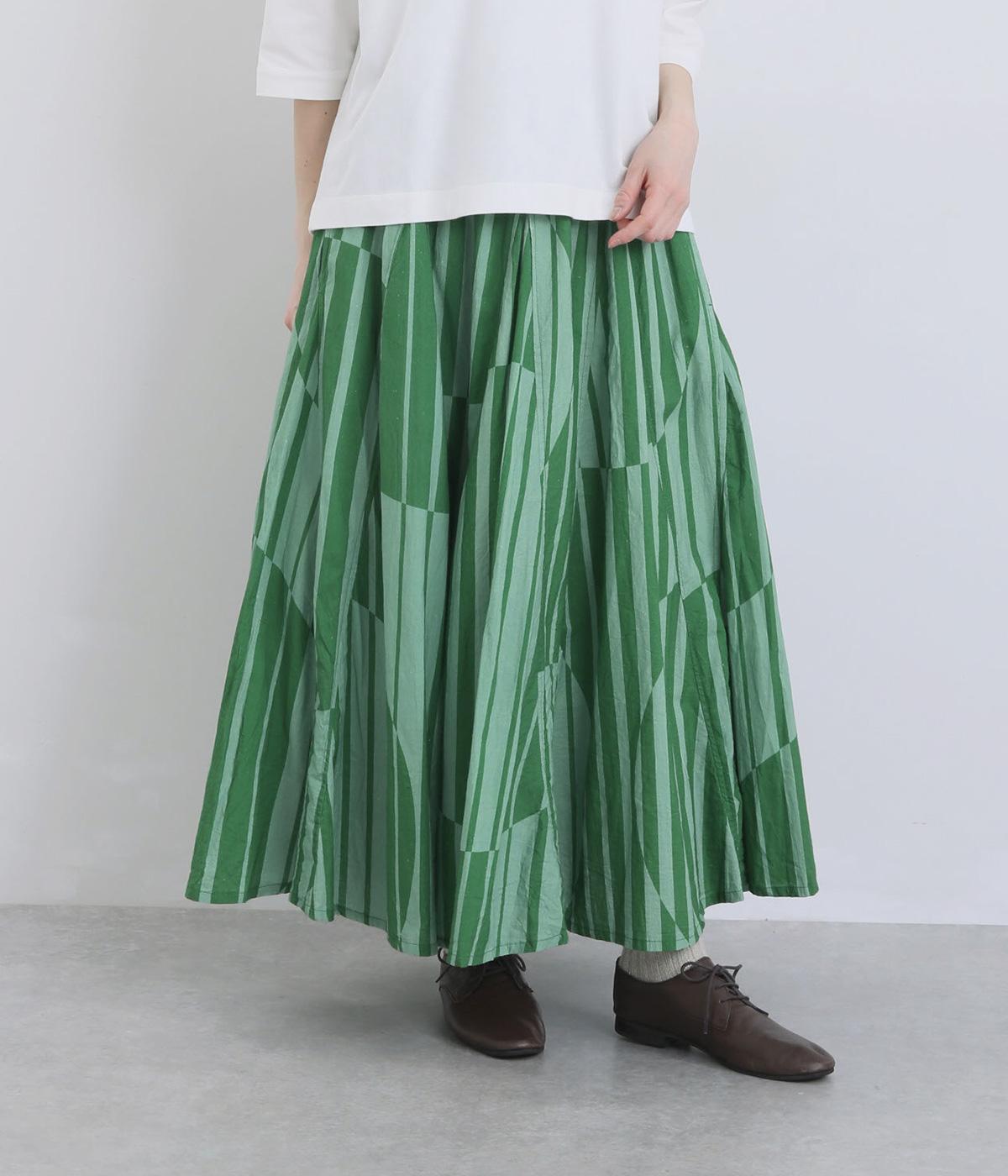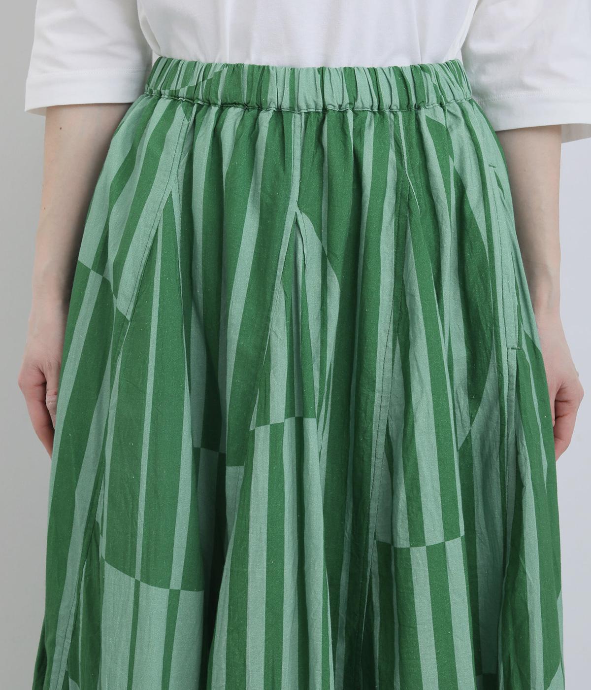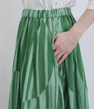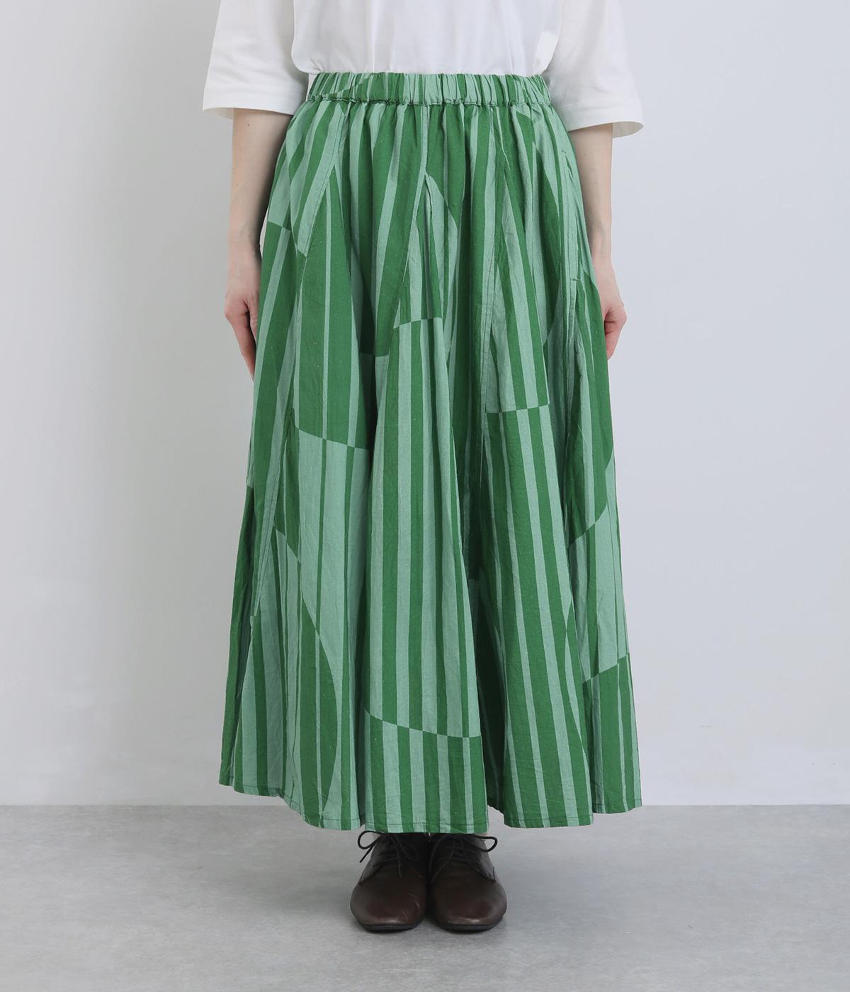 生地をジグザグに切り替えることで、柄の表情を引き立てたサーキュラースカートです。大柄のストライプとドットが重なり合い、視線を引きつける立体感を生み出します。動きに合わせてゆれるシルエットが美しく、シンプルなトップスと合わせるだけで華やかなコーディネートが完成します。