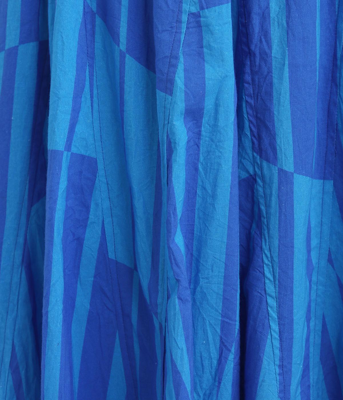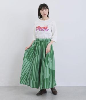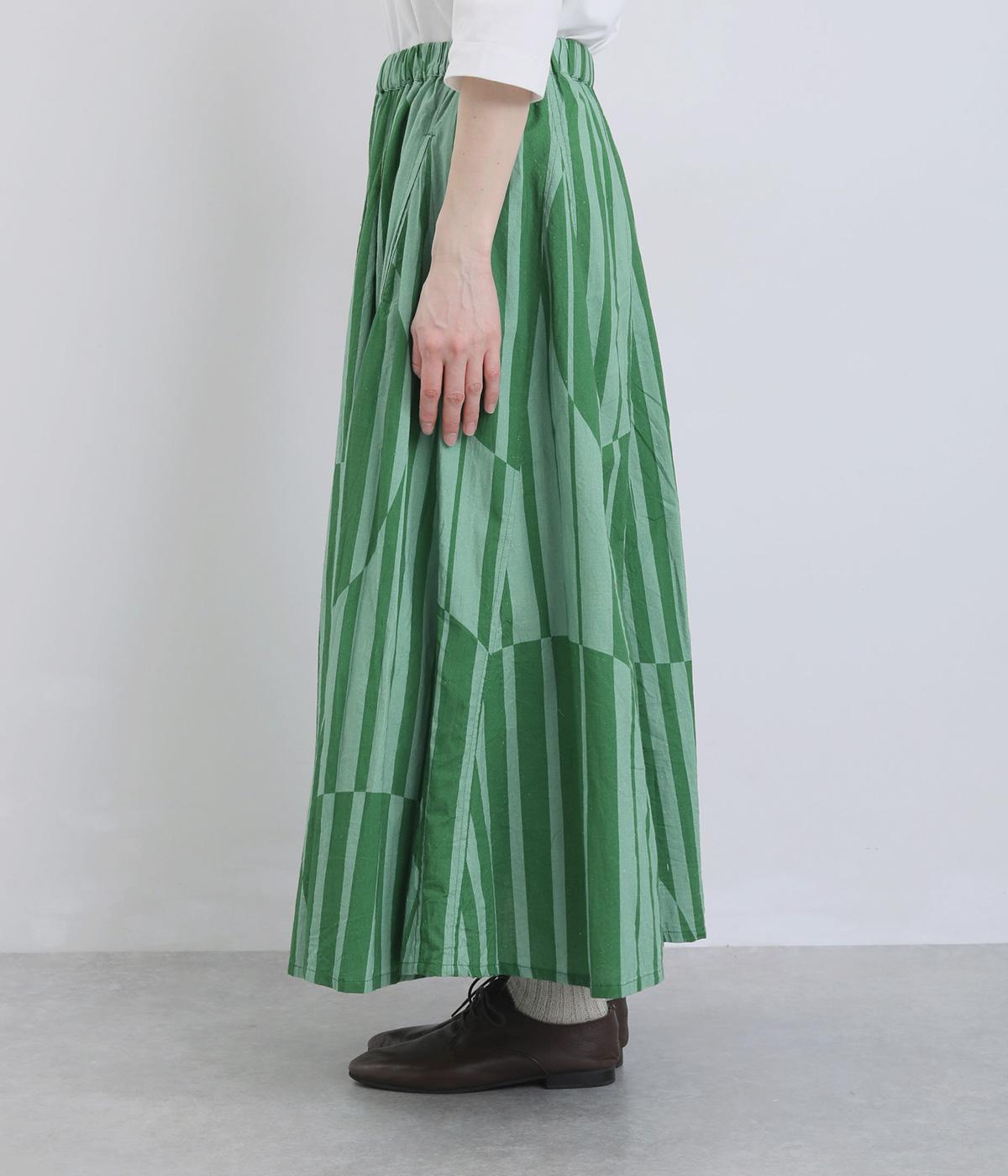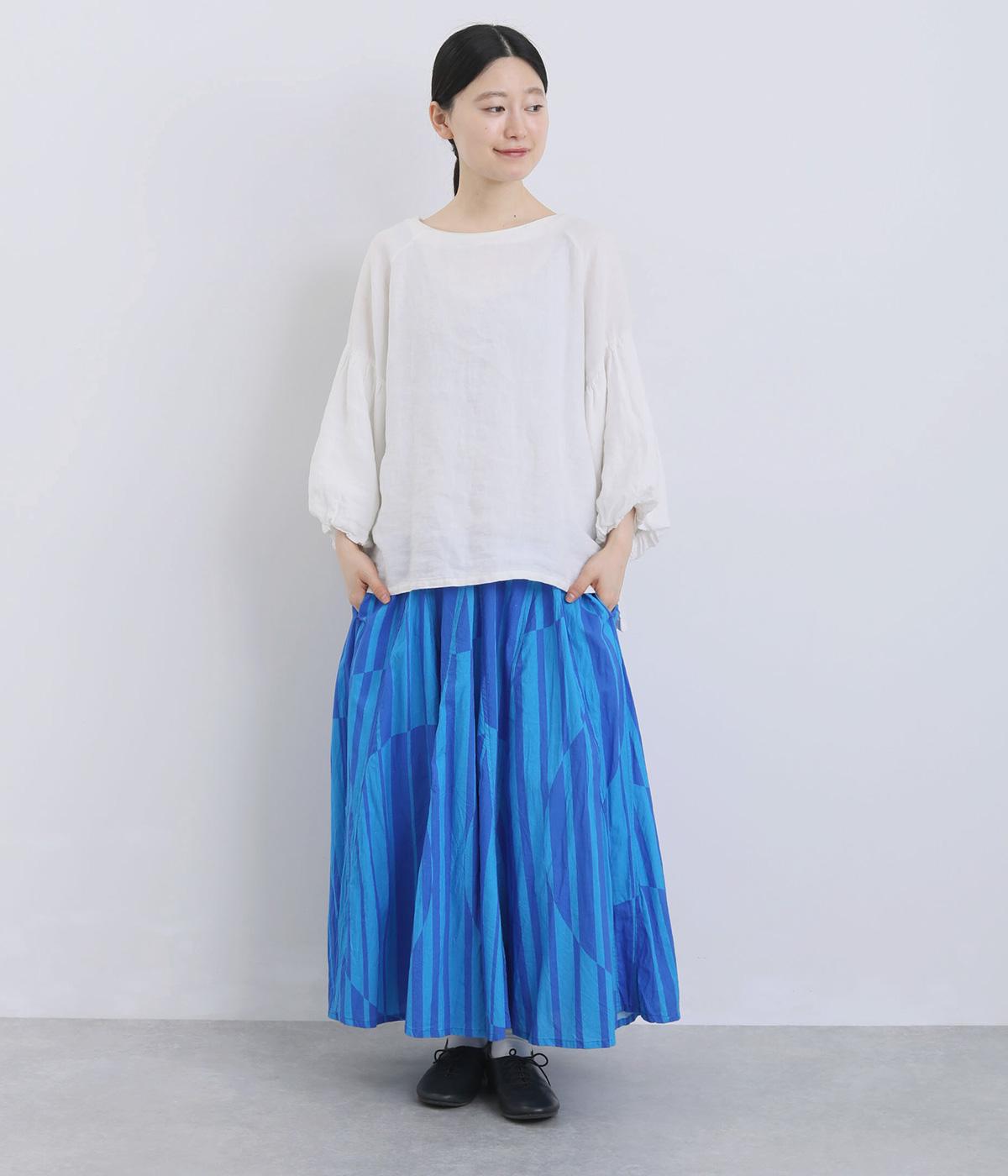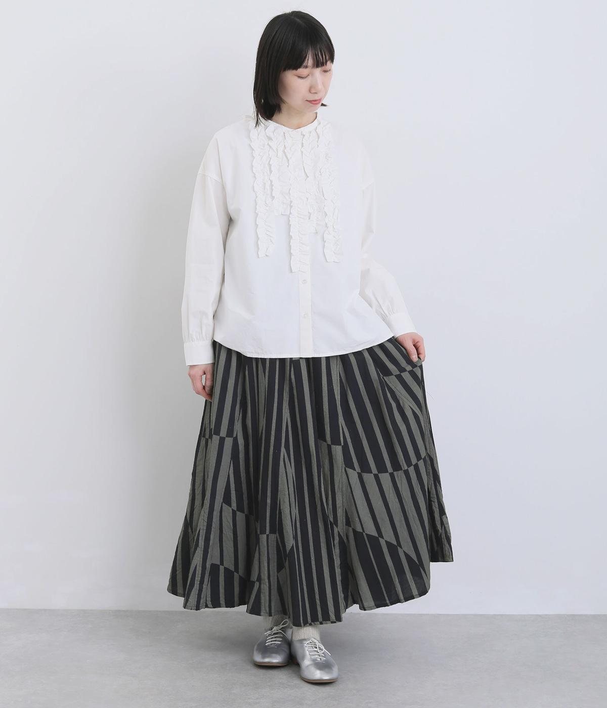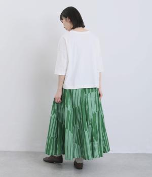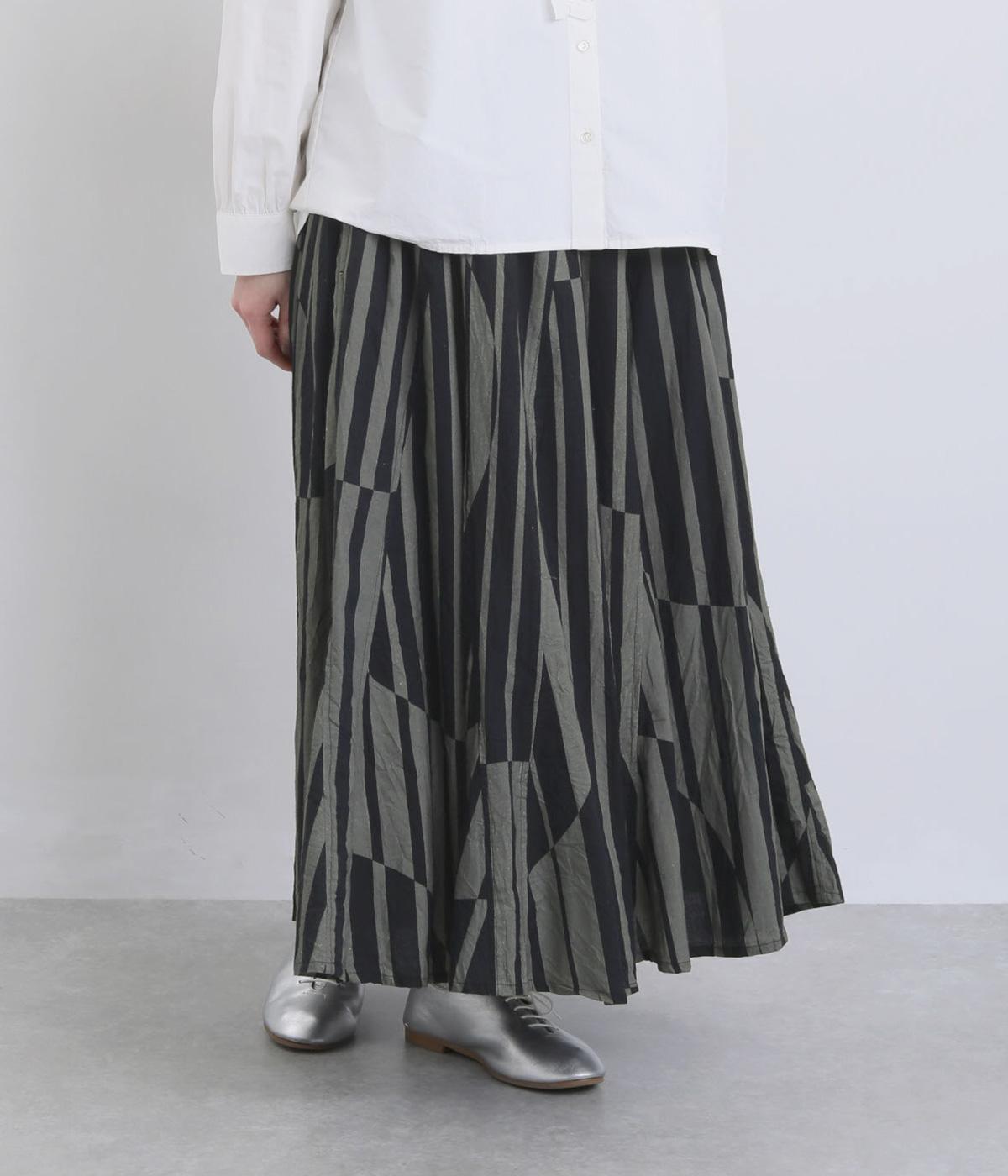 生地をジグザグに切り替えることで、柄の表情を引き立てたサーキュラースカートです。大柄のストライプとドットが重なり合い、視線を引きつける立体感を生み出します。動きに合わせてゆれるシルエットが美しく、シンプルなトップスと合わせるだけで華やかなコーディネートが完成します。