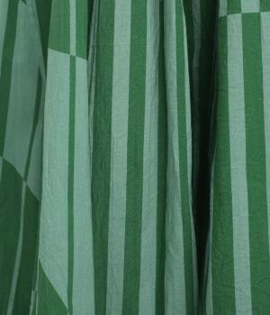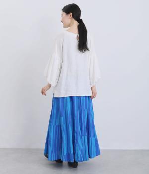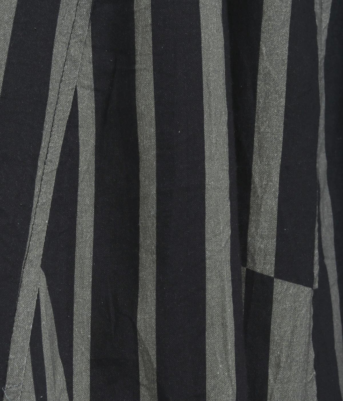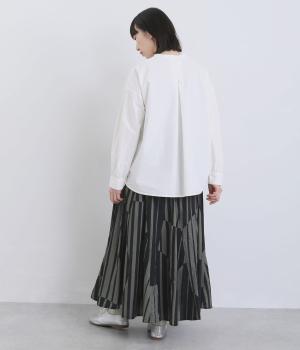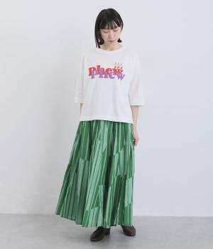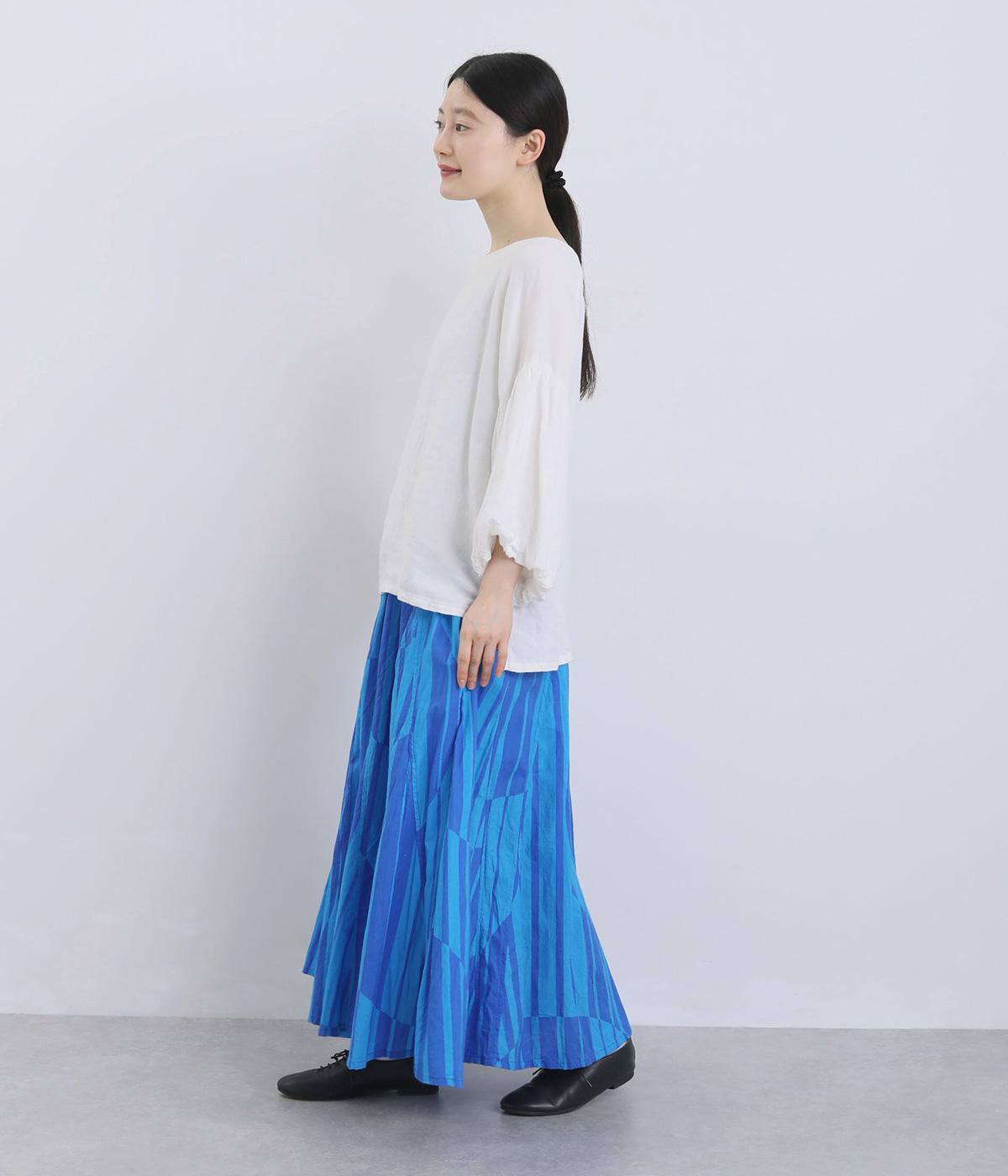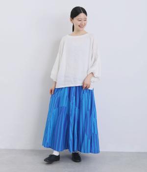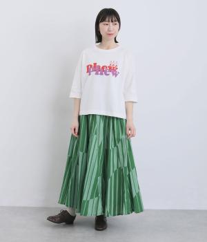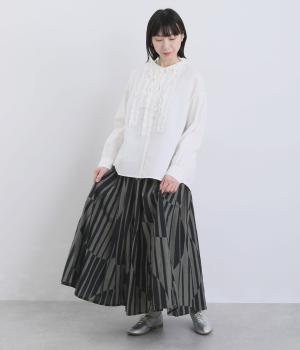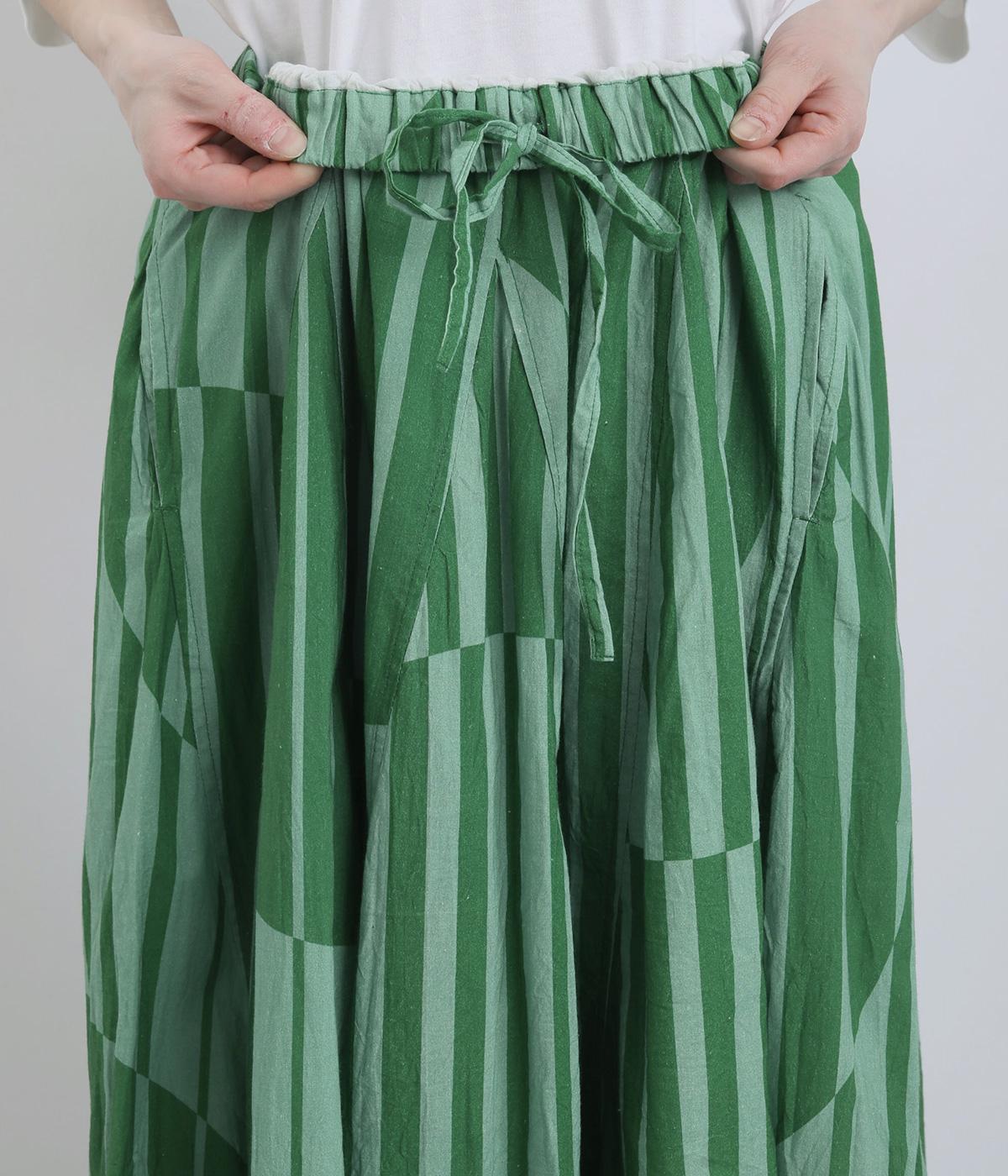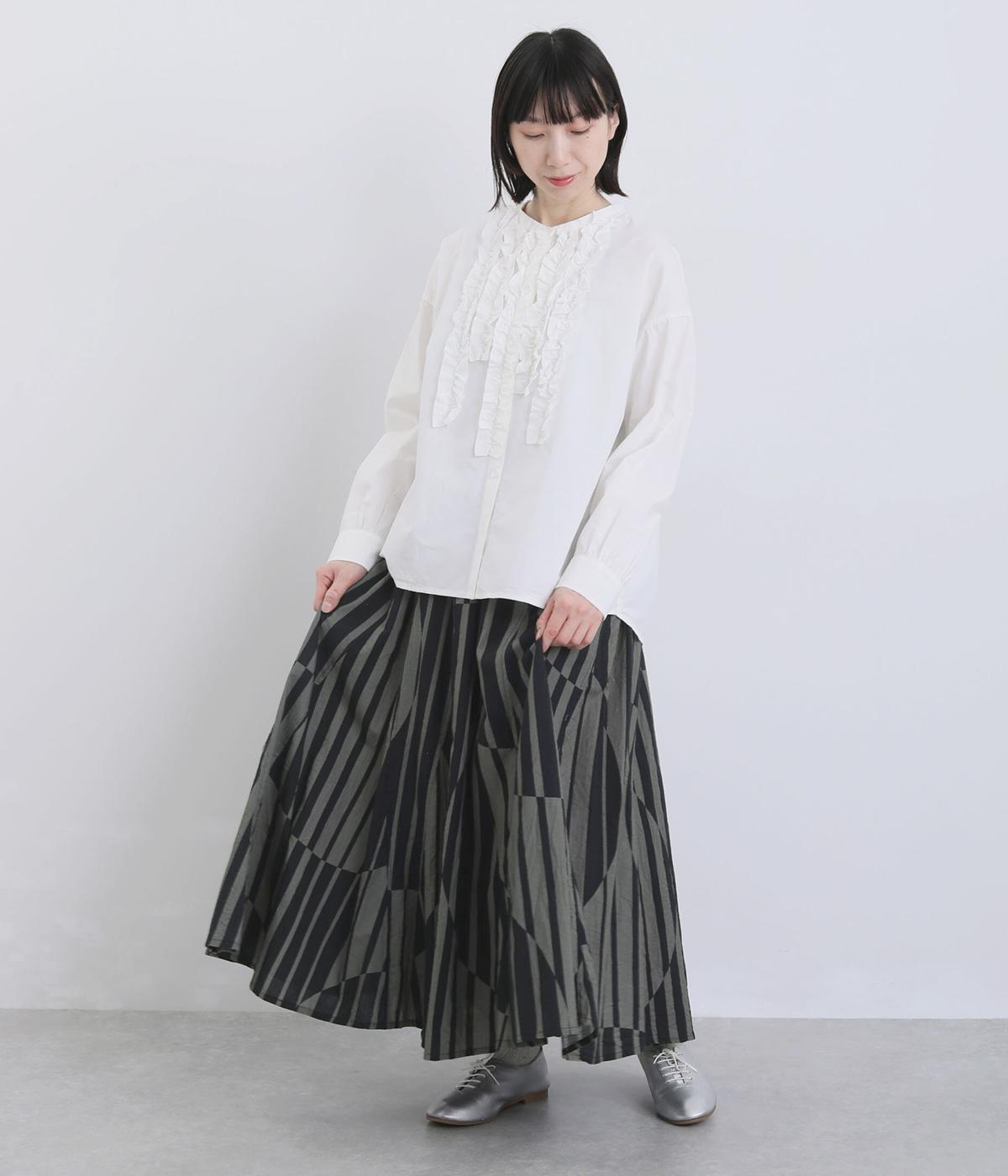 生地をジグザグに切り替えることで、柄の表情を引き立てたサーキュラースカートです。大柄のストライプとドットが重なり合い、視線を引きつける立体感を生み出します。動きに合わせてゆれるシルエットが美しく、シンプルなトップスと合わせるだけで華やかなコーディネートが完成します。