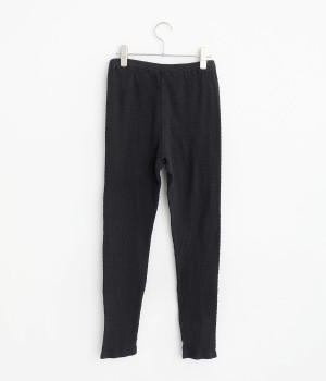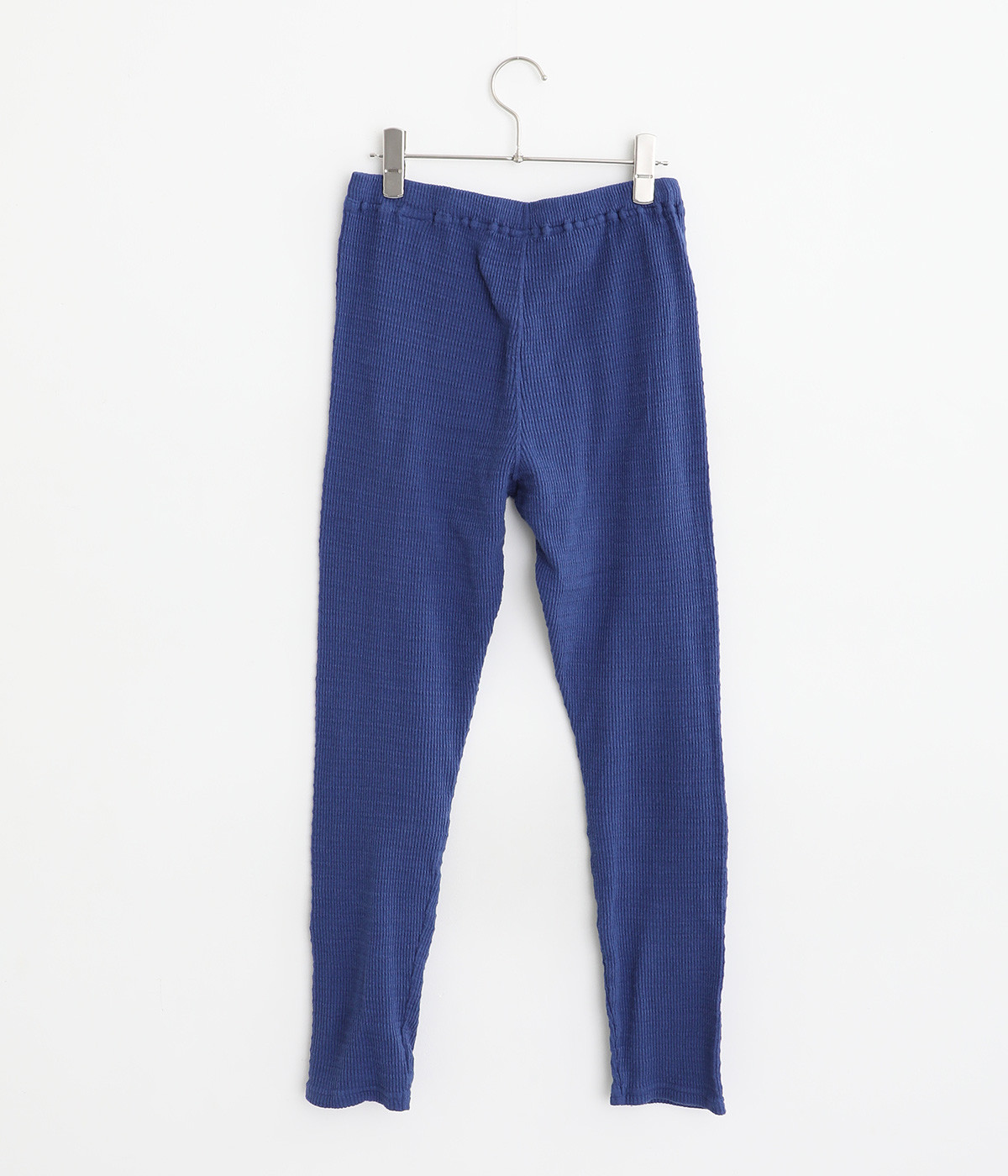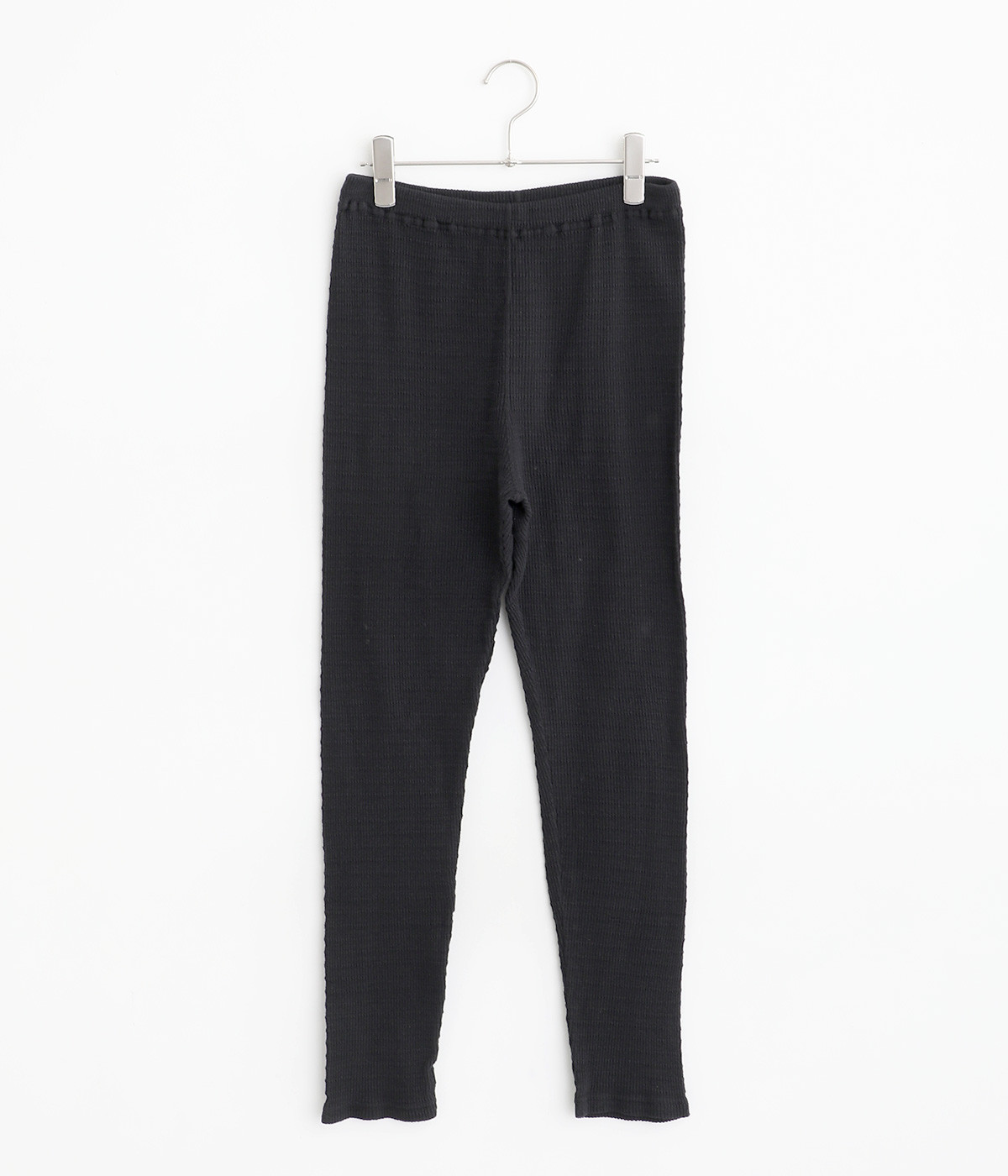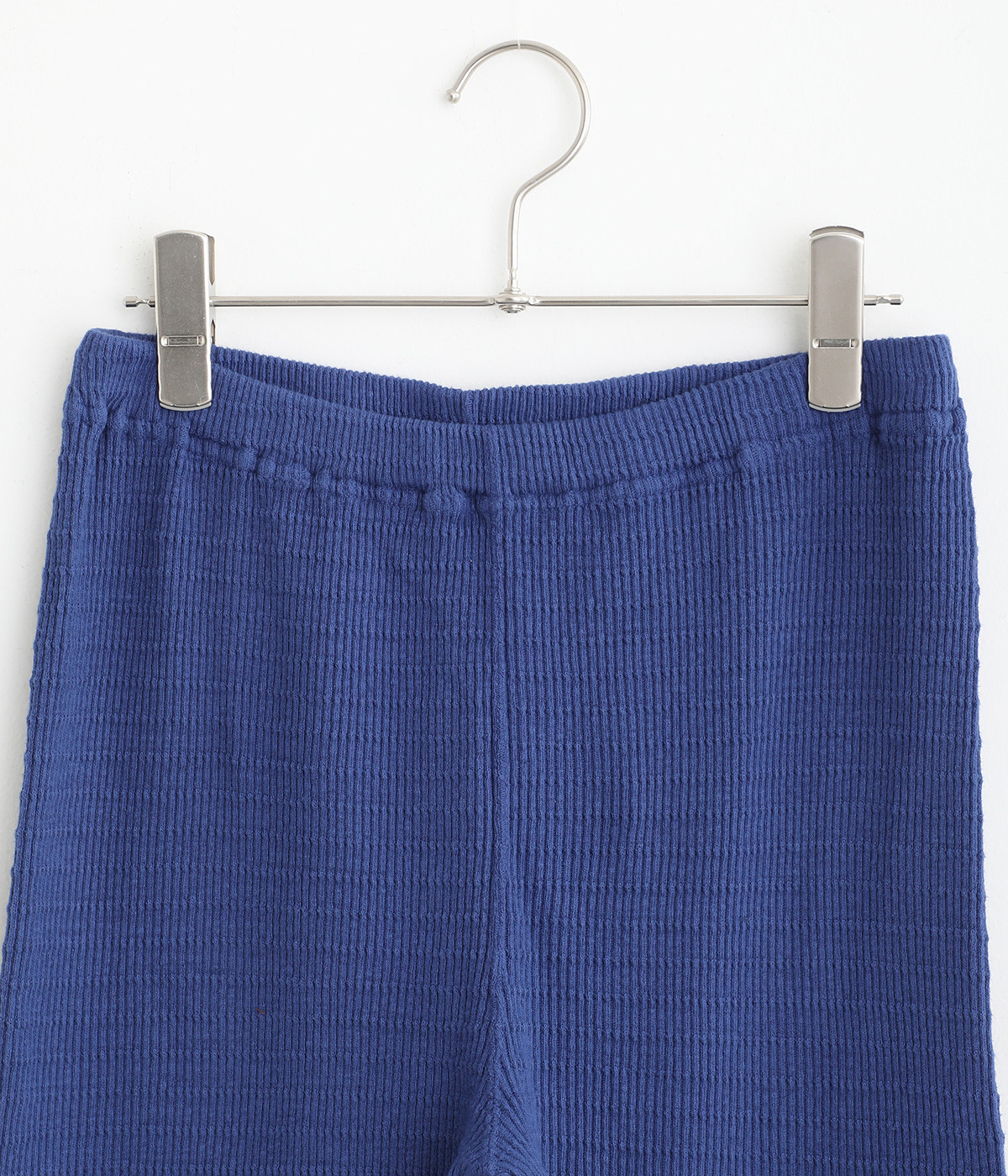 レイヤードスタイルに欠かせないスパッツにボーダー模様のテレコ生地で表情をもたせました。ボトムからのぞかせていいアクセントをつけてくれる名脇役的存在。裾はフィットしすぎず足首のラインをほのかにぼかします。ウエストは総平ゴム仕様です。