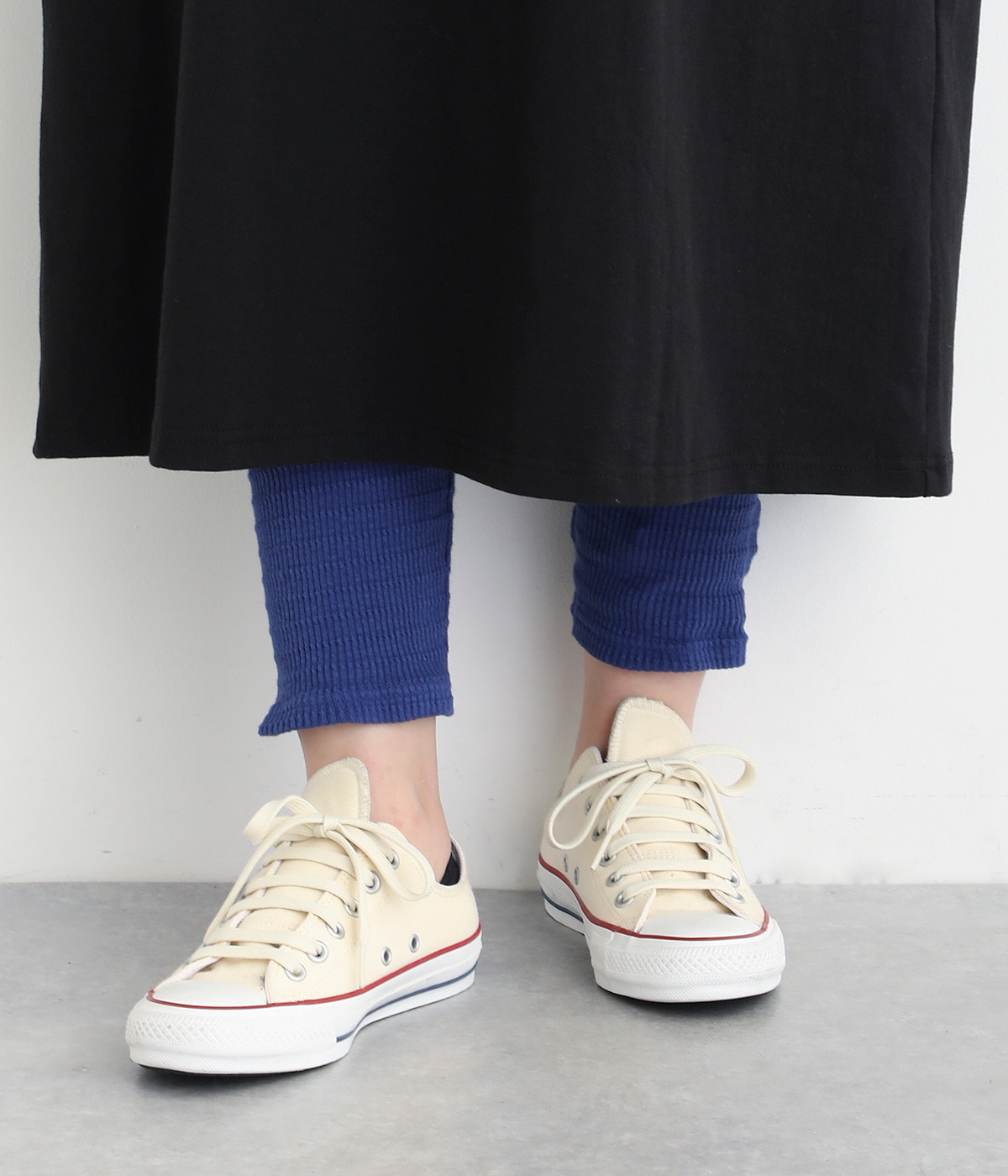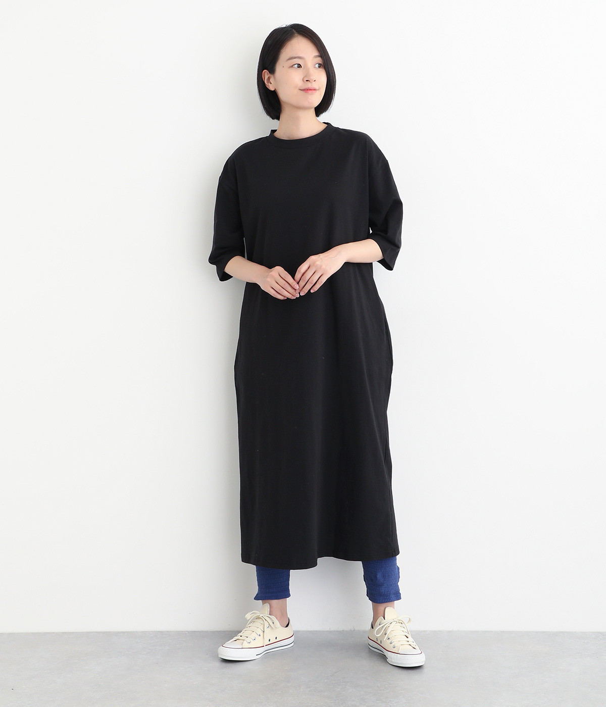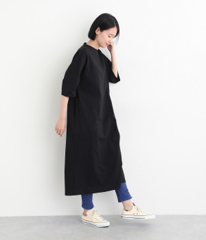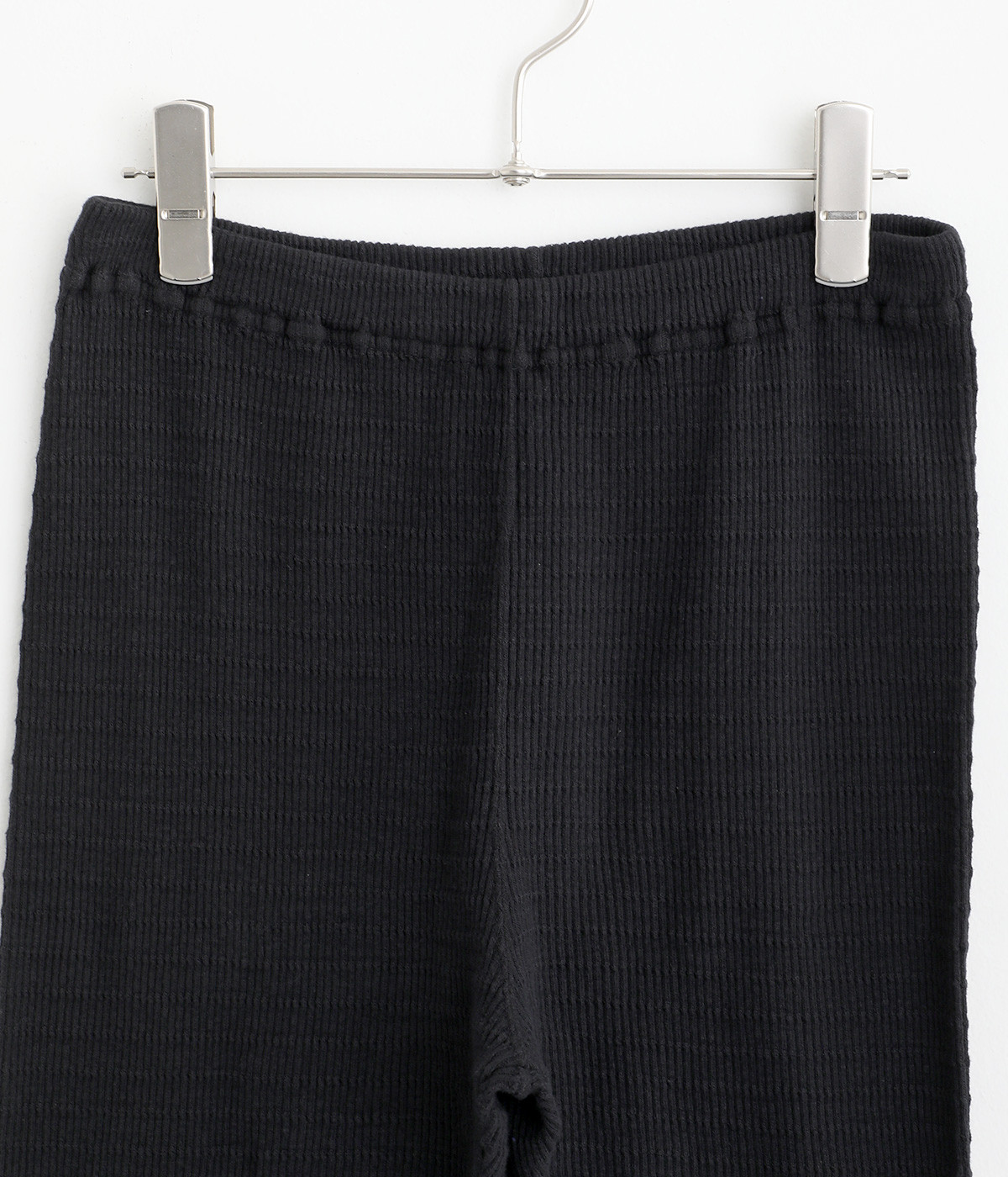 レイヤードスタイルに欠かせないスパッツにボーダー模様のテレコ生地で表情をもたせました。ボトムからのぞかせていいアクセントをつけてくれる名脇役的存在。裾はフィットしすぎず足首のラインをほのかにぼかします。ウエストは総平ゴム仕様です。