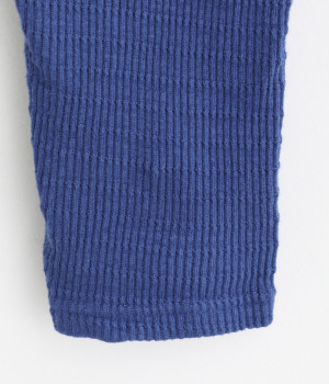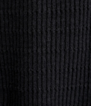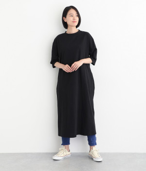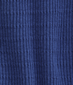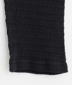 やわらかなムラ糸を使用したテレコ素材を採用しました。編み模様のボーダーでさり気なくアクセントをきかせています。製品染め加工による奥行きのある生地感も魅力です。