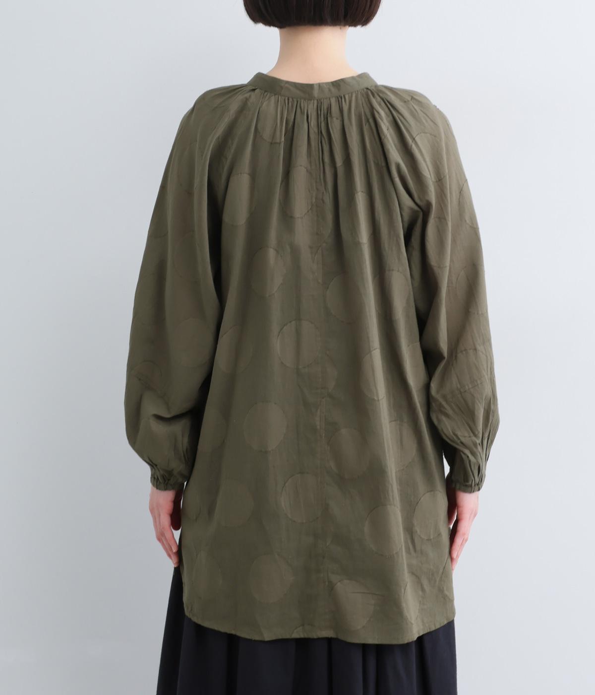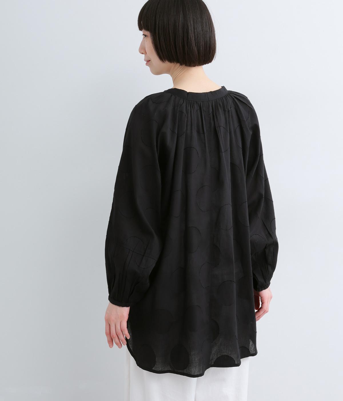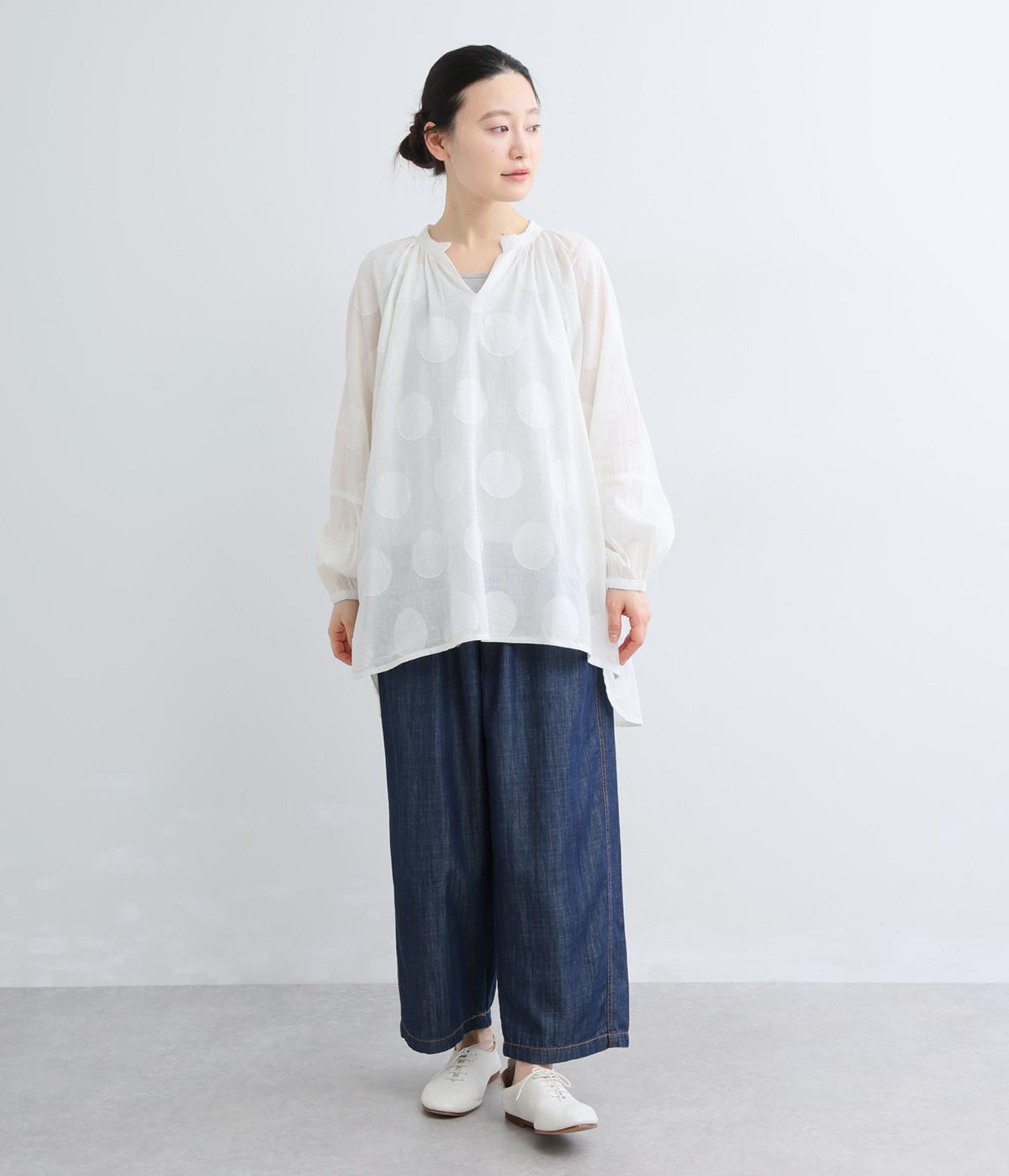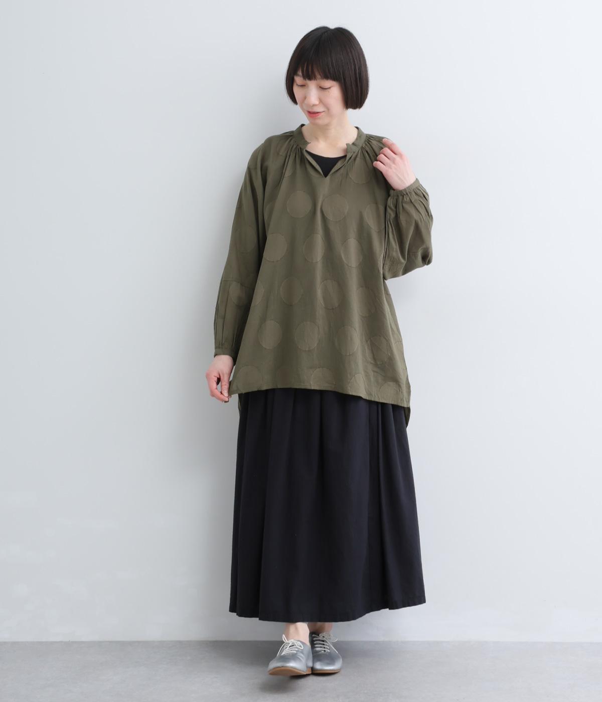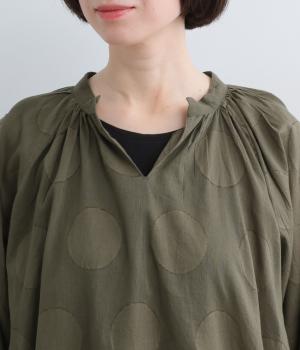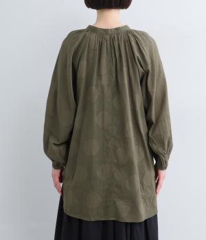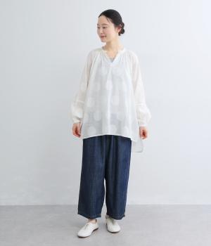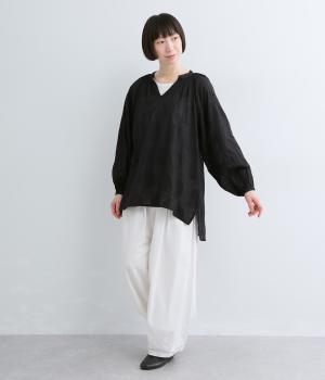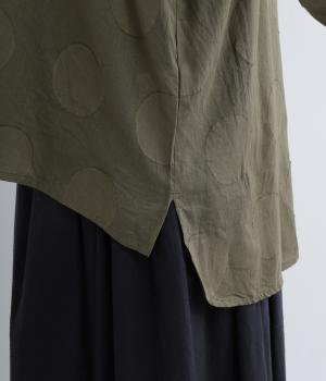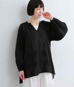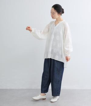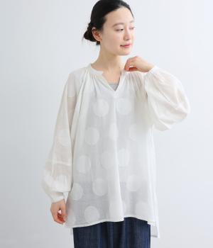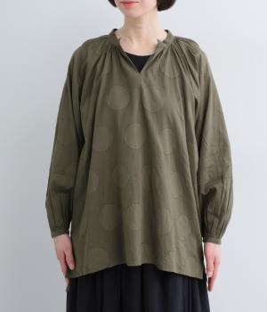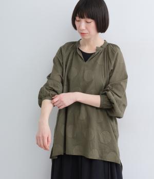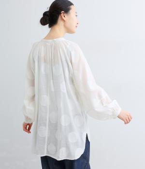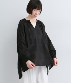 無地感覚で着こなしやすくも表情をつけてくれるドットジャカードのブラウス。空気を含んだようにふわりと軽やかなシルエットは、スキッパーカラーで抜け感をプラス。袖口は部分的にゴムを入れているのでたくし上げもおすすめ。