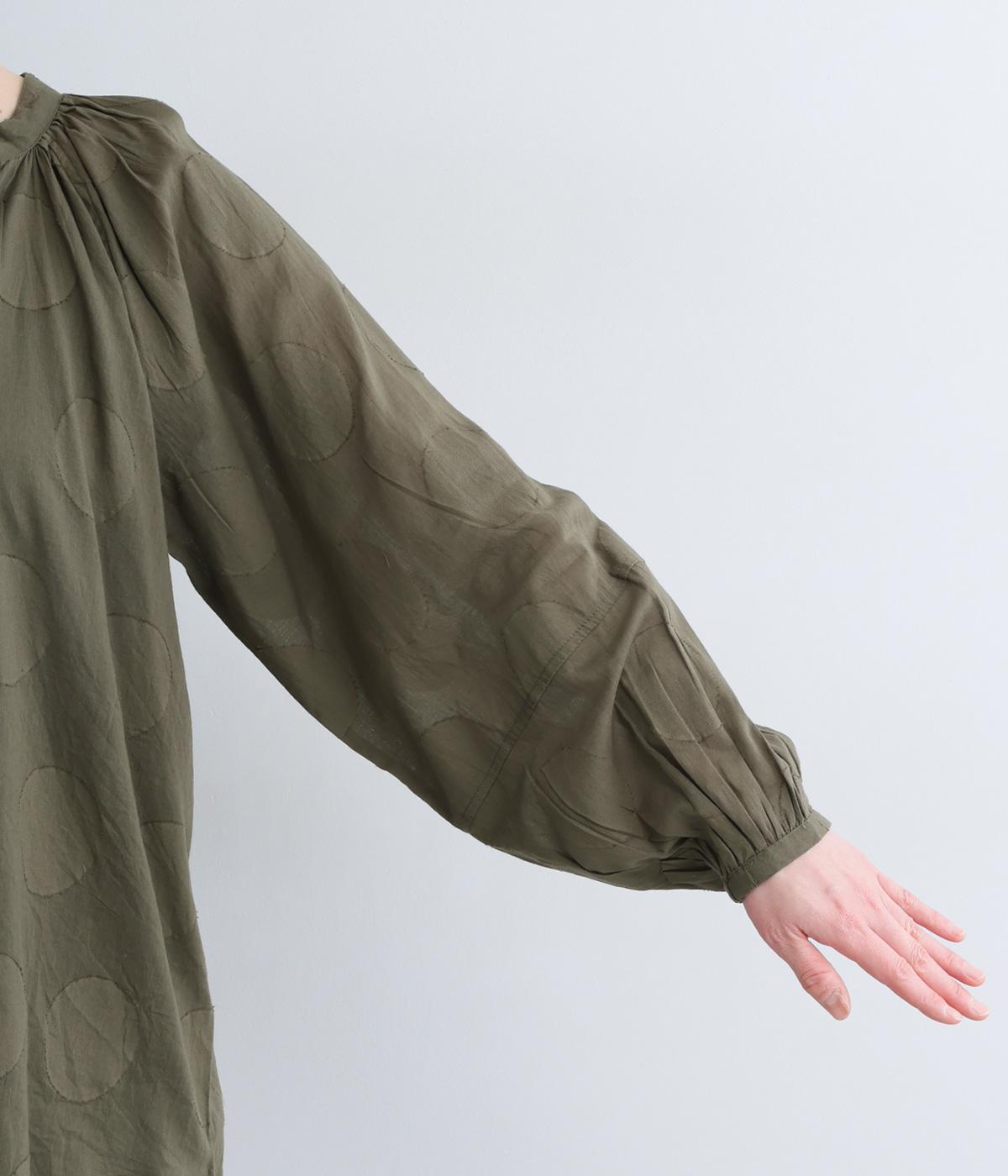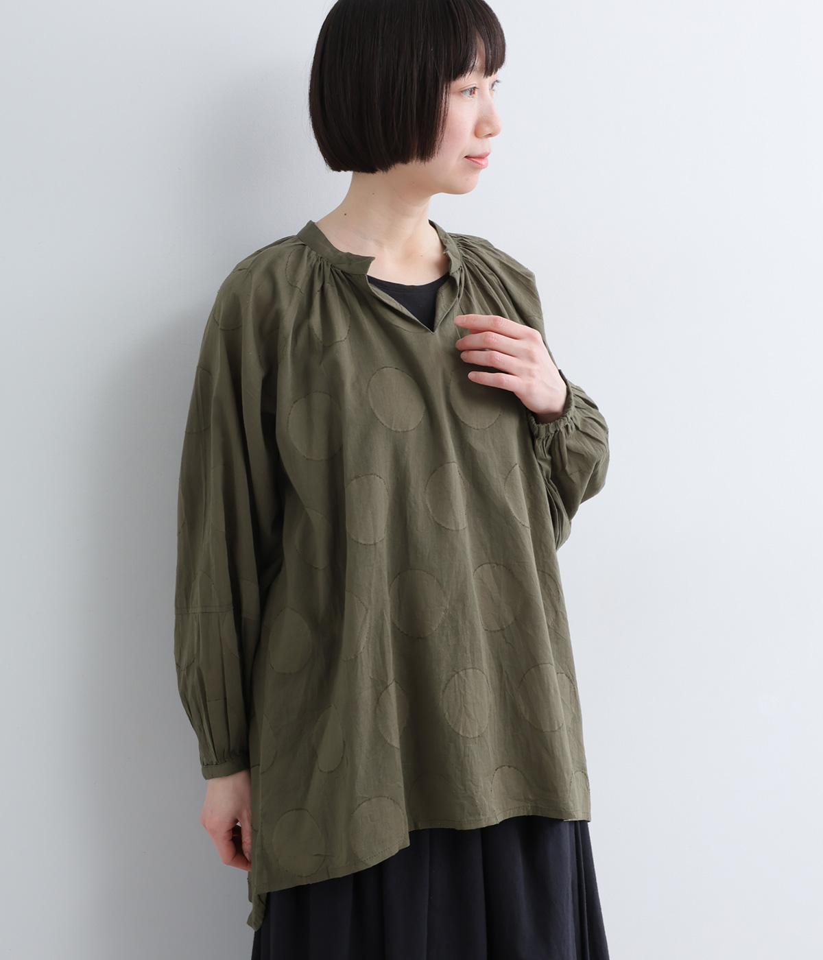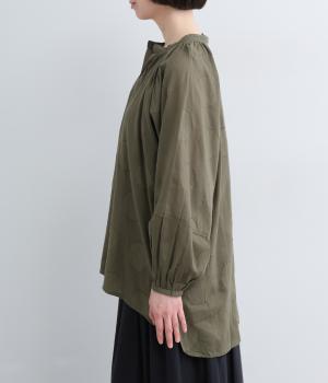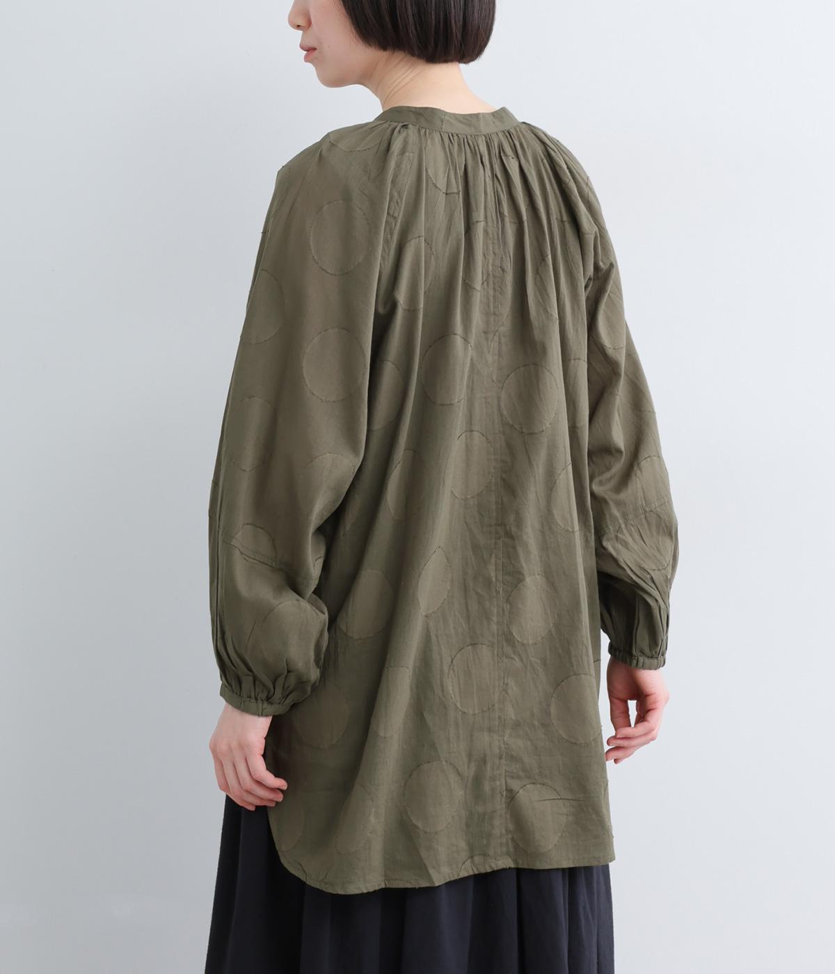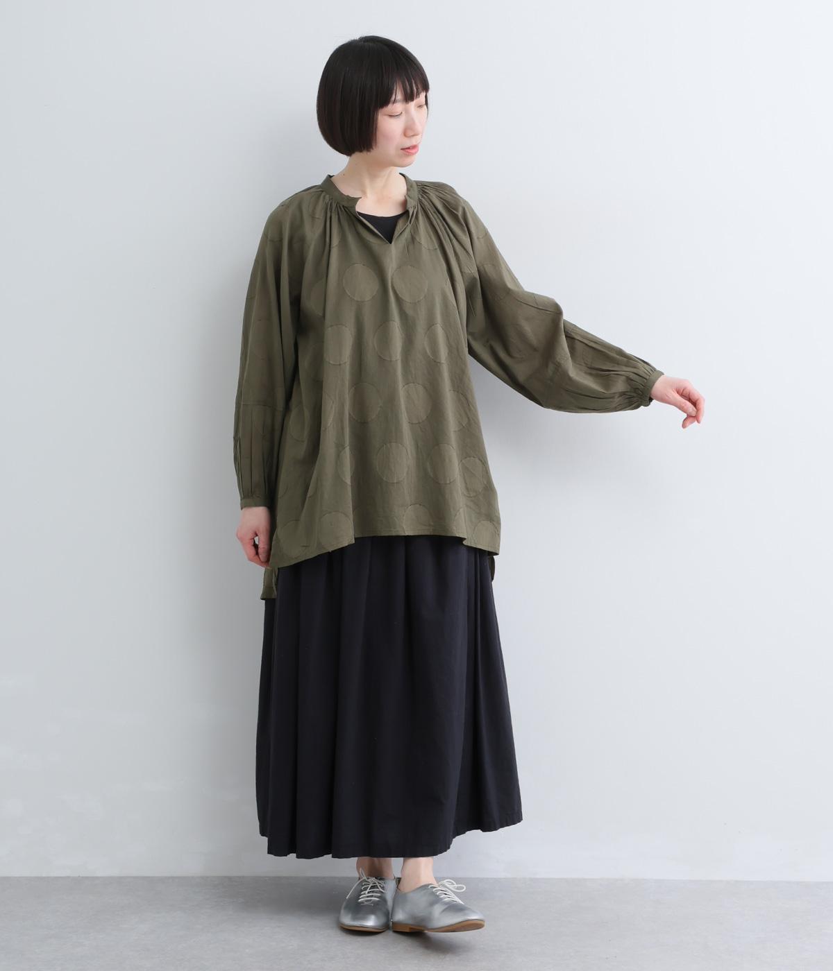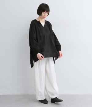 無地感覚で着こなしやすくも表情をつけてくれるドットジャカードのブラウス。空気を含んだようにふわりと軽やかなシルエットは、スキッパーカラーで抜け感をプラス。袖口は部分的にゴムを入れているのでたくし上げもおすすめ。