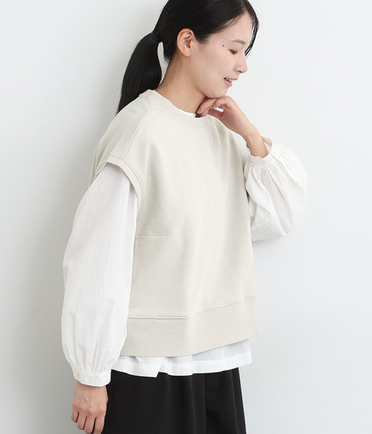 ゆったりとしたリラクシーなボックスシルエット。襟元と袖口、裾をリブで切り替えてアクセントを加えています。スカート、パンツともに合わせやすくいつものスタイリングを新鮮に仕上げてくれる一枚です。