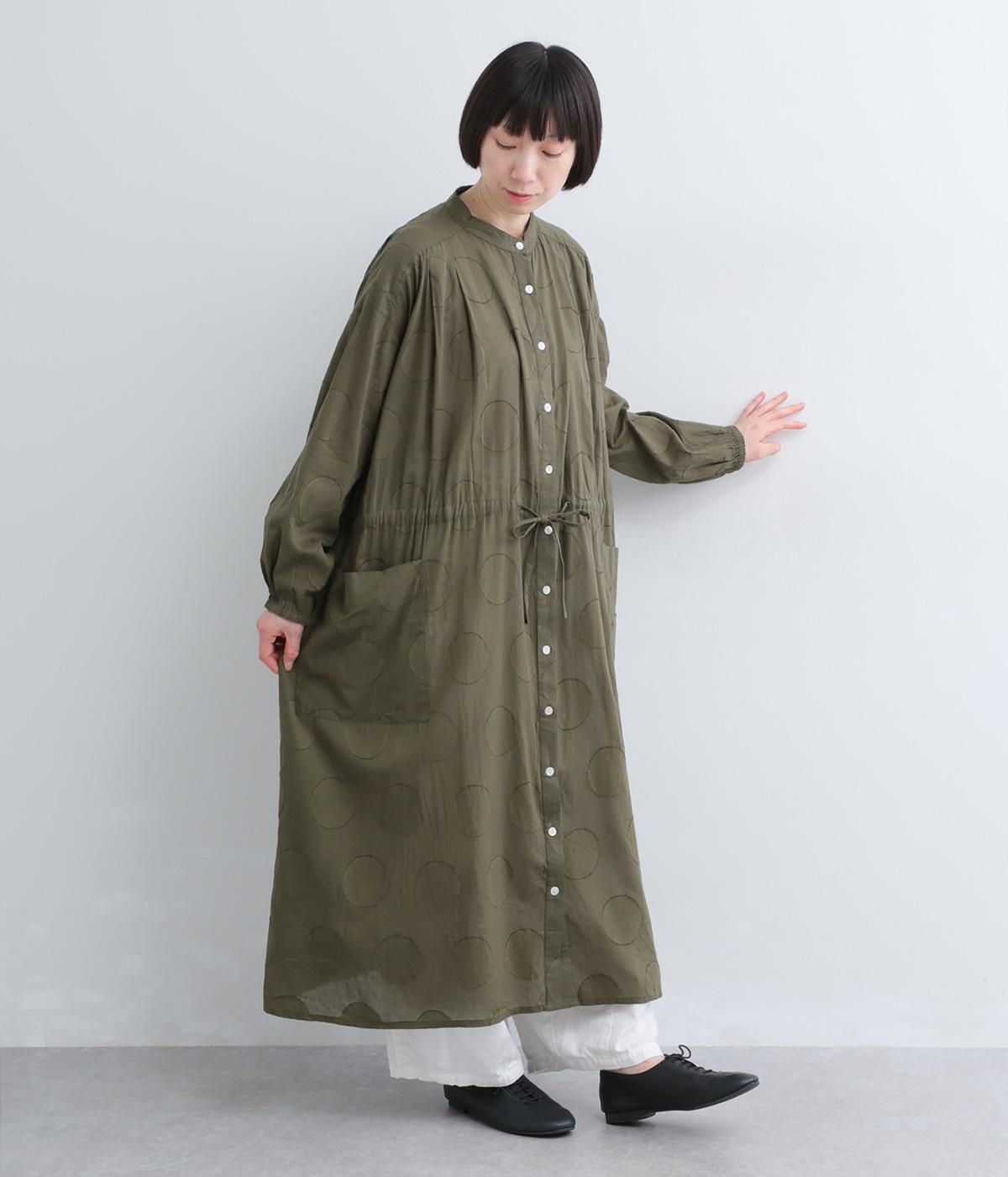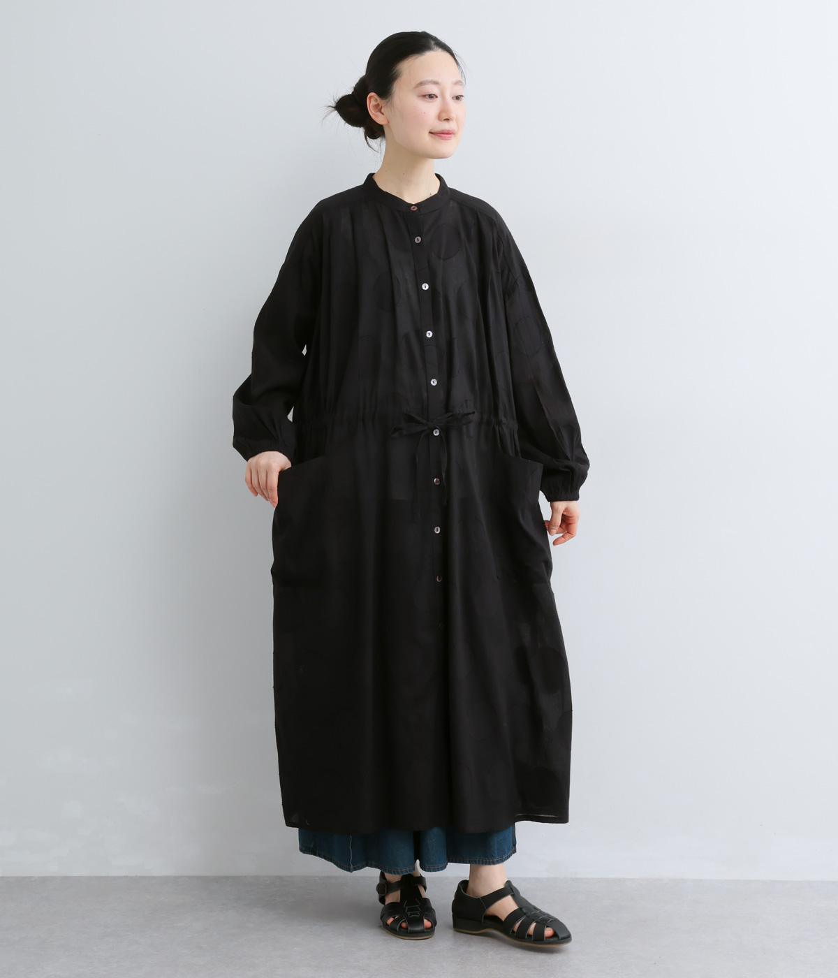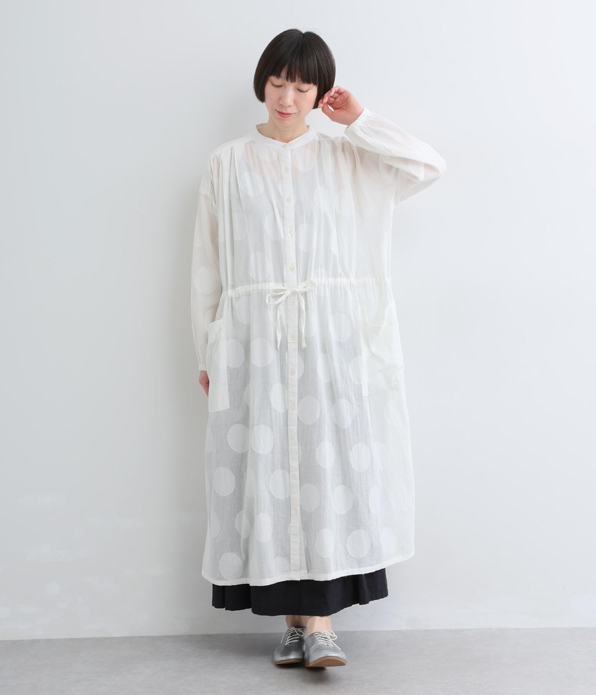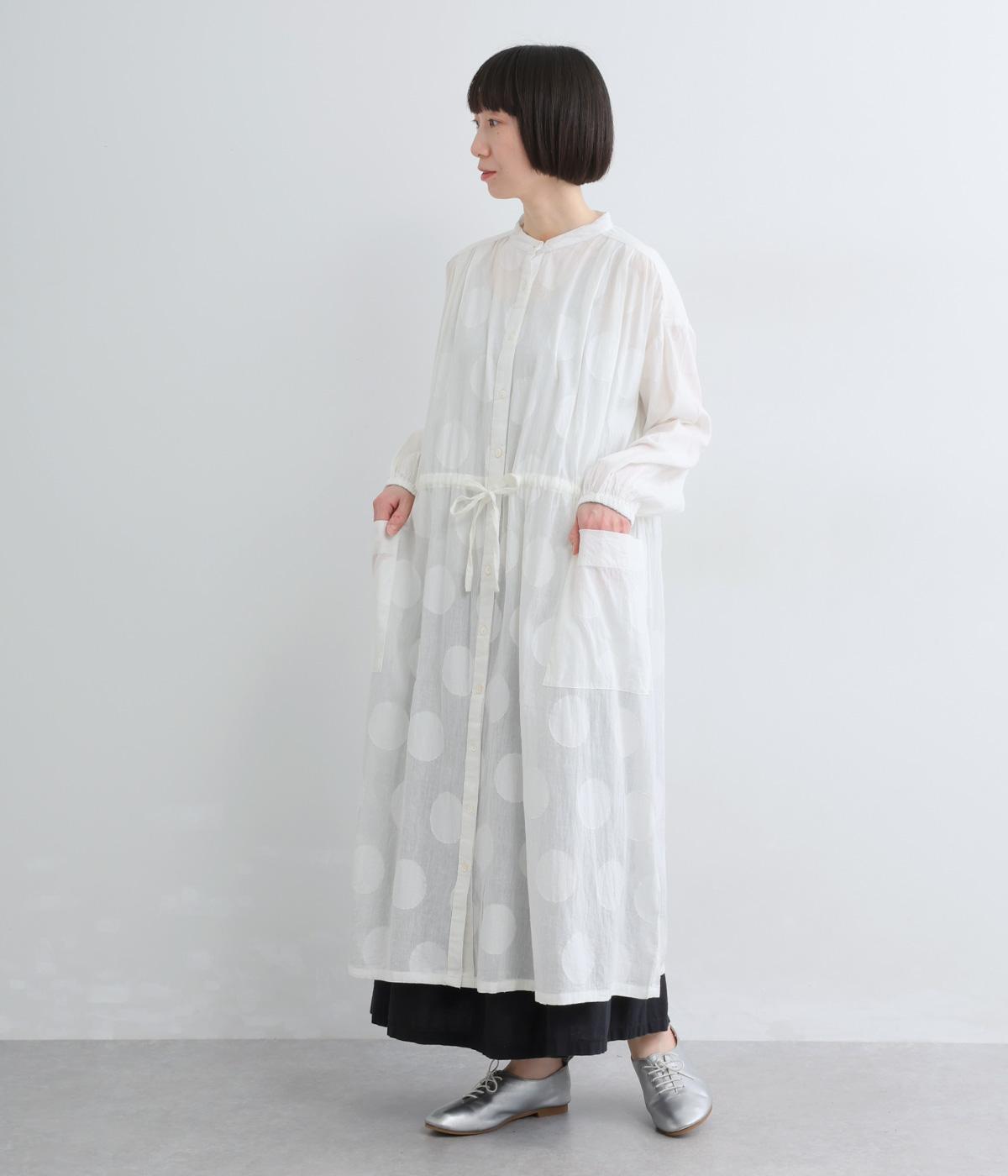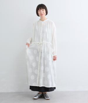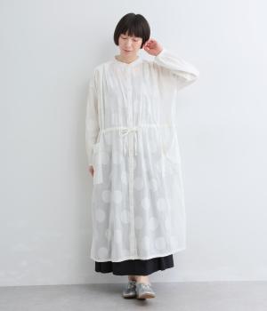 タックやギャザーでゆとりをもたせたワンピースは、透け感のあるドットジャカード生地で奥行きのある仕上がりに。無地感覚で着やすくも表情豊かで、ボトム合わせやレイヤードの羽織りスタイルがたのしめます。ウエスト紐でしぼって変化をつけても◎。