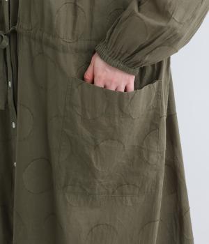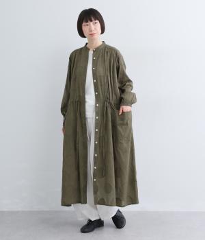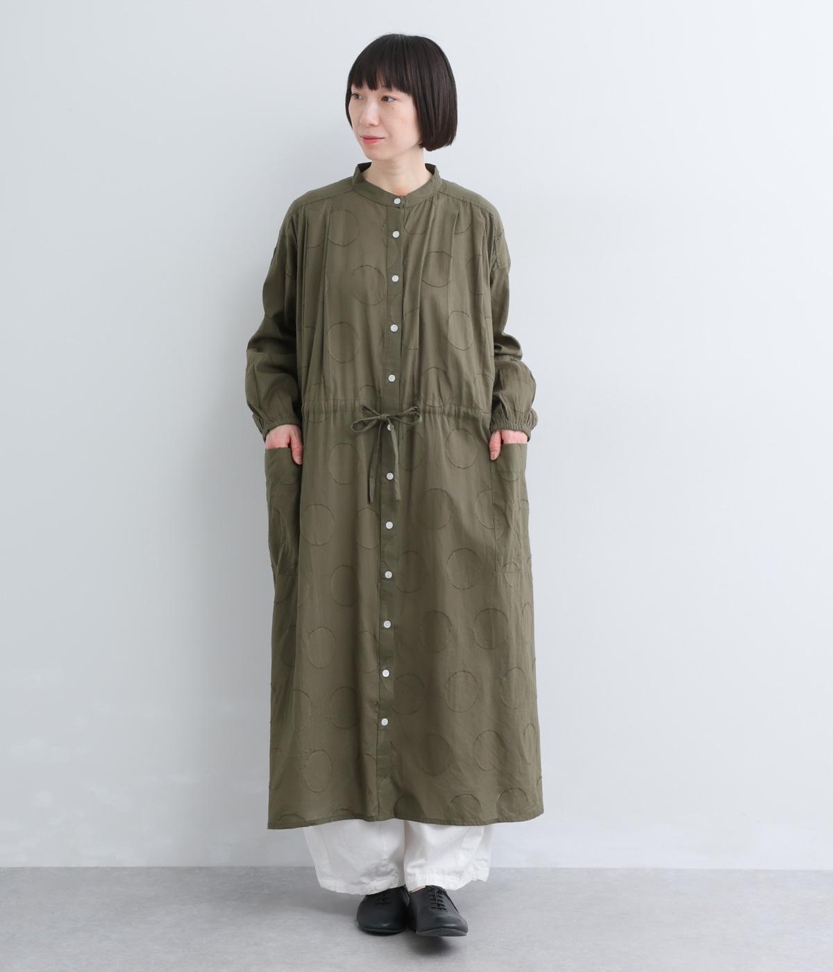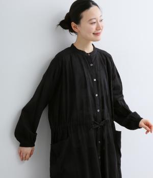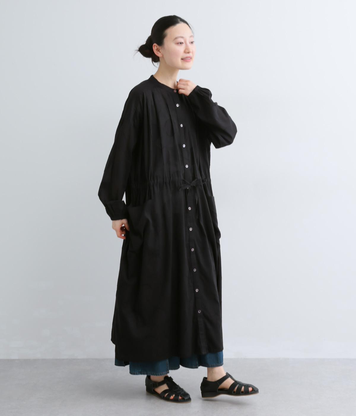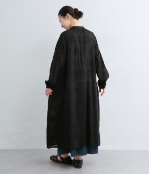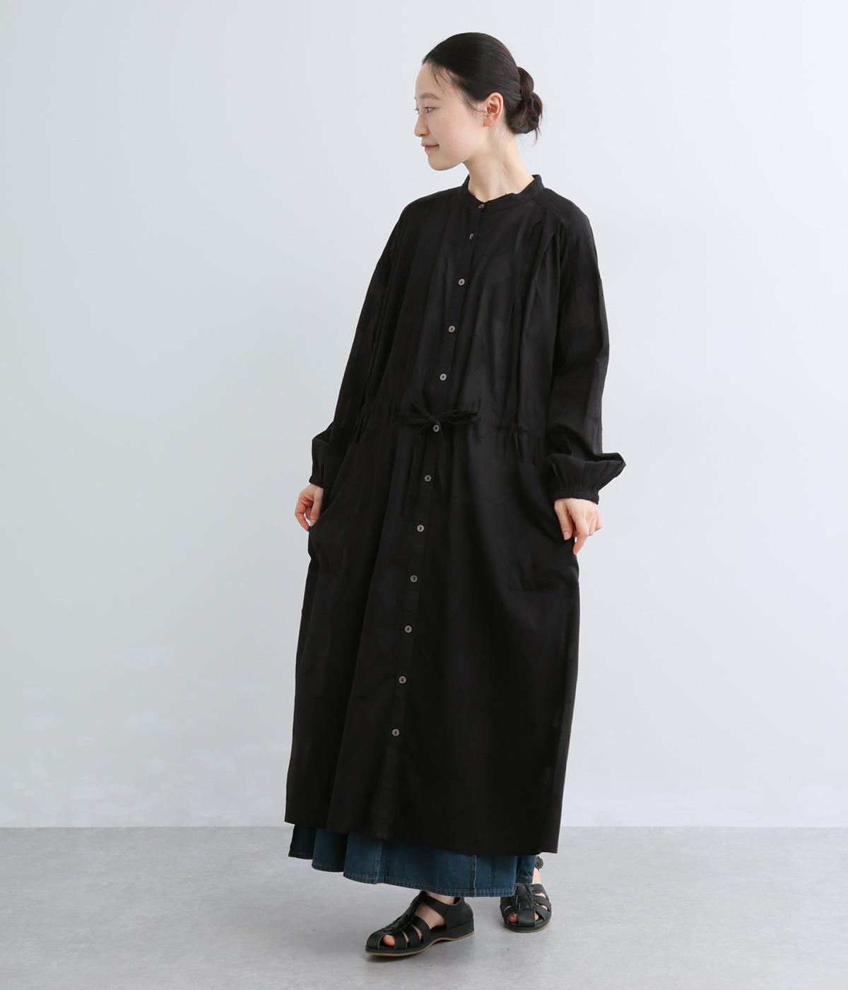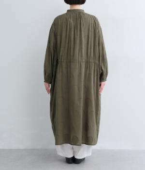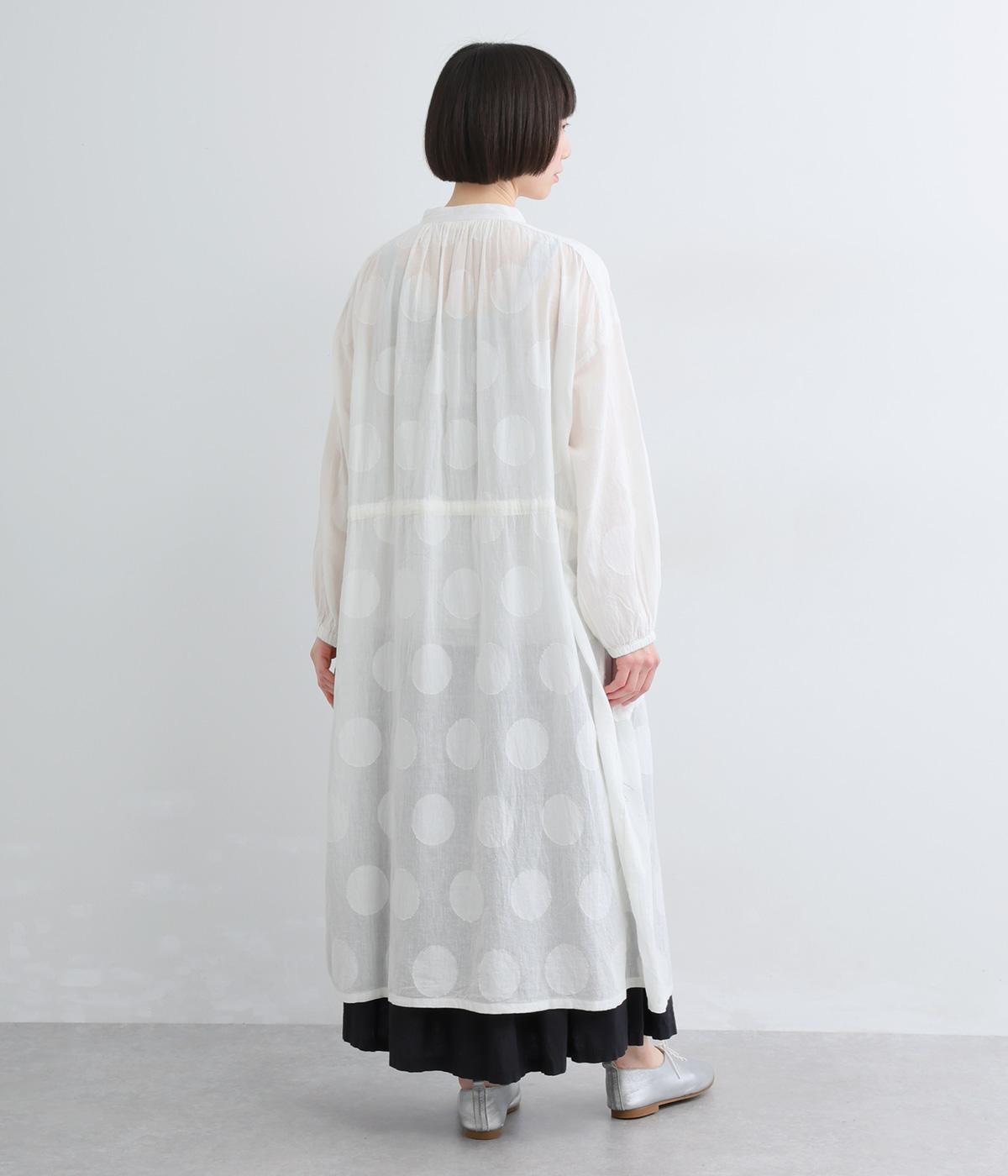 タックやギャザーでゆとりをもたせたワンピースは、透け感のあるドットジャカード生地で奥行きのある仕上がりに。無地感覚で着やすくも表情豊かで、ボトム合わせやレイヤードの羽織りスタイルがたのしめます。ウエスト紐でしぼって変化をつけても◎。