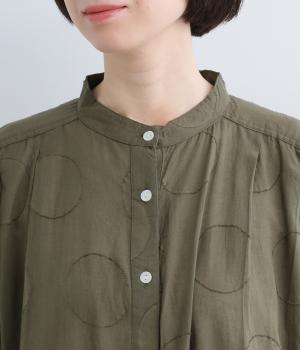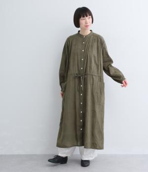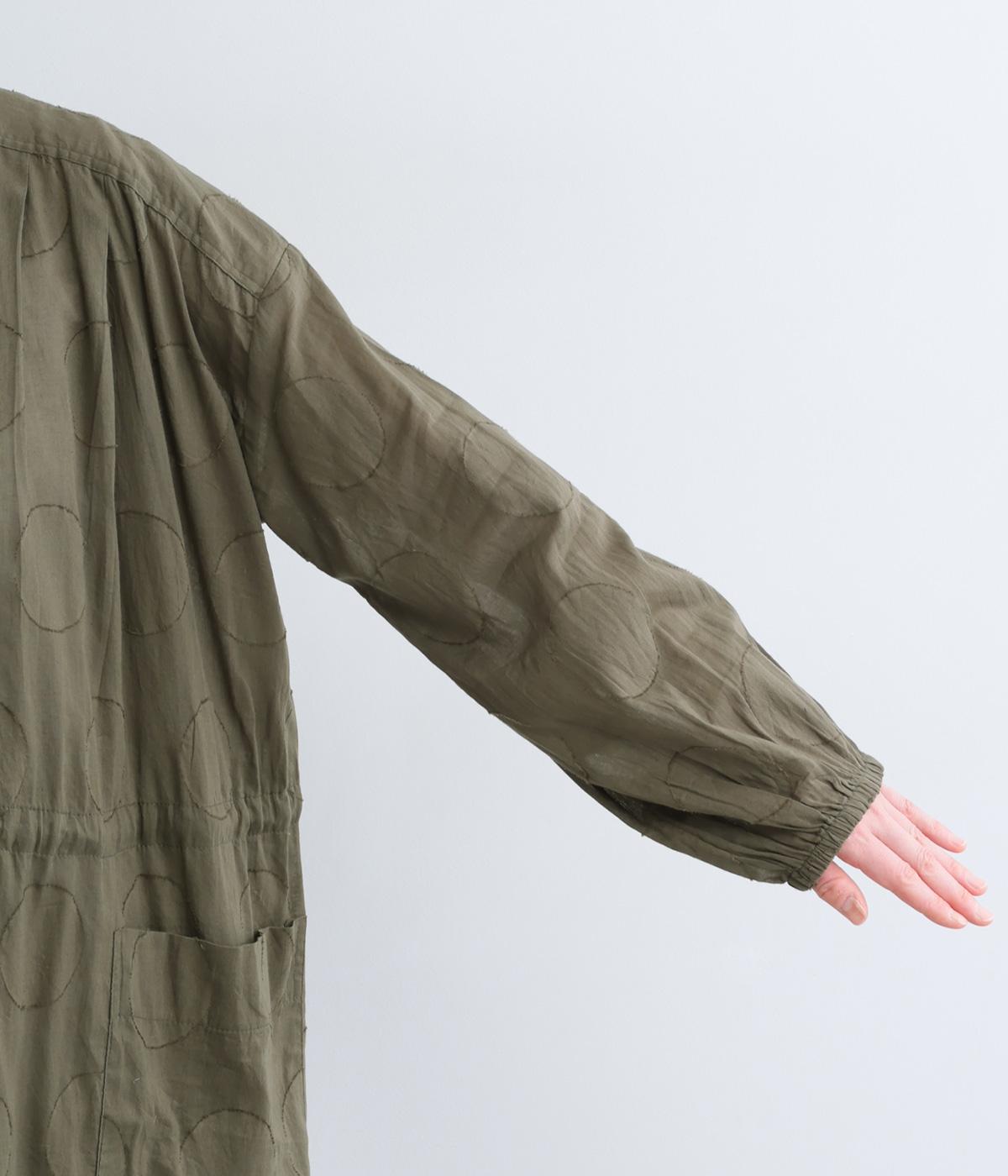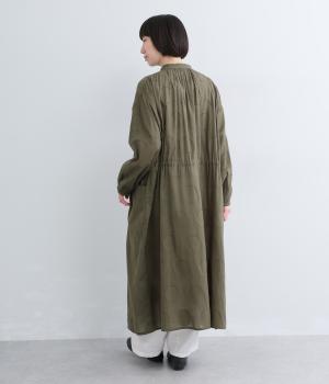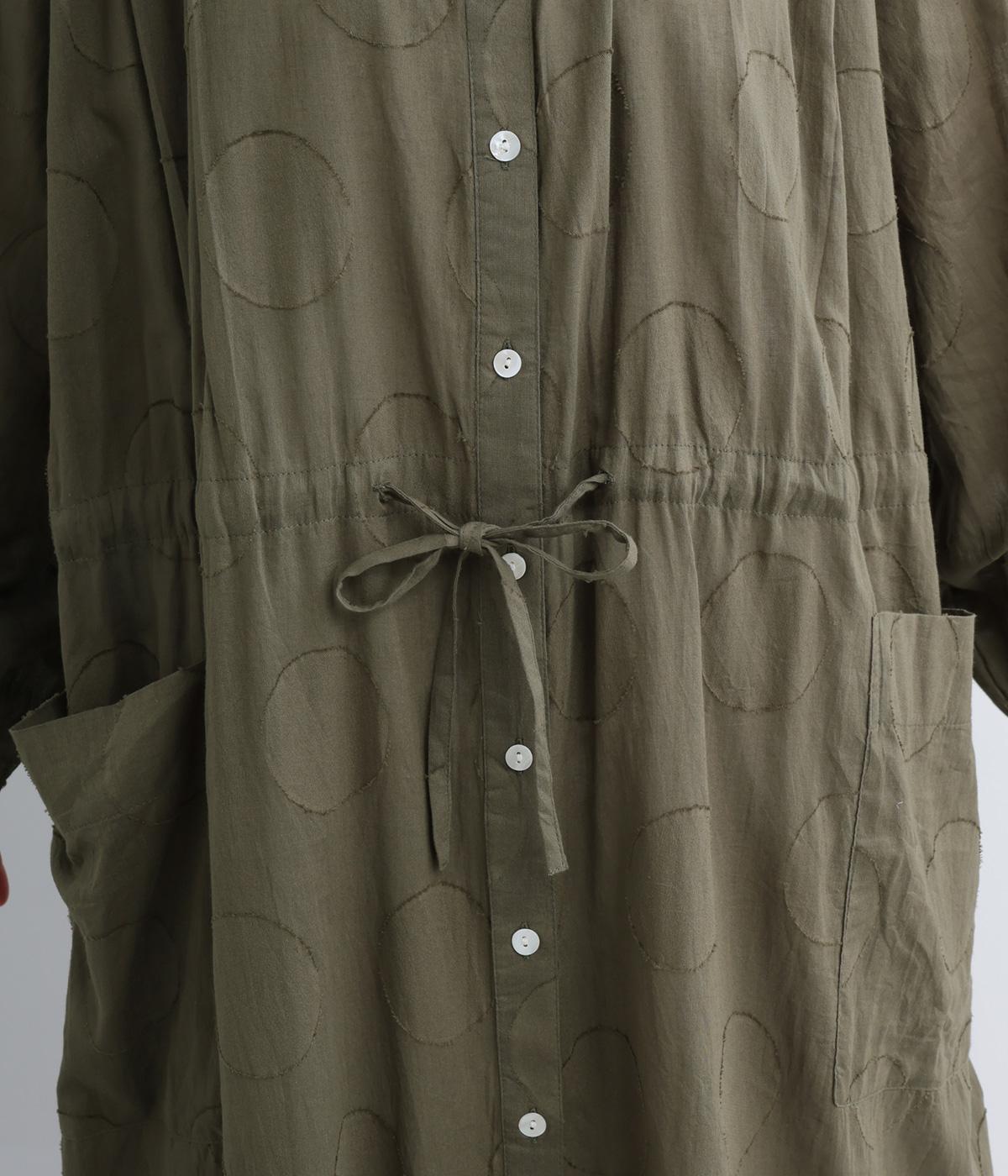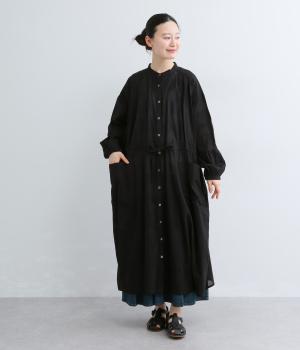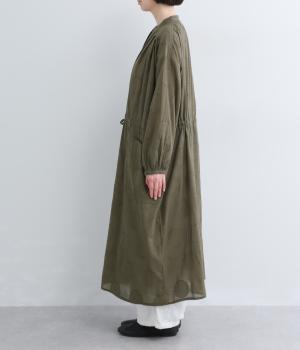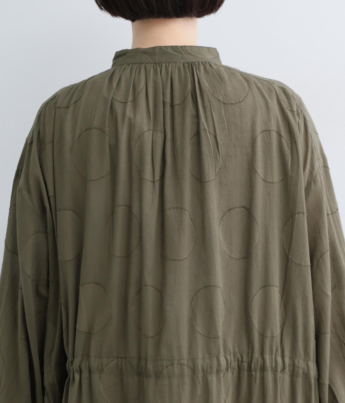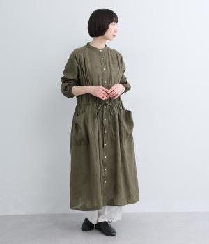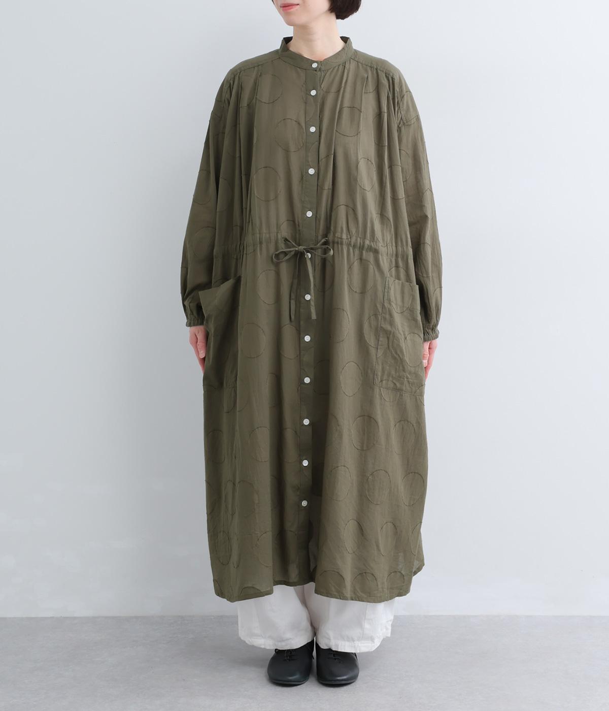 タックやギャザーでゆとりをもたせたワンピースは、透け感のあるドットジャカード生地で奥行きのある仕上がりに。無地感覚で着やすくも表情豊かで、ボトム合わせやレイヤードの羽織りスタイルがたのしめます。ウエスト紐でしぼって変化をつけても◎。