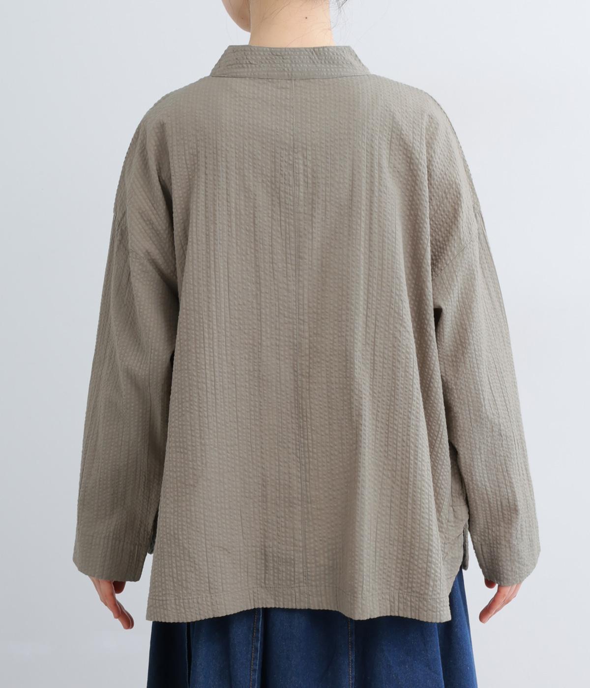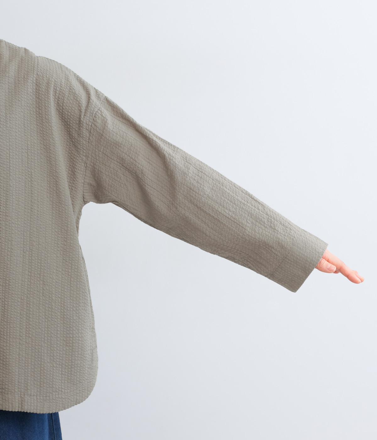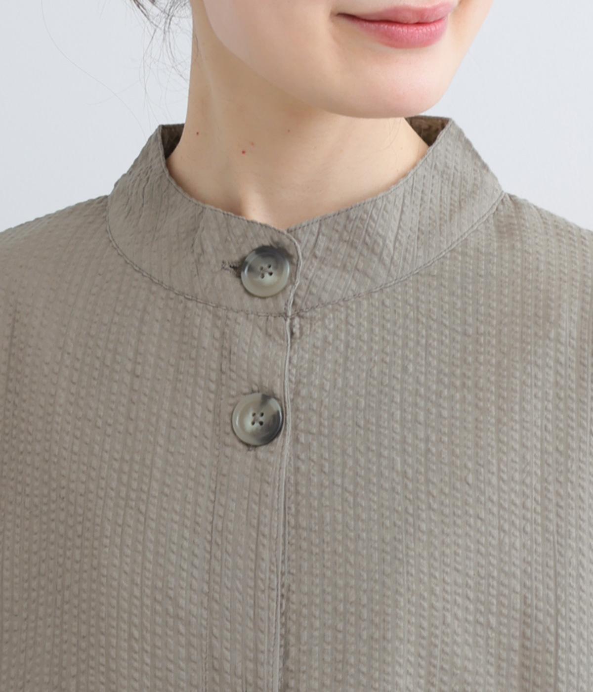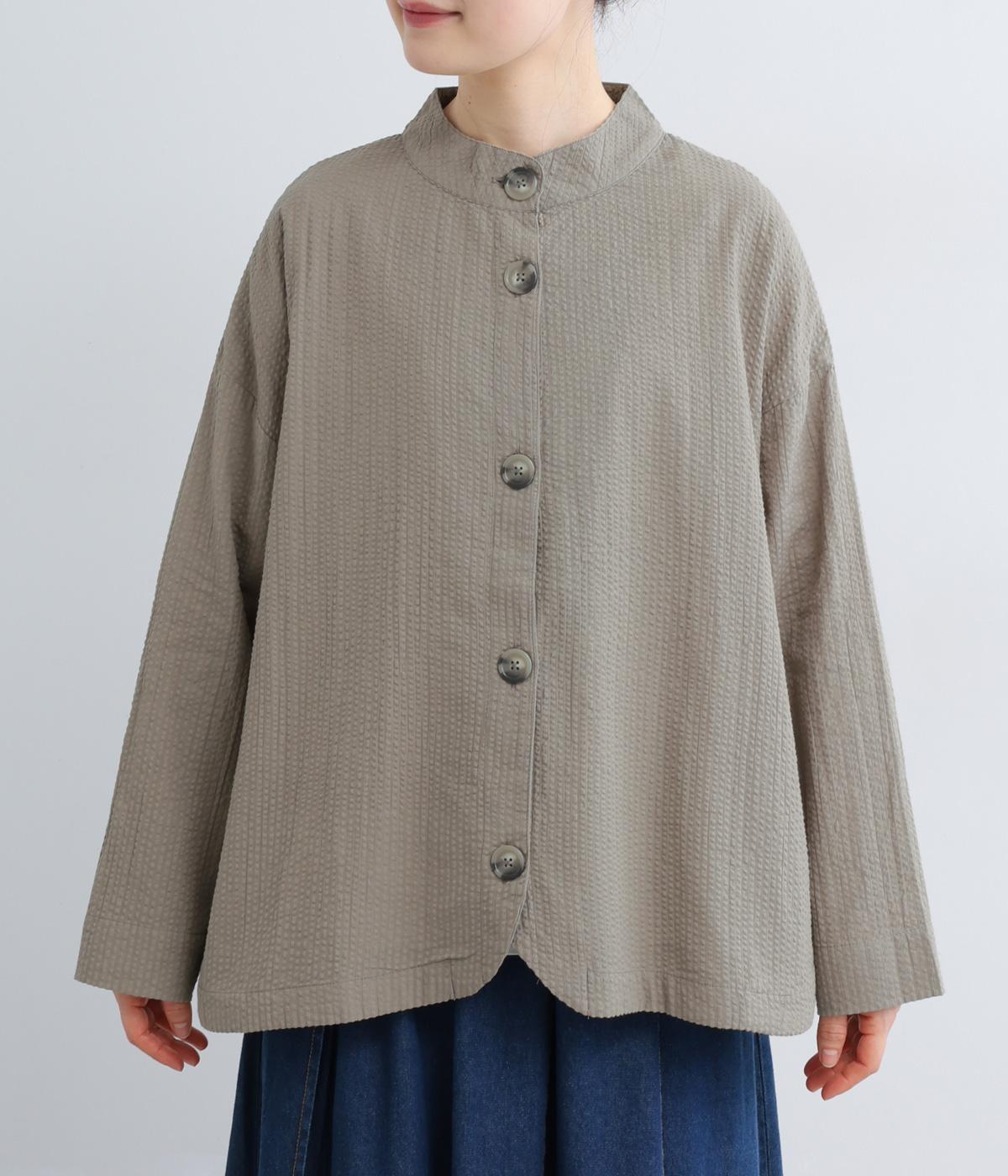 無地ながらも表情豊かなサッカー生地を活かし、ゆったり涼しく羽織れるジャケットを仕立てました。ラウンドさせたヘムラインは、ボタンを留めても、ラフにあけてもさまになります。ちょこんと立ち上がったスタンドカラーで顔まわりにポイントを。