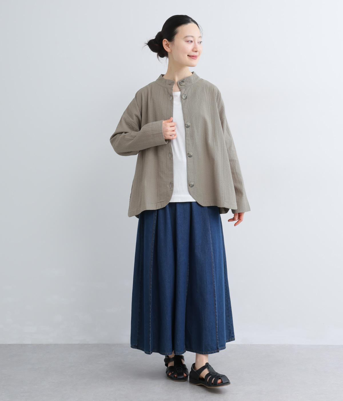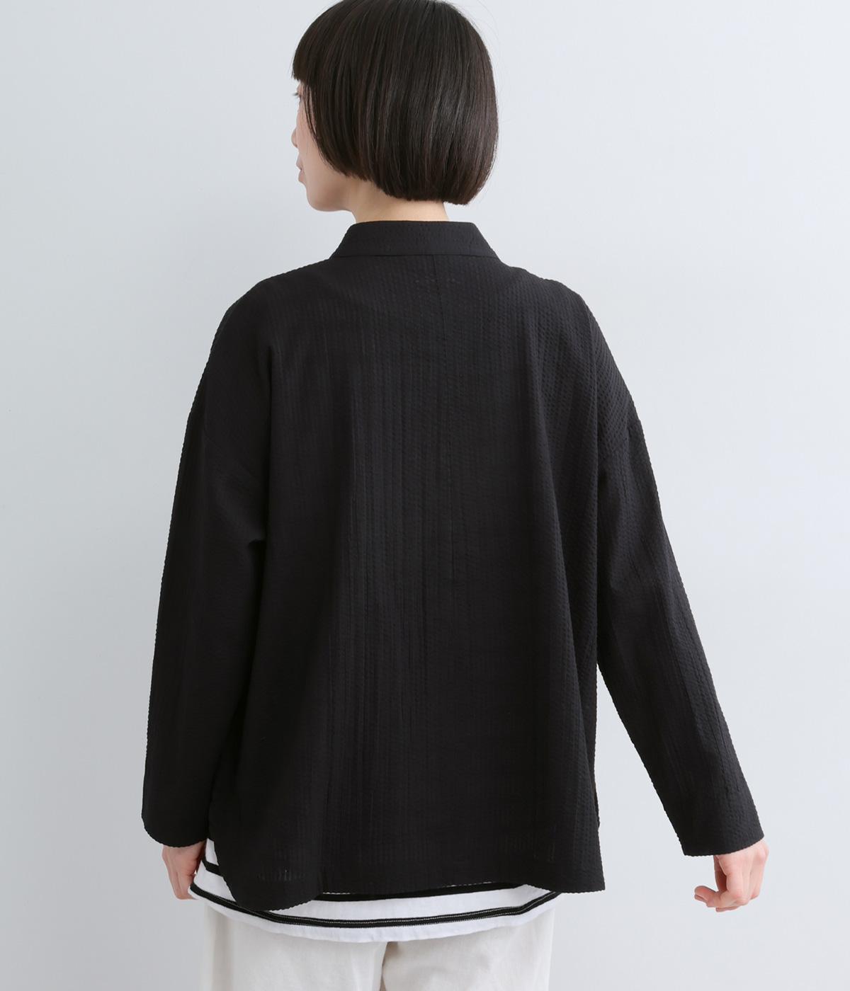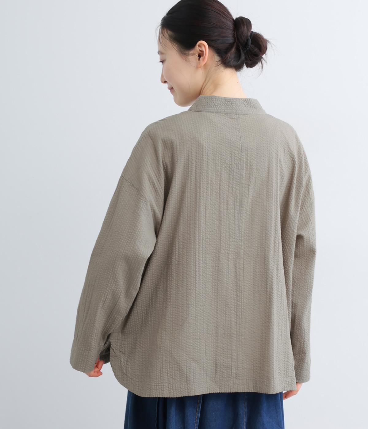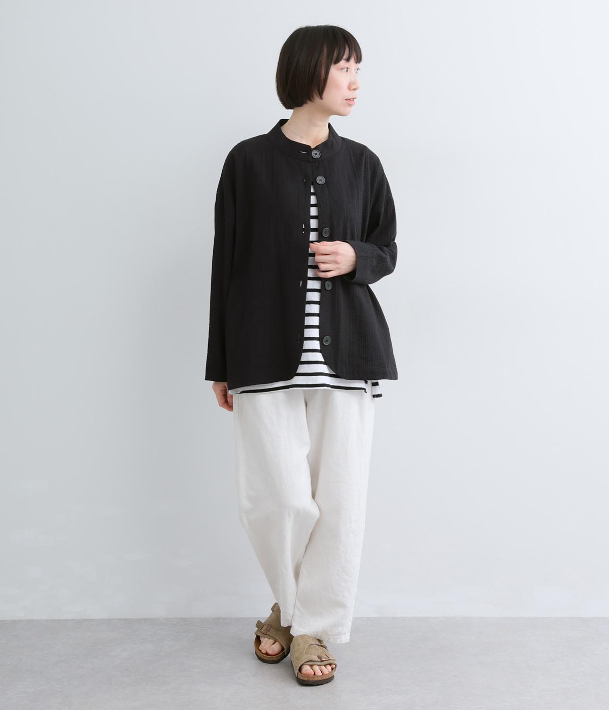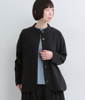 無地ながらも表情豊かなサッカー生地を活かし、ゆったり涼しく羽織れるジャケットを仕立てました。ラウンドさせたヘムラインは、ボタンを留めても、ラフにあけてもさまになります。ちょこんと立ち上がったスタンドカラーで顔まわりにポイントを。